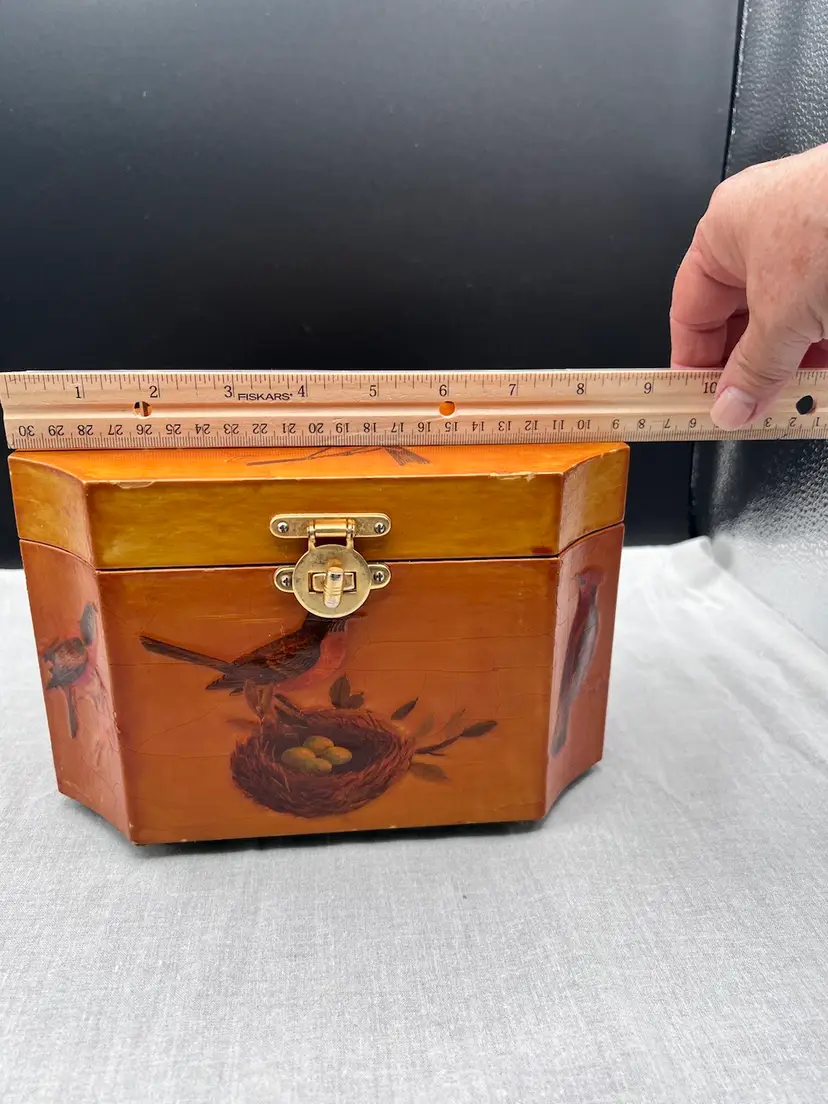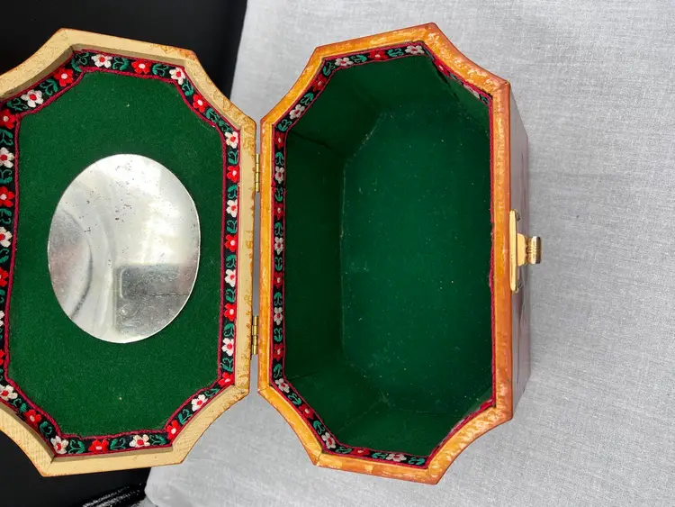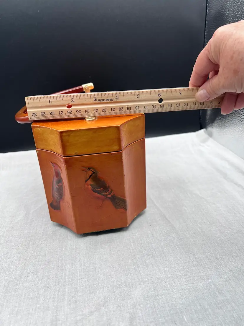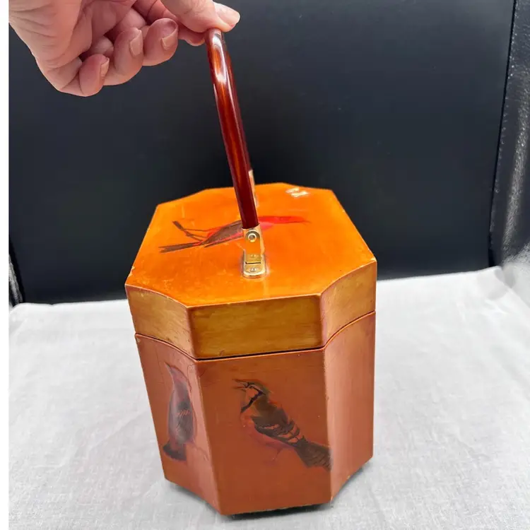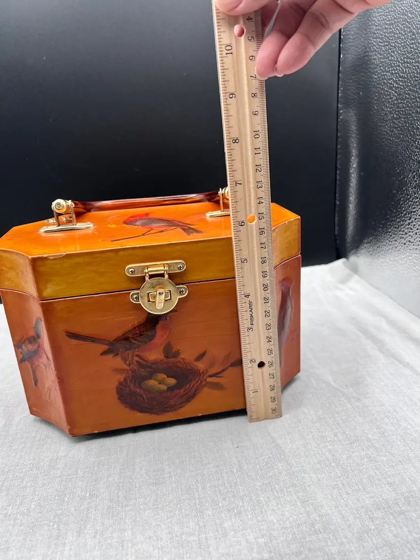 Beautiful Vintage Wooden Purse with Repose/Raised Birds on all Sides Gold Hardware and a brown handle (could be Bakelite) Green felt lining and on bottom. Bottom has brass nails for feet, interior also has red, green and black floral rick rack trim inside. Mirror is intact as well In very good condition, a couple places the wood has been scraped Unmarked 9" x 5" x 6" high