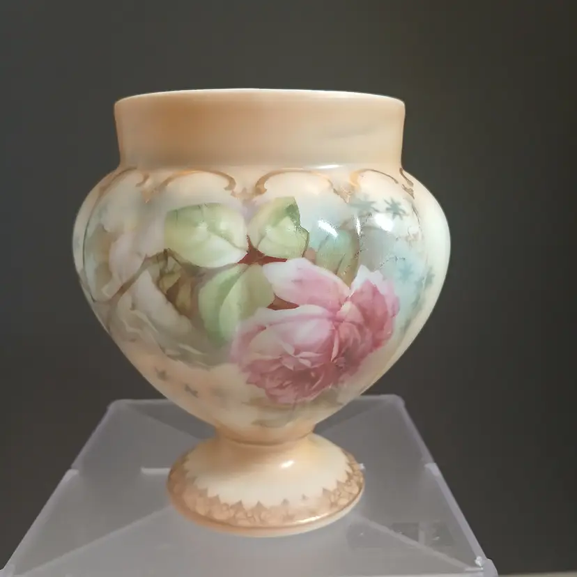 This lovely object in light tans and creams with hand-painted gold details and pretty red-pink roses is unmarked and does not immediately identify itself as to what it was originally. It stands 5.5" H x 4" dia at mouth. Are the roses hand painted or early transferware? Is it missing a lid? is it Milk Glass or porcelain? Who knows? But for $6 you can call it whatever you want to. :) Create your own story!
