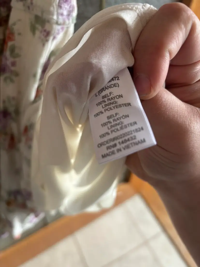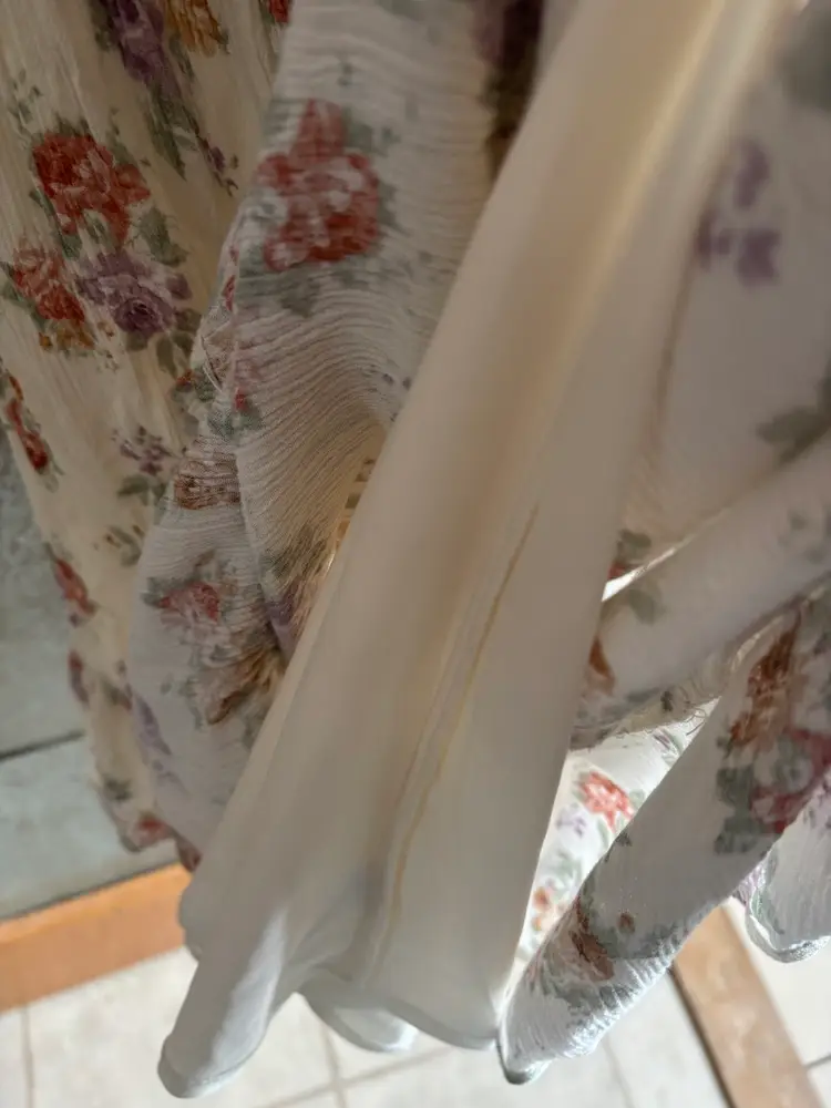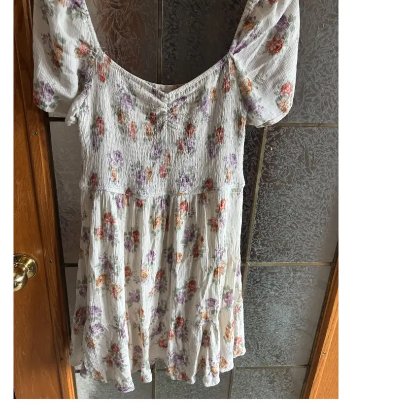 Charming floral print dress with puff sleeves. Features a mix of purple and orange flowers on a white background. Lined. 16” - 21” pit to pit, 29” length. Lined.