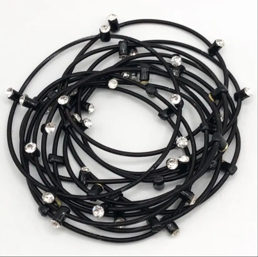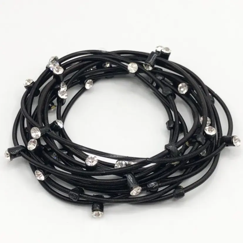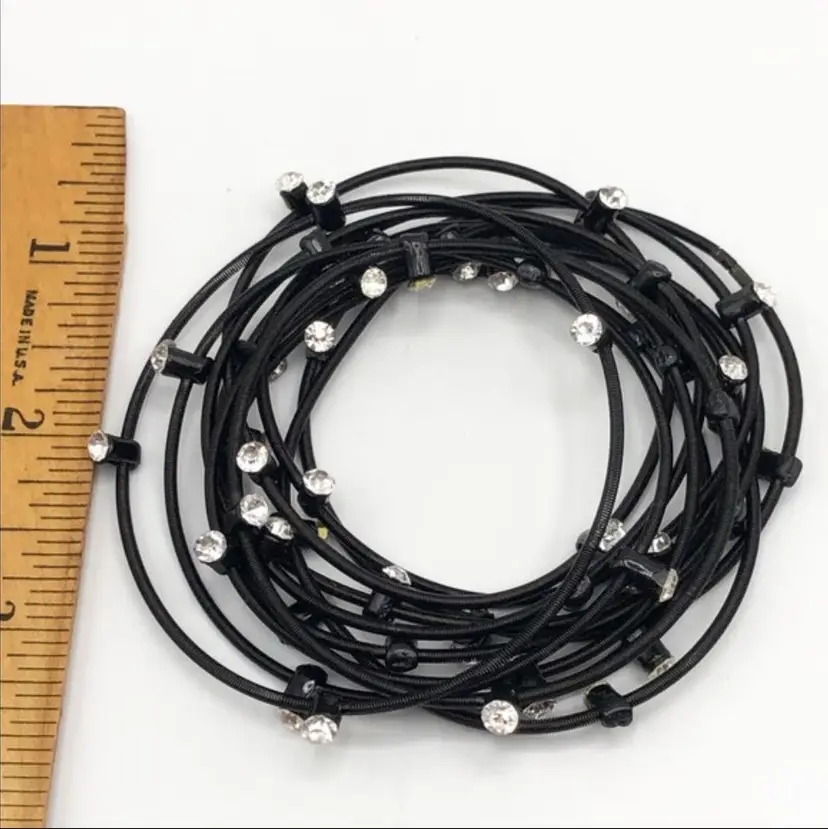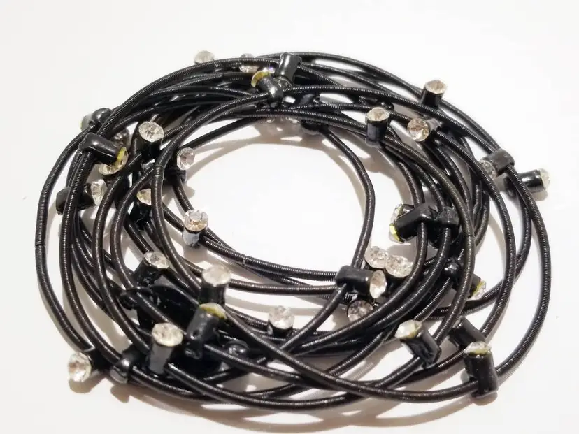 12 strands of actual piano wire make up this set. You can wear several sets at once. They are made up of actual piano wires, these are delicate so you need to put a few on at a time. They do not need to be polished and try to not get them wet. These are black wire with black bezels and clear stones .
