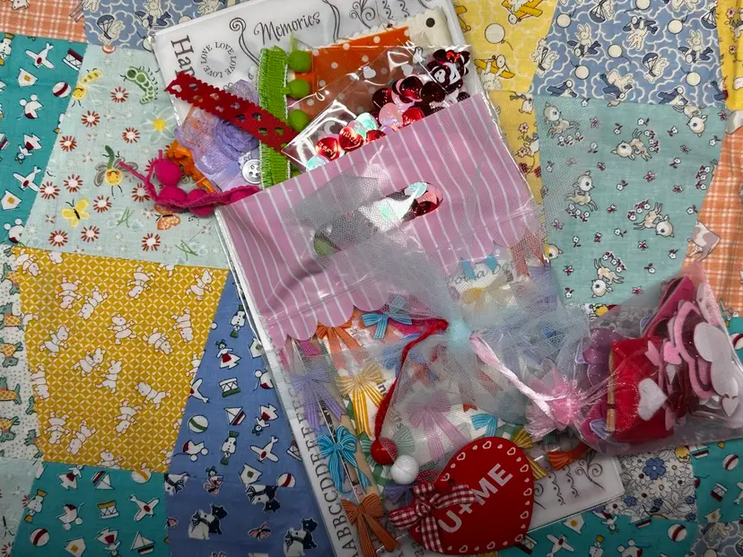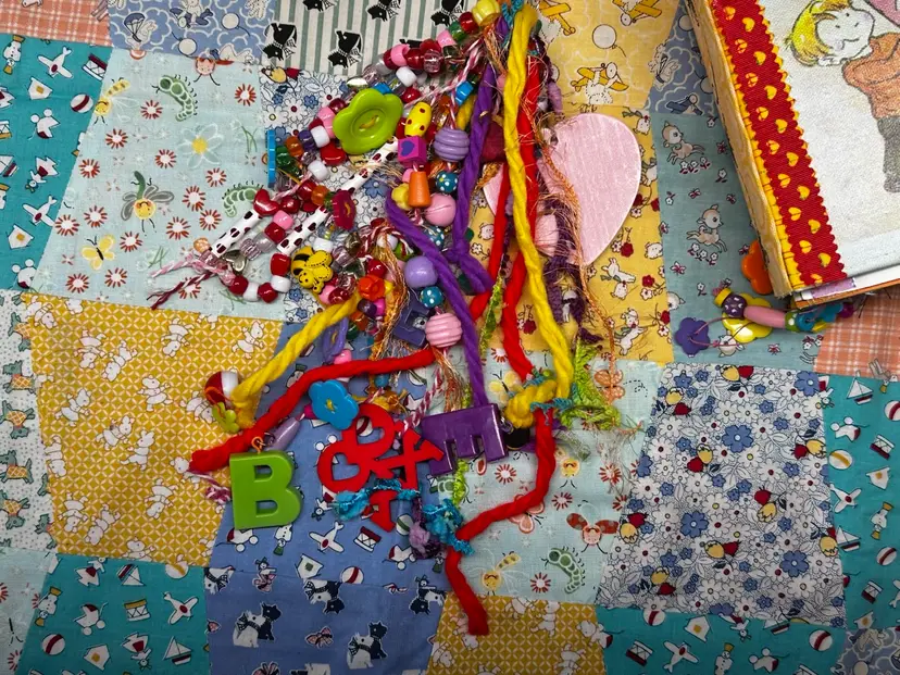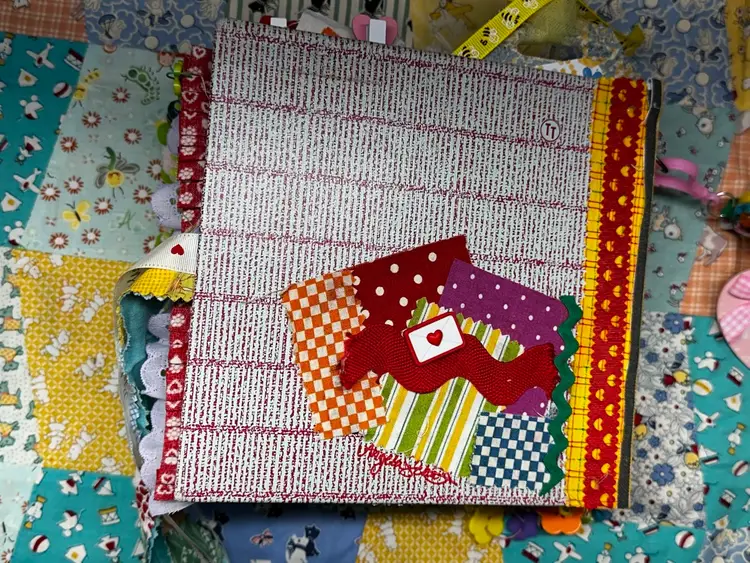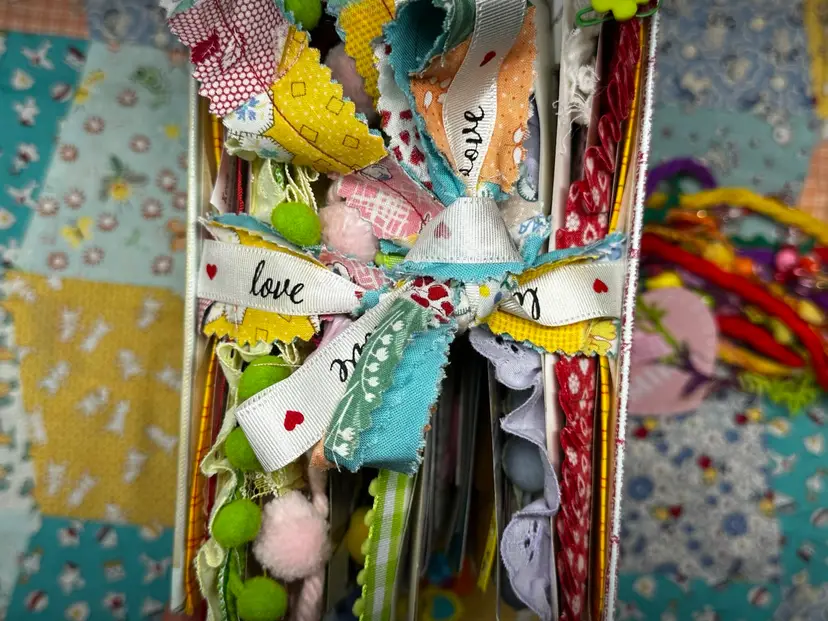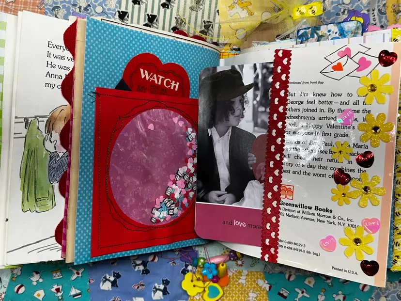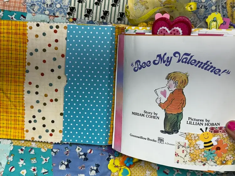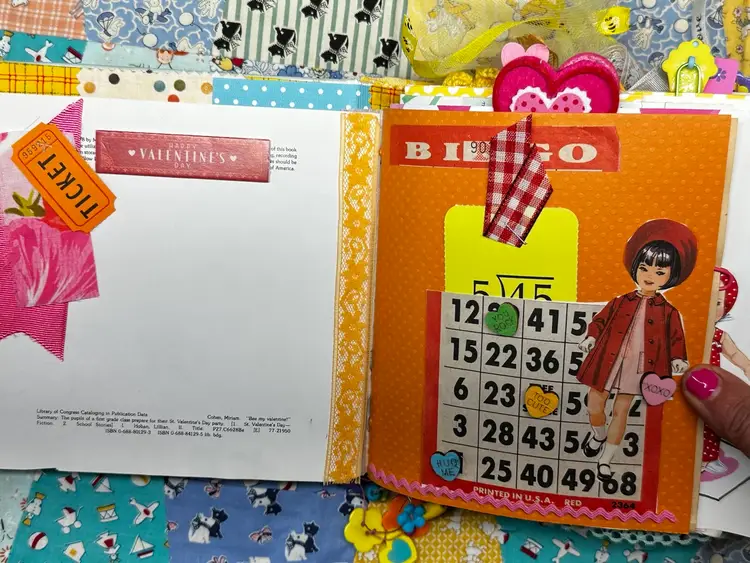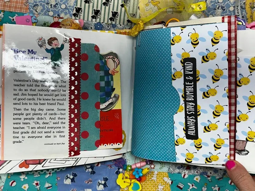 • Vintage children’s book cover base • Fully redesigned interior with layered pages • Handmade ephemera and embellishments • Interactive pockets and tuck spots • Lace trims and textile details • Coordinating bee and Valentine theme • Handmade tassel journal charm