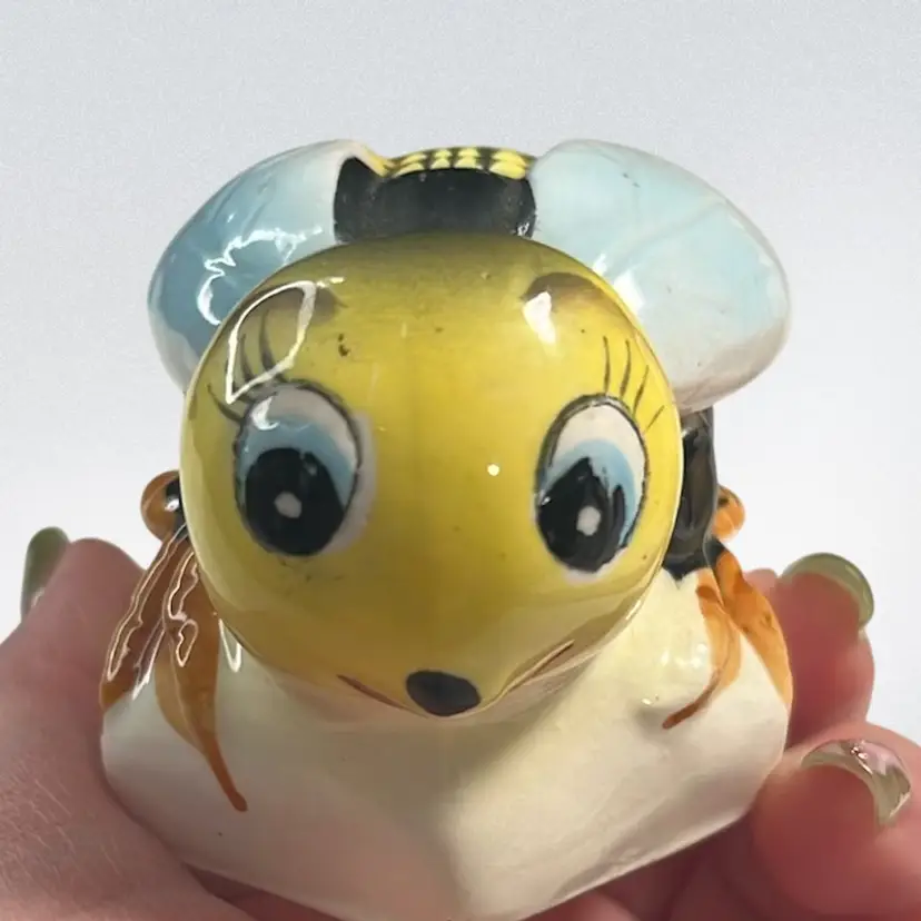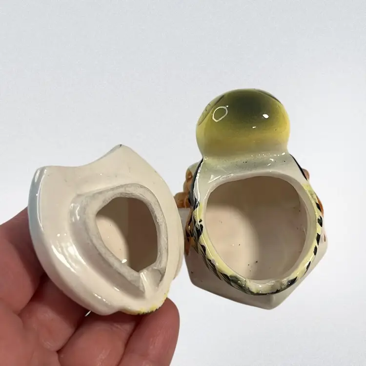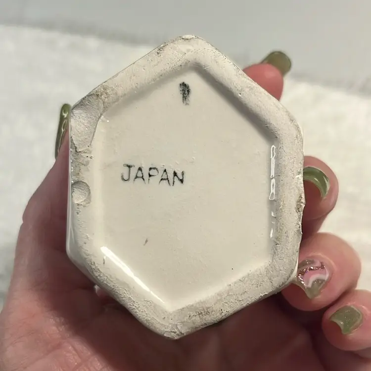 Definitely does show some age and wear. Some minor flea bites and tiny chip on bottom. Marked Japan. Approx: 2.75”