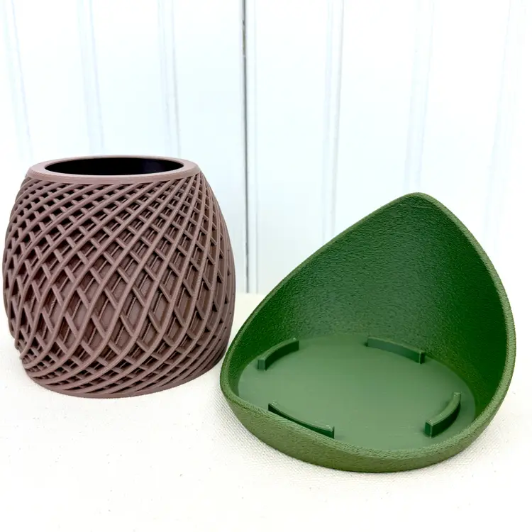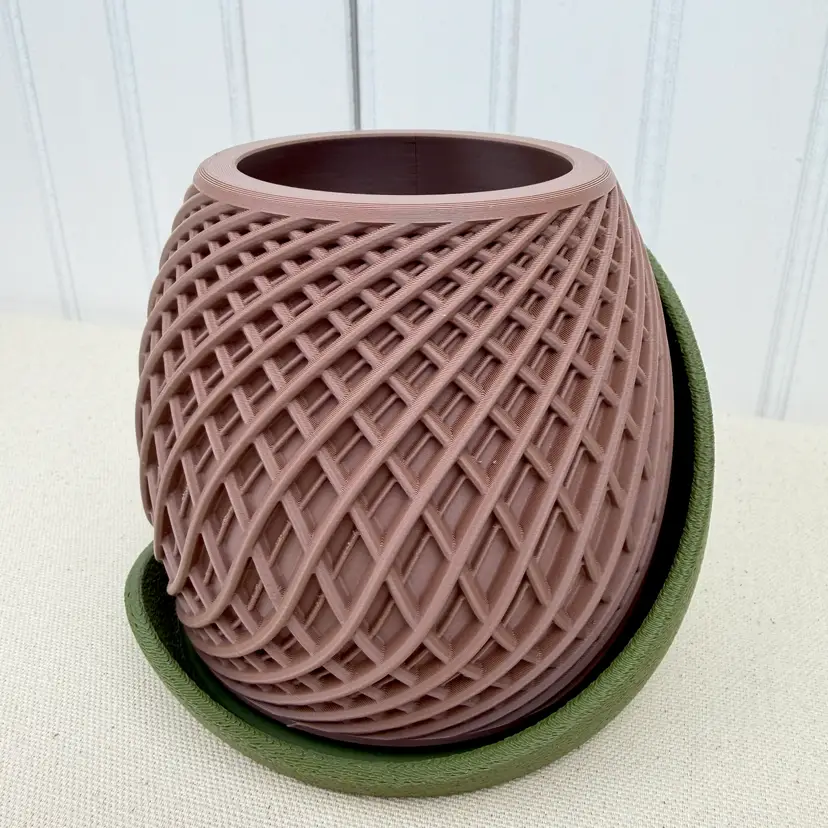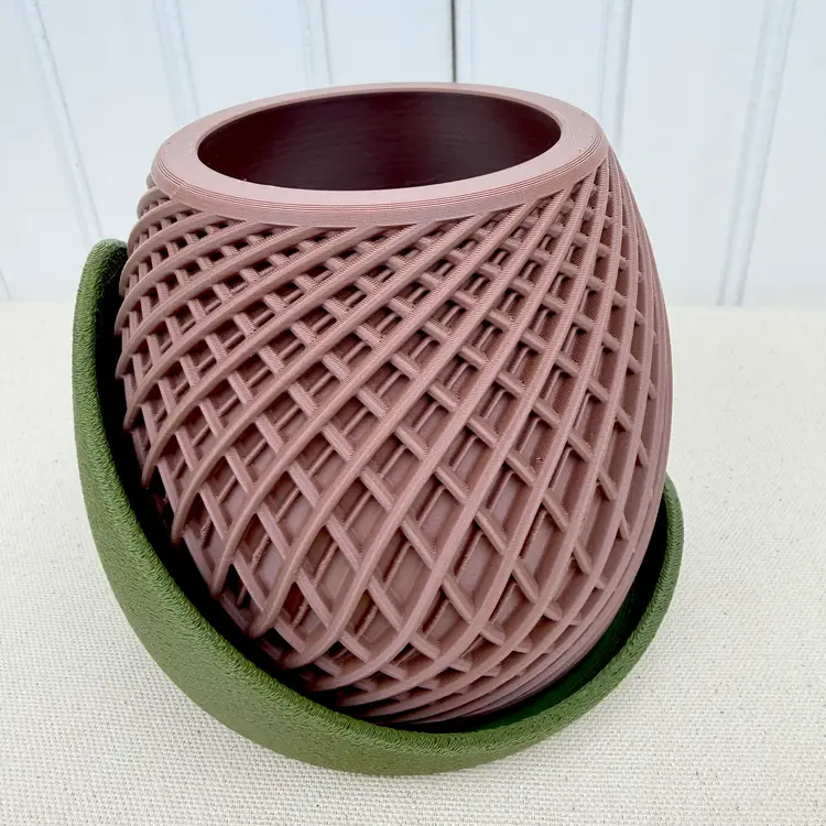 This modern 3D printed planter with its striking geometric texture to creates a contemporary accent for your plants. The matte colored pot features a diamond lattice pattern that gives depth and movement to the design, paired with a contrasting colored tray for a stylish two-tone finish.