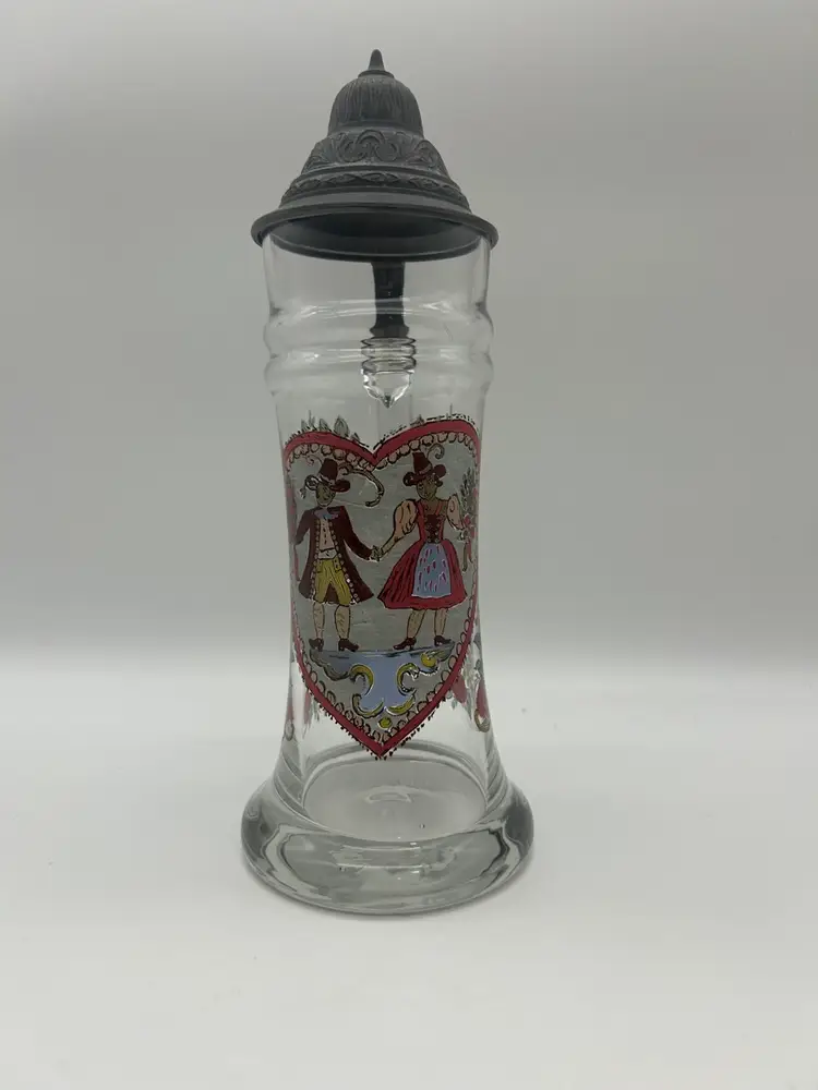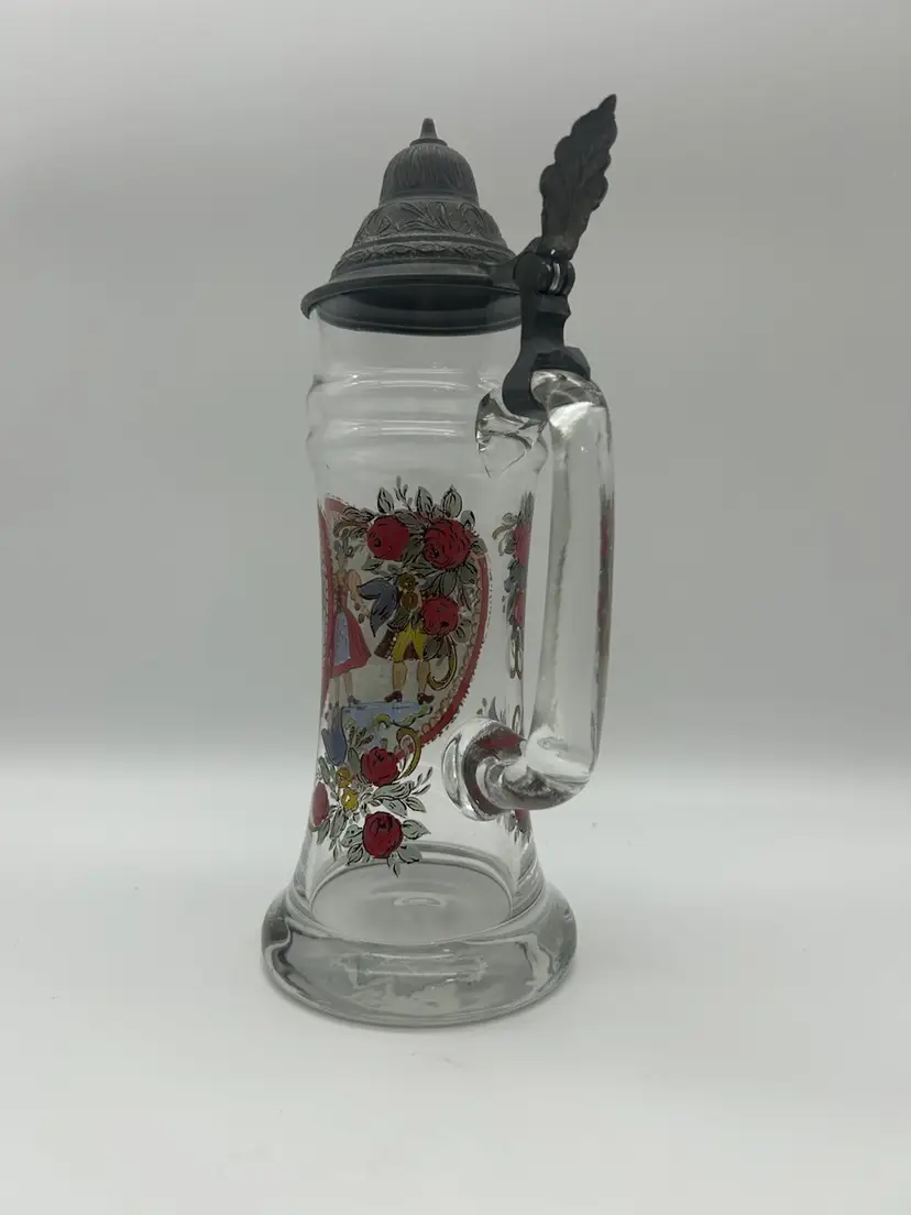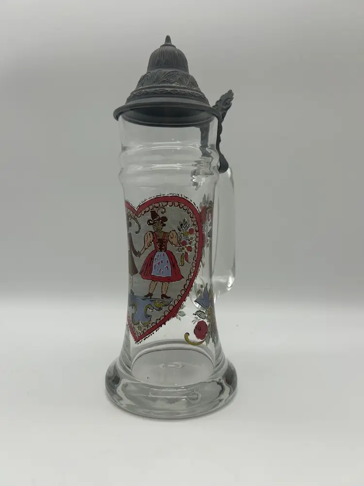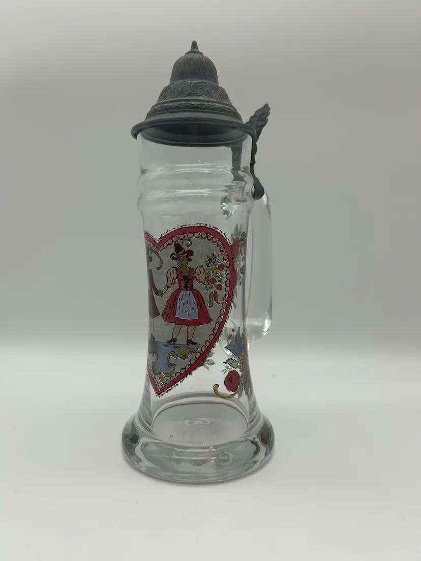 Beautiful hand painted glass beer stien with pewter lid is in mint condition. I believe it as been hand blown but not 100% sure. It is approximately 10 1/2” tall and 3 3/4” wide at the base.