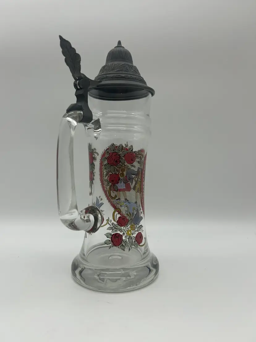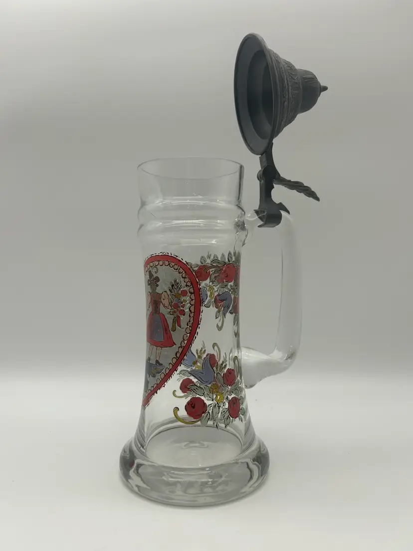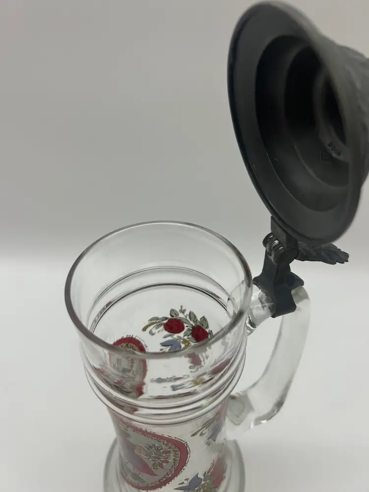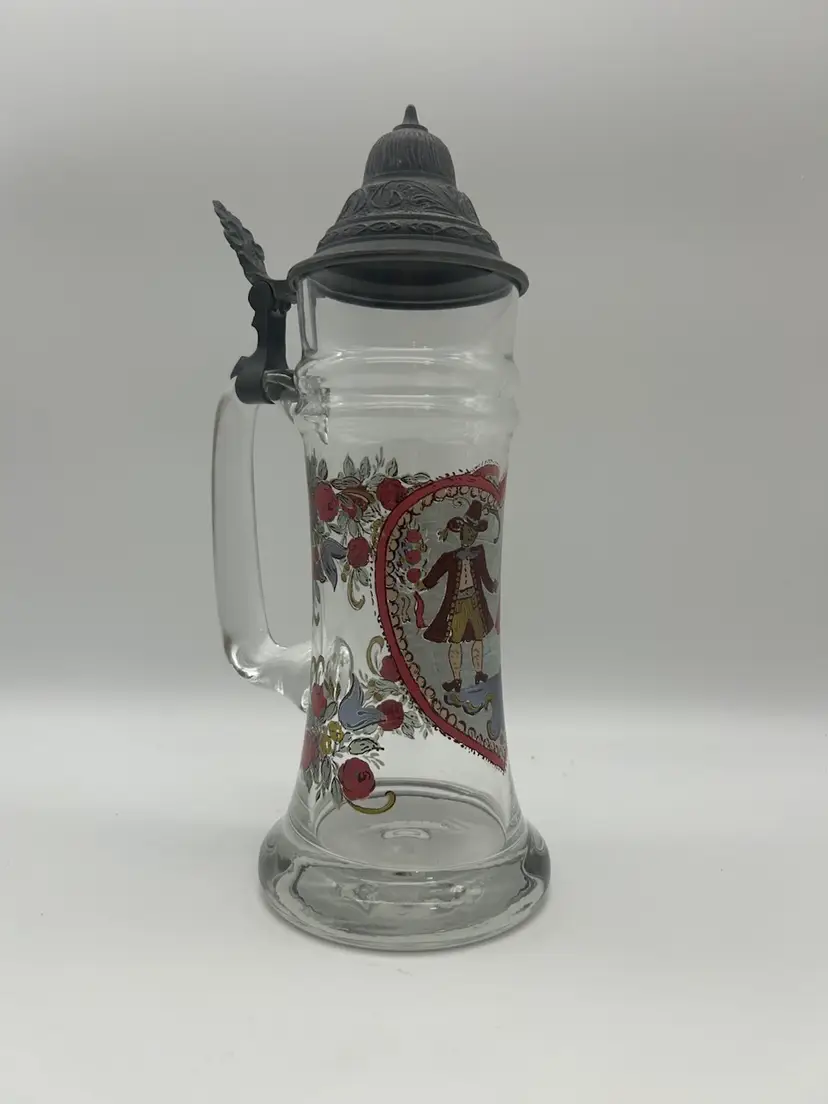 Beautiful hand painted glass beer stien with pewter lid is in mint condition. I believe it as been hand blown but not 100% sure. It is approximately 10 1/2” tall and 3 3/4” wide at the base.