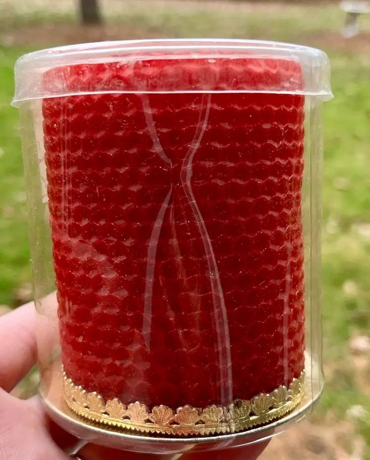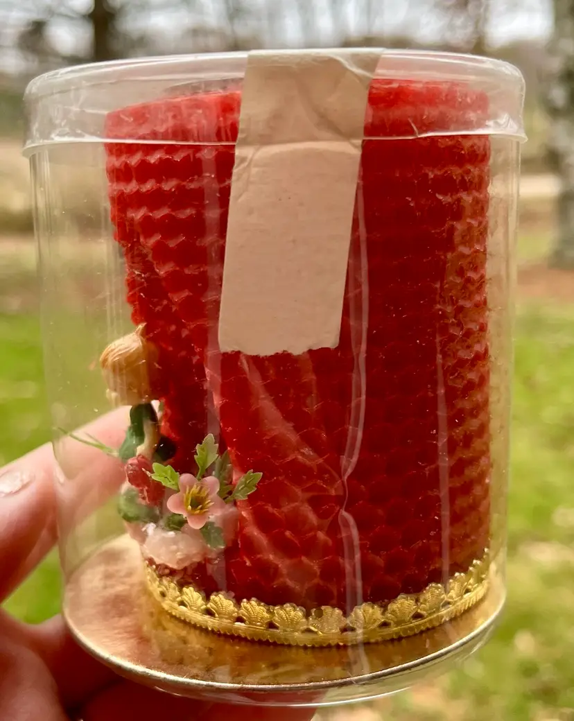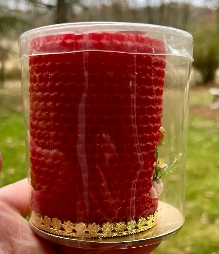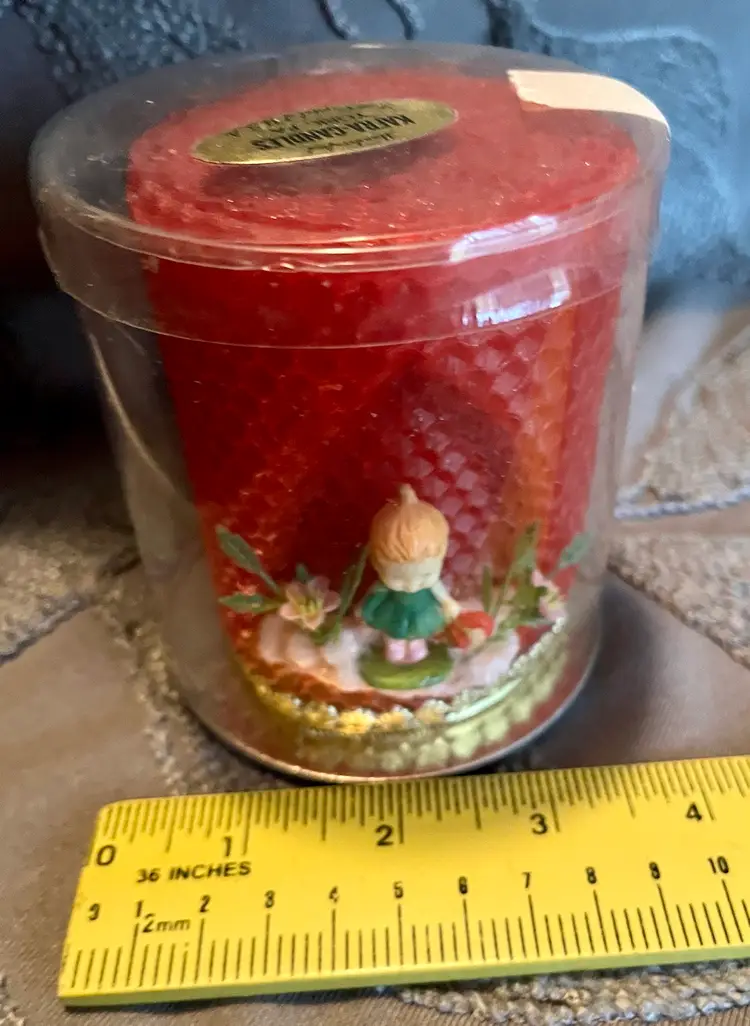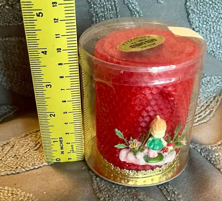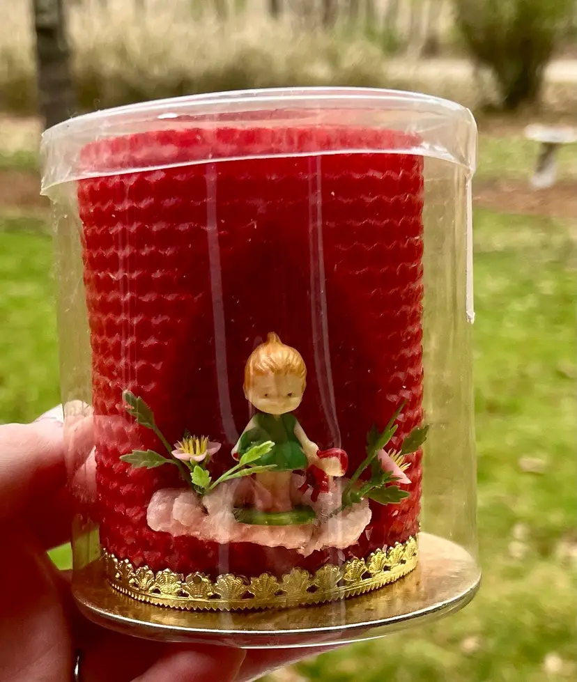 Add a touch of kitsch to your home decor with this handmade rolled red pillar candle from Kafra-Candles in York, Pennsylvania. The medium-sized, round pillar candle with gold trim accent at its base and featuring a plastic mini Caucasian with yellow blonde hair kewpie pixie doll (in a green dress) holding a “toy” doll and flowers on stems inset and is approximately 4 inches in height and 3.5 inches in width. The decorative candle is perfect for adding a pop of color to any room for winter, spring, summer, and autumn. For those who love unique and quirky home decor!