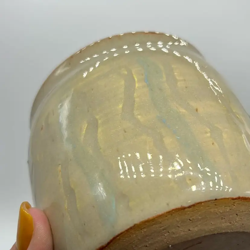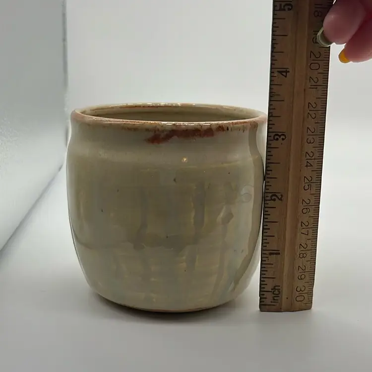 This pottery vessel is beautiful w/ earth tones and variations of aqua. Smooth glaze! No chips or cracks. Signed by artist! Approx: 3.35”h x 3”d at opening & 3.5” at widest