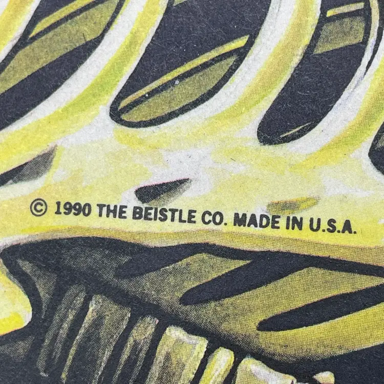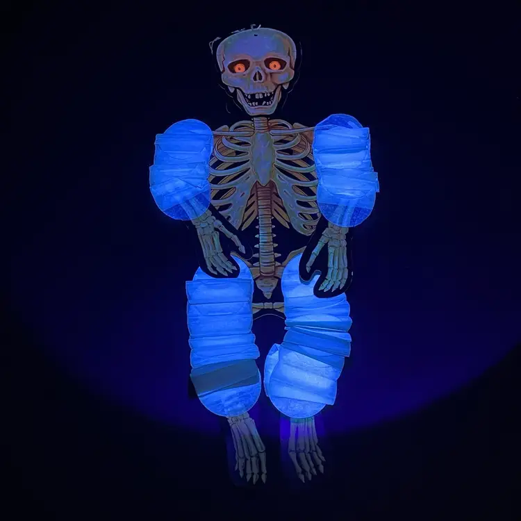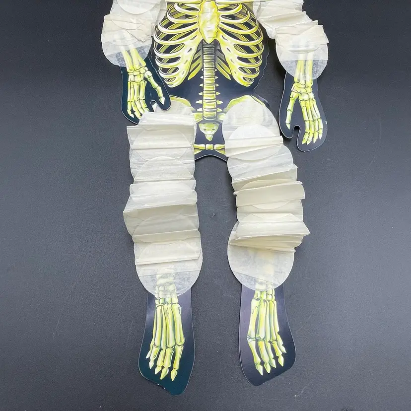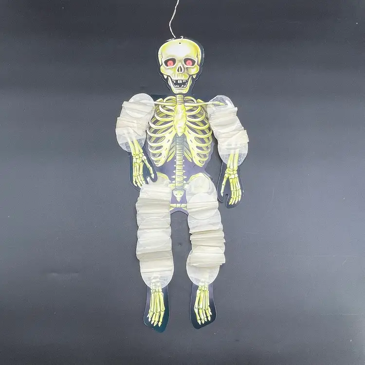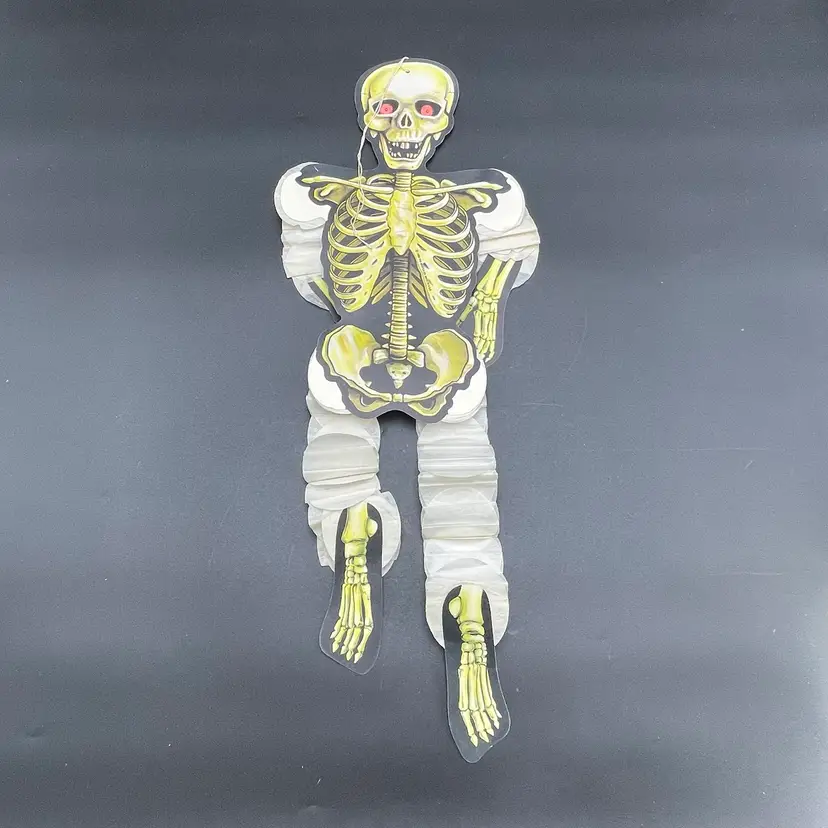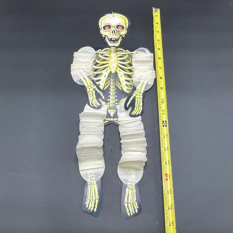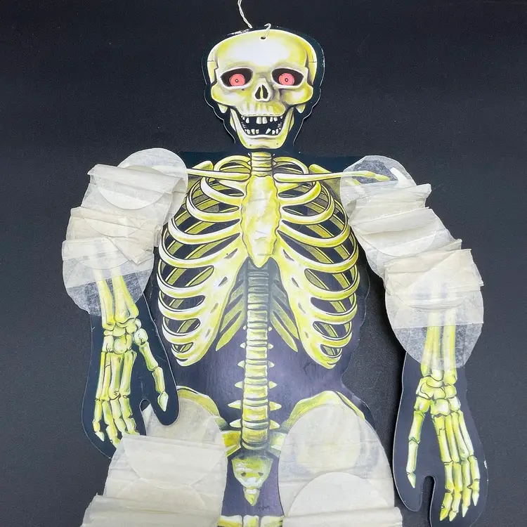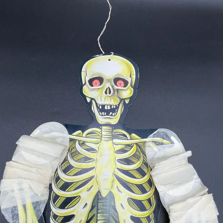 This is a vintage 1990 Beistle double sided thin cardboard die cut hanging skeleton wiggler with crepe paper arms and legs. Marked on ribcage. Glows under blacklight. Measures up to approximately 26" when stretched out. No tears.