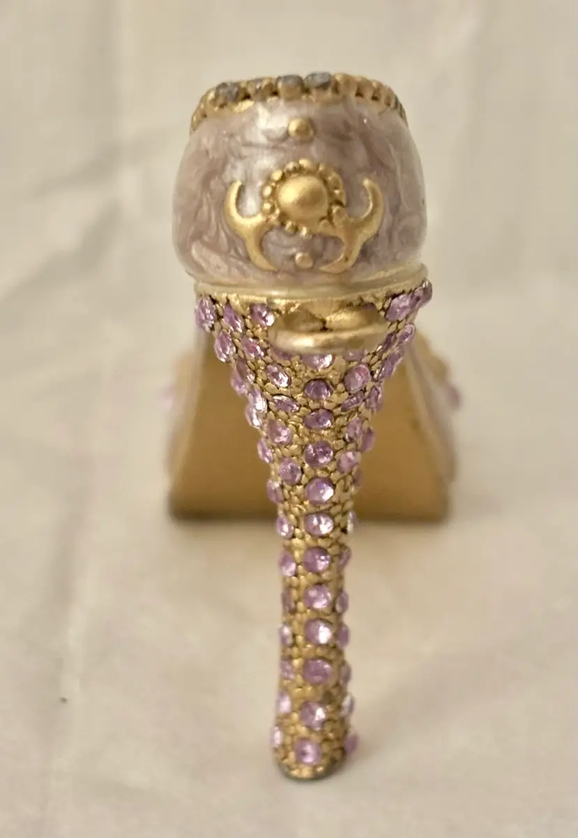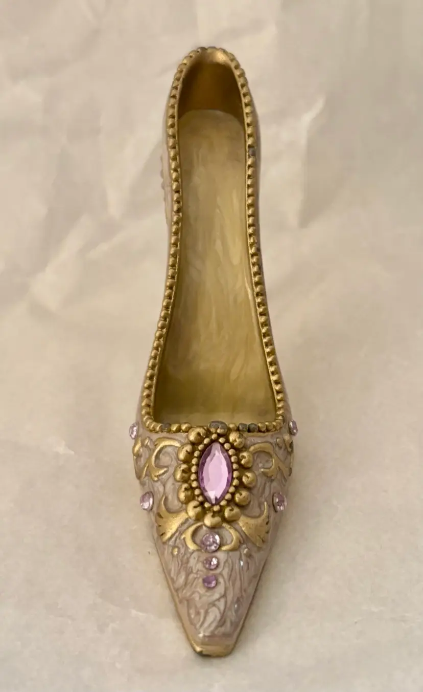 This is a charming little miniature shoe made out of resin, and is embellished with rhinestones, has a small loop for hanging