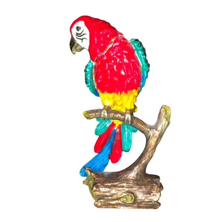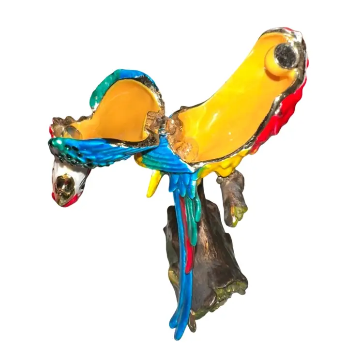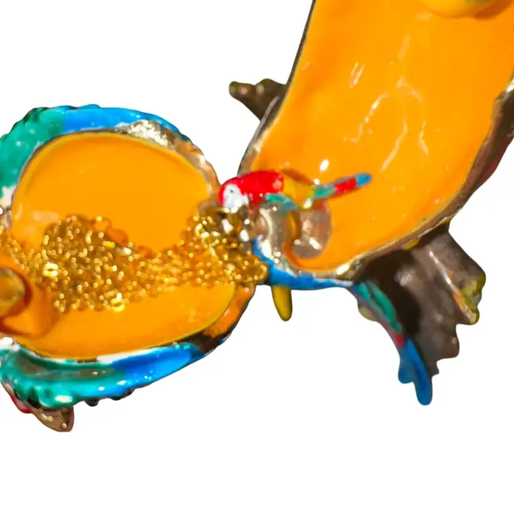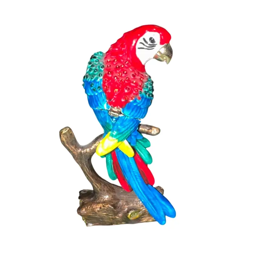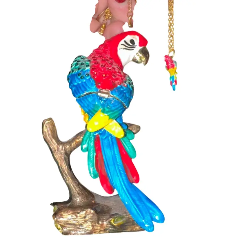 Bejeweled Goldnose Macaw Parrot Trinket Box With Parrot Necklace Trinket box stands 4 1/2 inches tall and has a magnetic closure Necklace has a 8 1/2 inch drop +3 inch extender