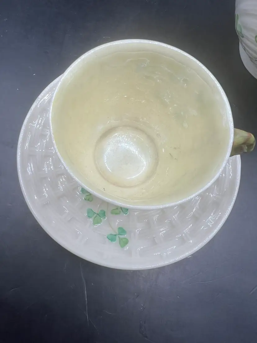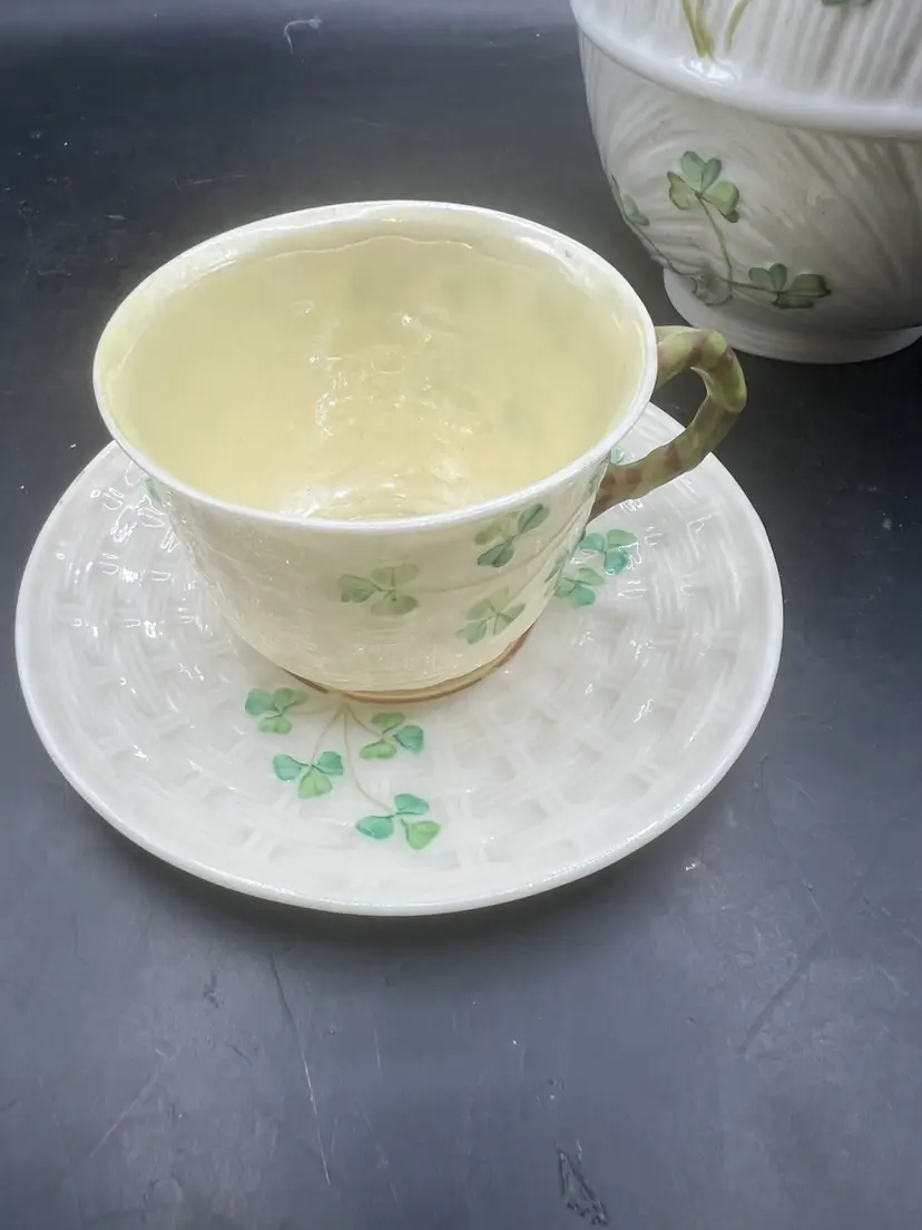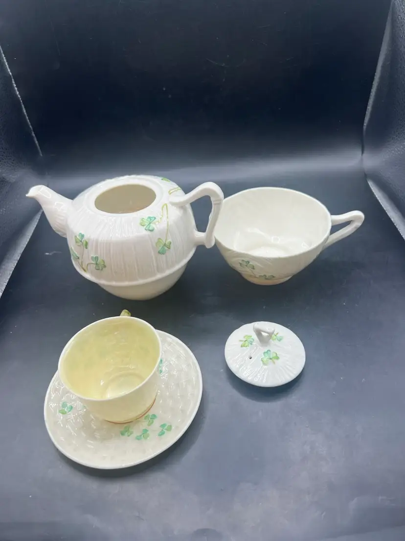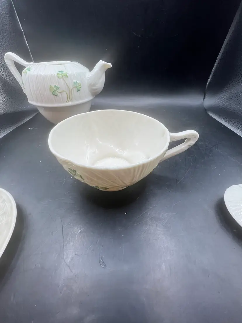 Beleek tea pot with tea cup underneath as well as a small tea cup, and saucer, signed on the bottom, no chips or cracks cream color with four leaf clover design
