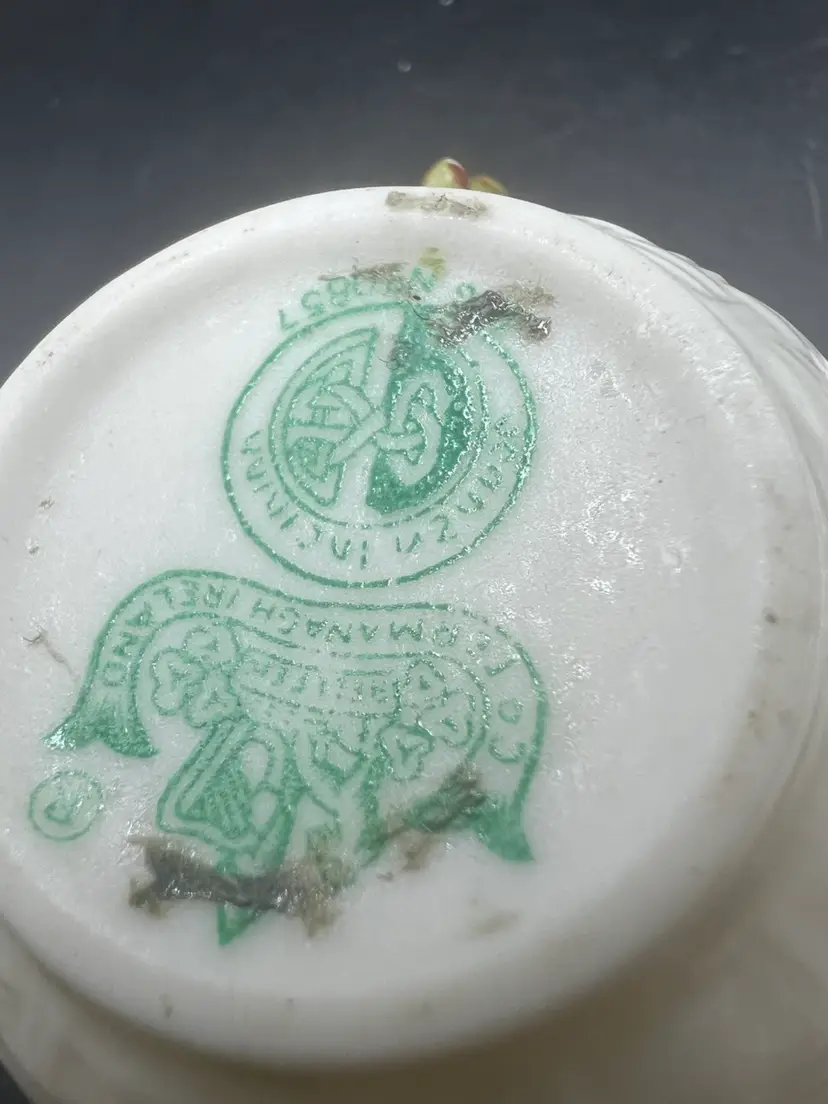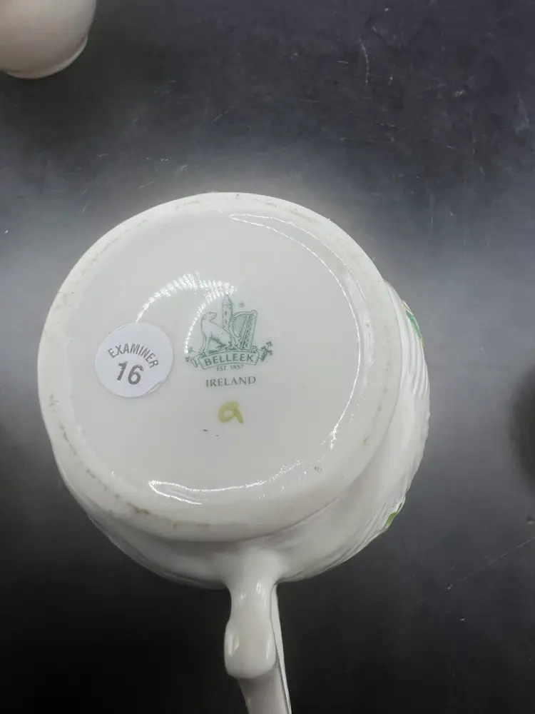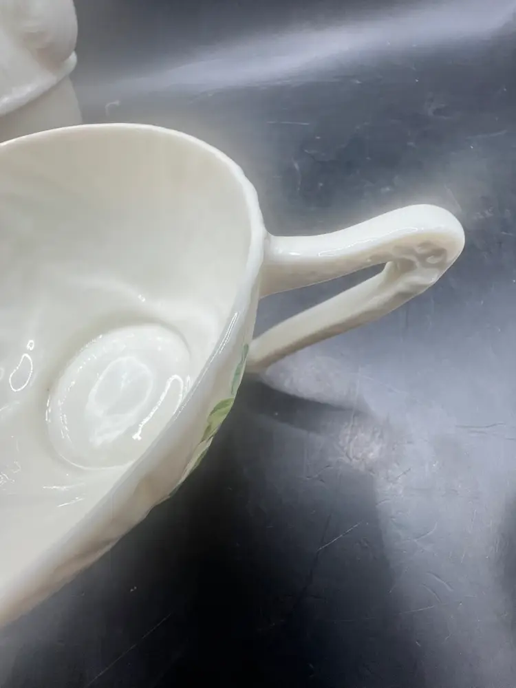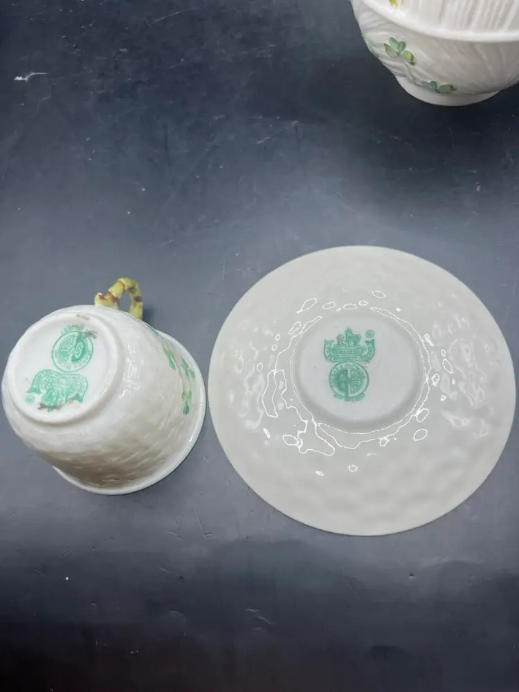Beleek tea pot with tea cup underneath as well as a small tea cup, and saucer, signed on the bottom, no chips or cracks cream color with four leaf clover design