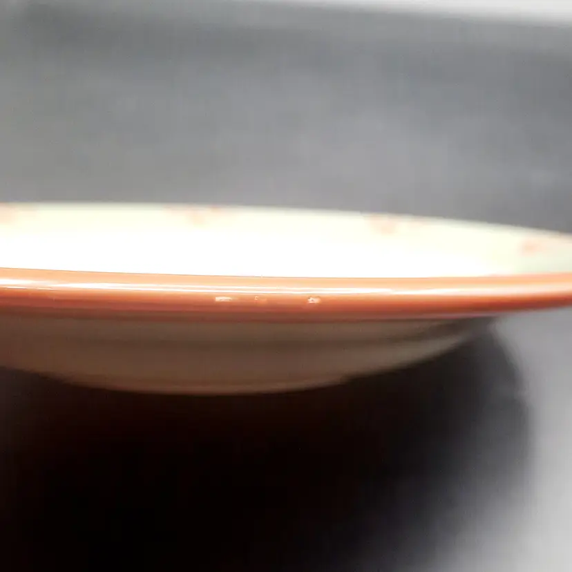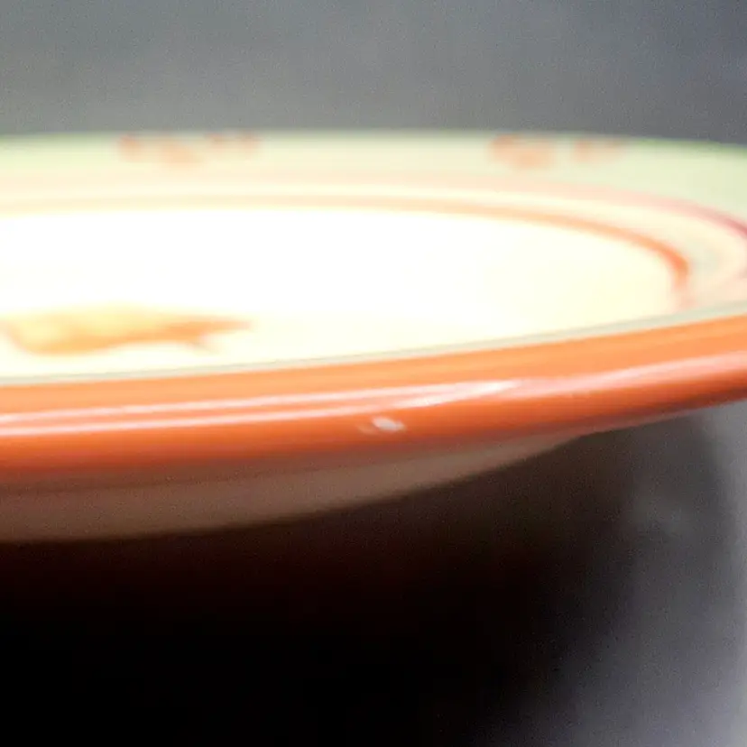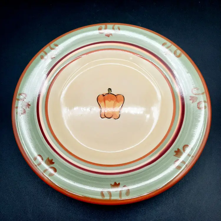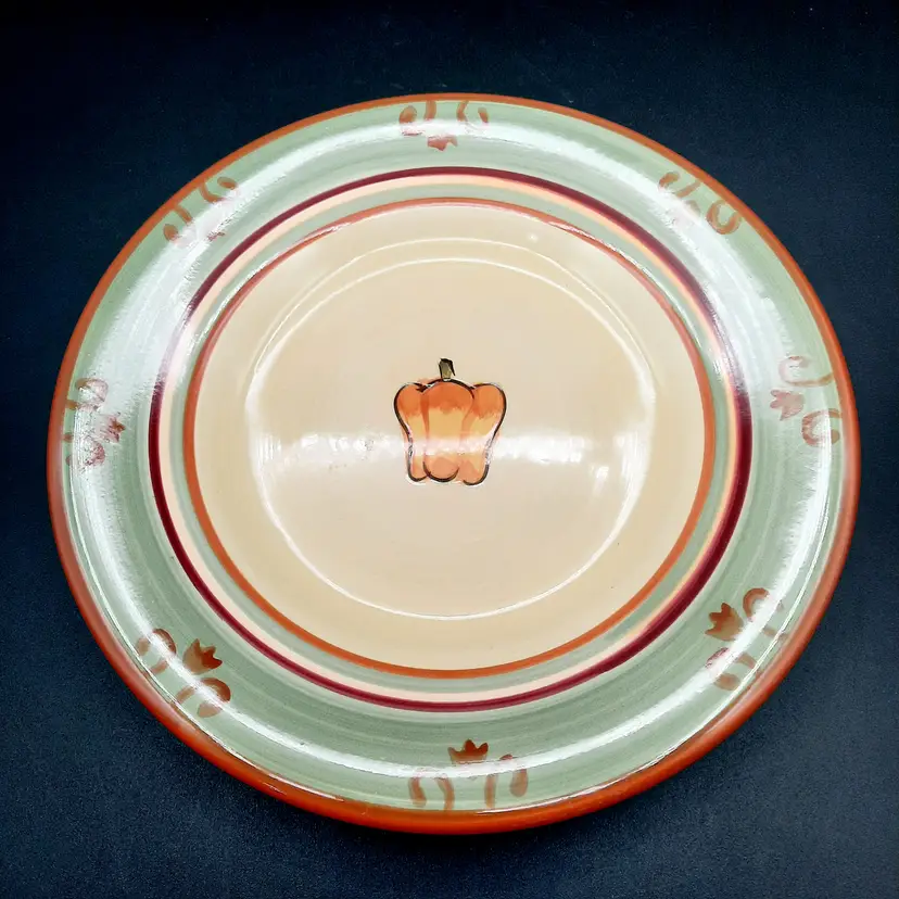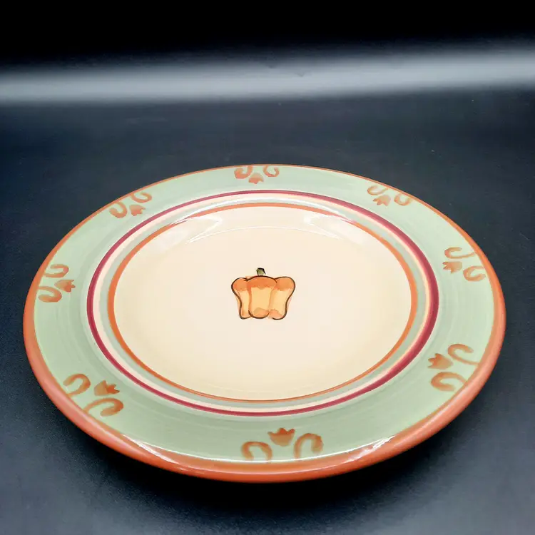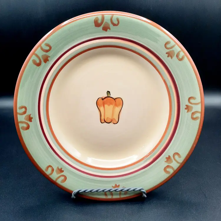 This sweet plate is 8 1/2" in great condition with light wear and a tiny paint chip on edge. I also have a tomato salad plate and an artichoke trivet in the same pattern listed!