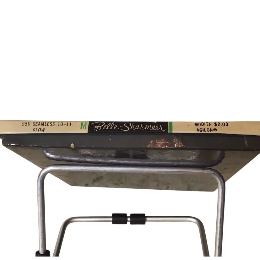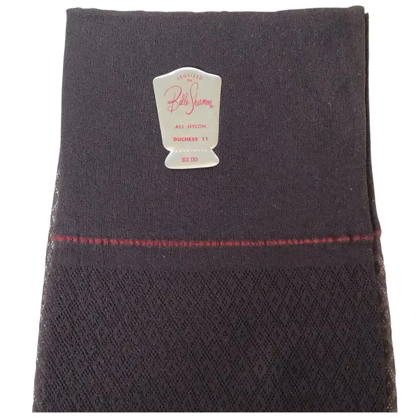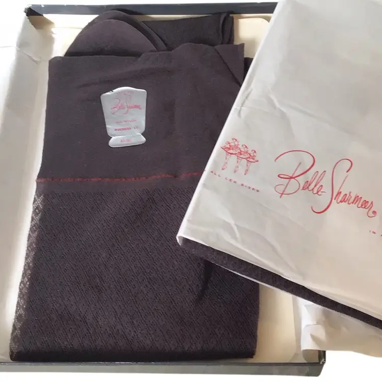 2 pair new in box Seamless size medium thigh high nylon stockings, chocolate brown diamond weave pattern. Original box is in good condition except one corner is torn. 1950s era. #005