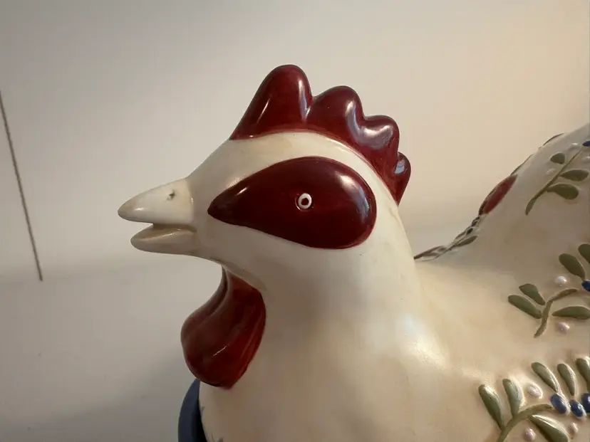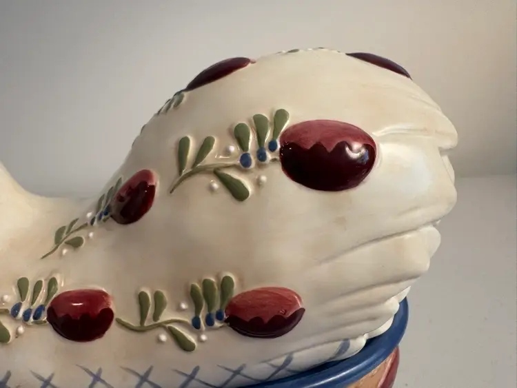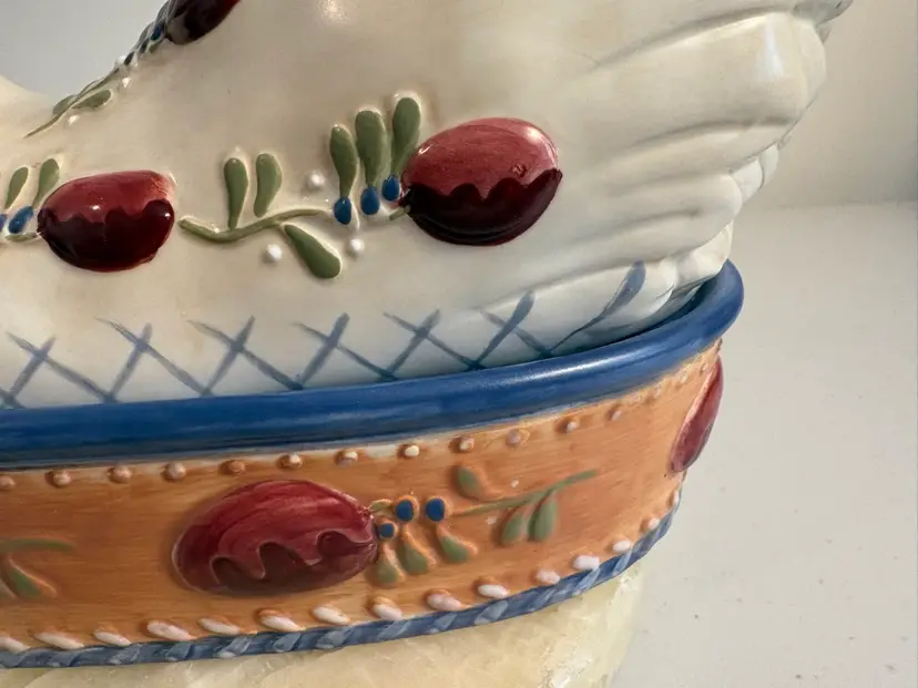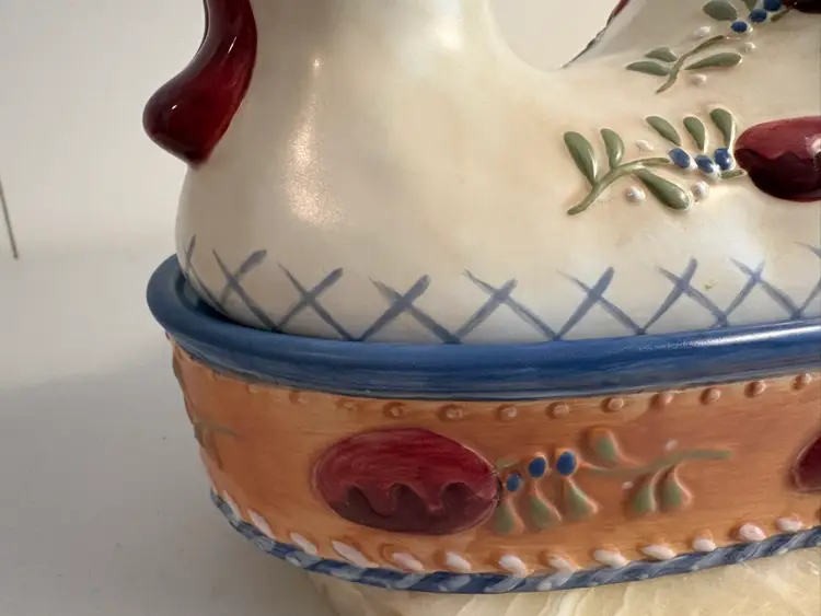 The Bella Casa by Ganz Hen on Nest Covered Dish is a charming hand-painted country piece featuring a design of a chicken or hen sitting on top of a nest. This nostalgic and whimsical covered dish adds a touch of rustic elegance to any kitchen or dining table. Perfect for serving snacks or desserts, this dish is a delightful addition to any home décor collection, especially for those who appreciate handmade country-style pieces.