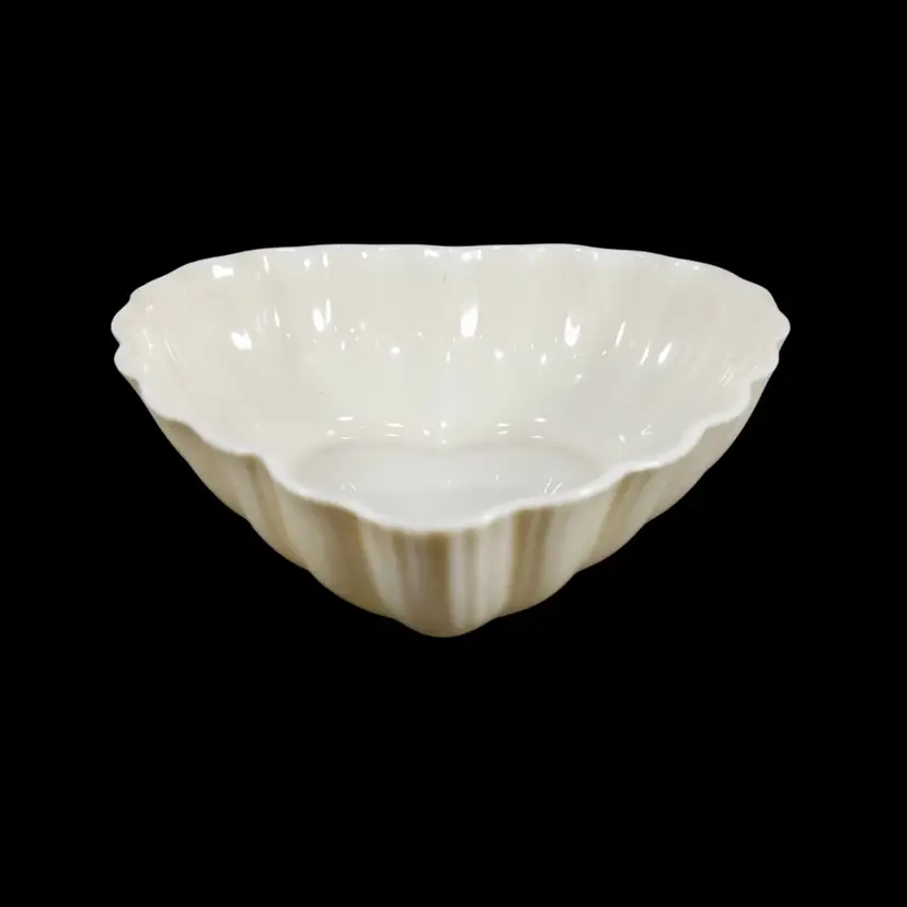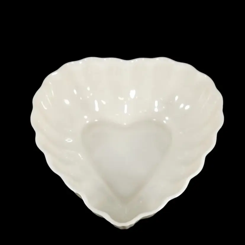 This is a heart shaped dish made by Belleek of Ireland. It measures approximately 5.75” by 5.5” and can be used as a candy or trinket dish. It is thin glazed Parian ware with the green 6th mark, indicating it was made between 1965 and 1980. It is in excellent condition with no chips or cracks.