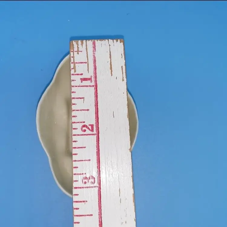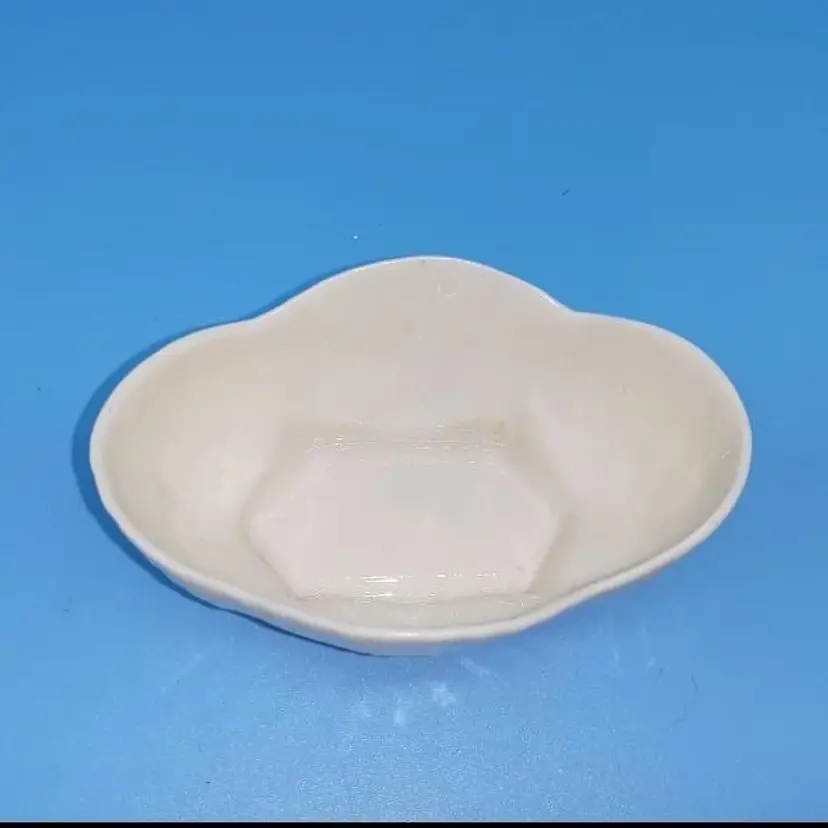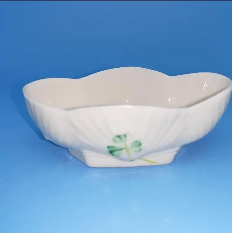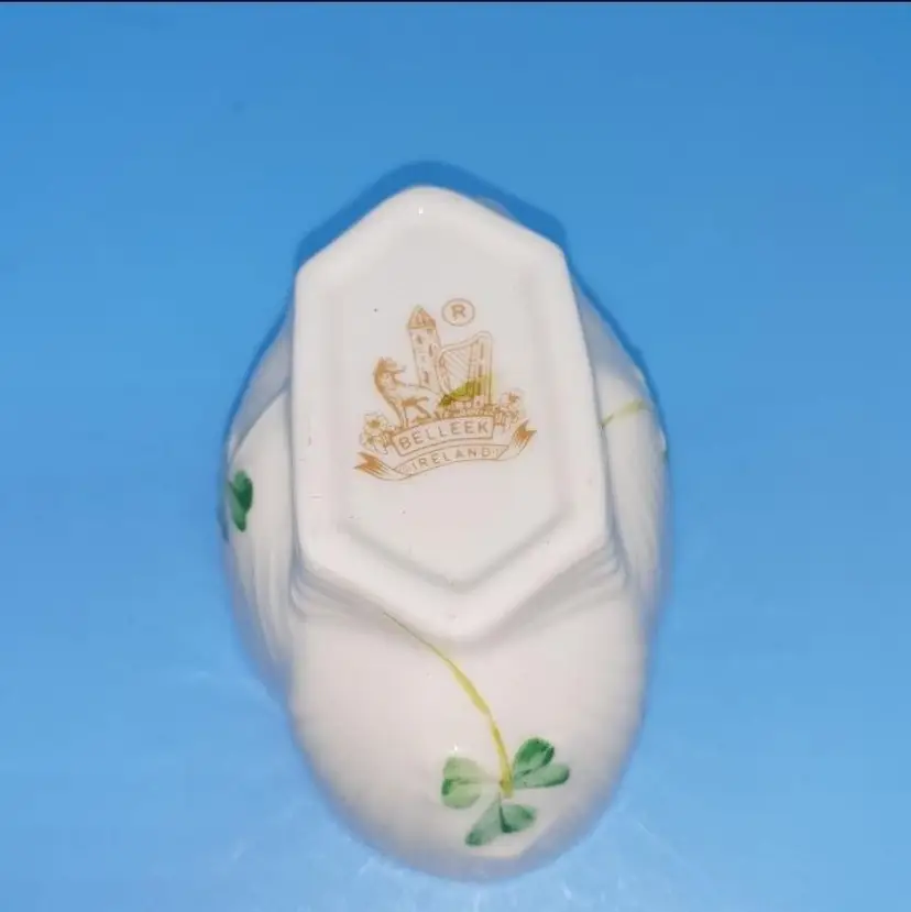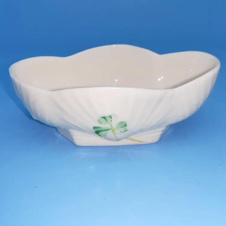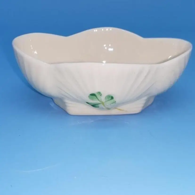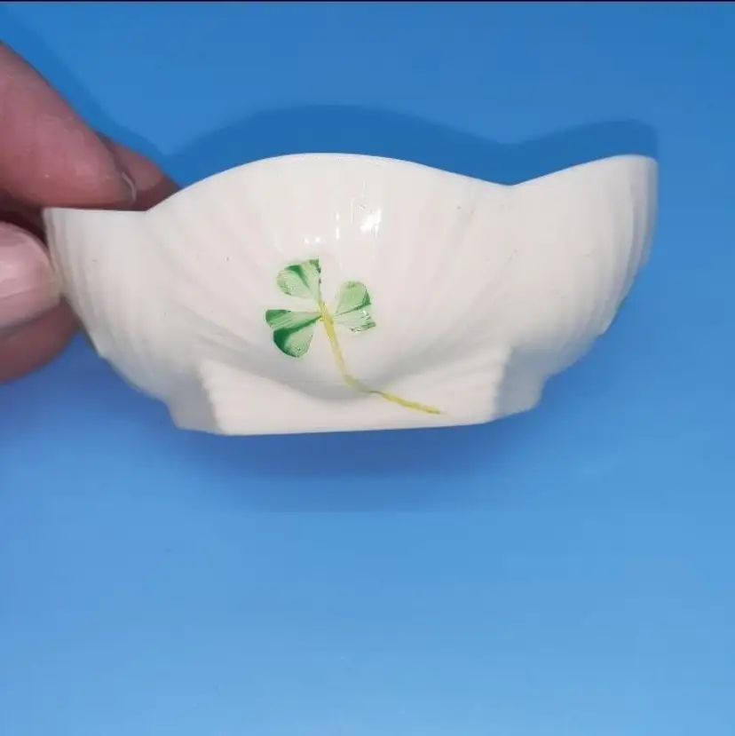 Made of fine Irish Parian cream colored scalloped salt cellar dish with 4 hand painted shamrocks on each side. Measuring approx 3 1/8” long x 1 1/8” tall x 2” wide . Marked with the brown 7th mark which dates this piece to 1980-1993.