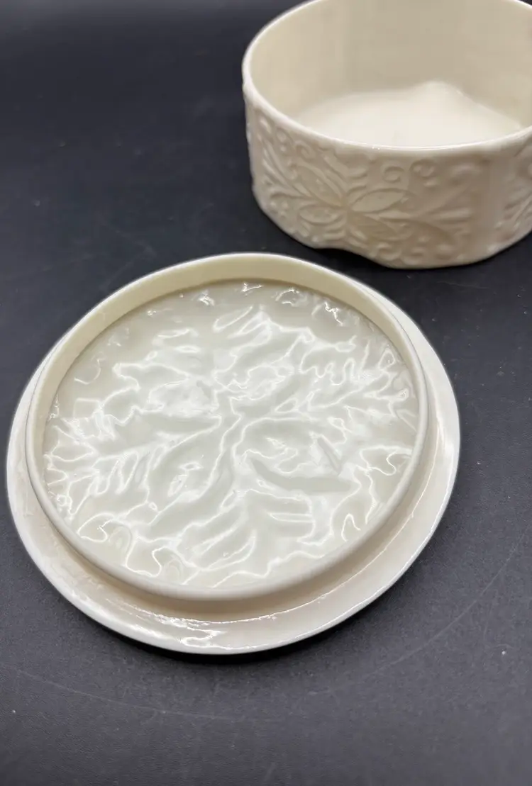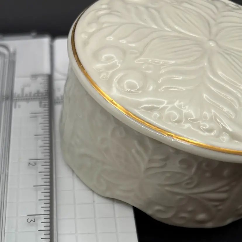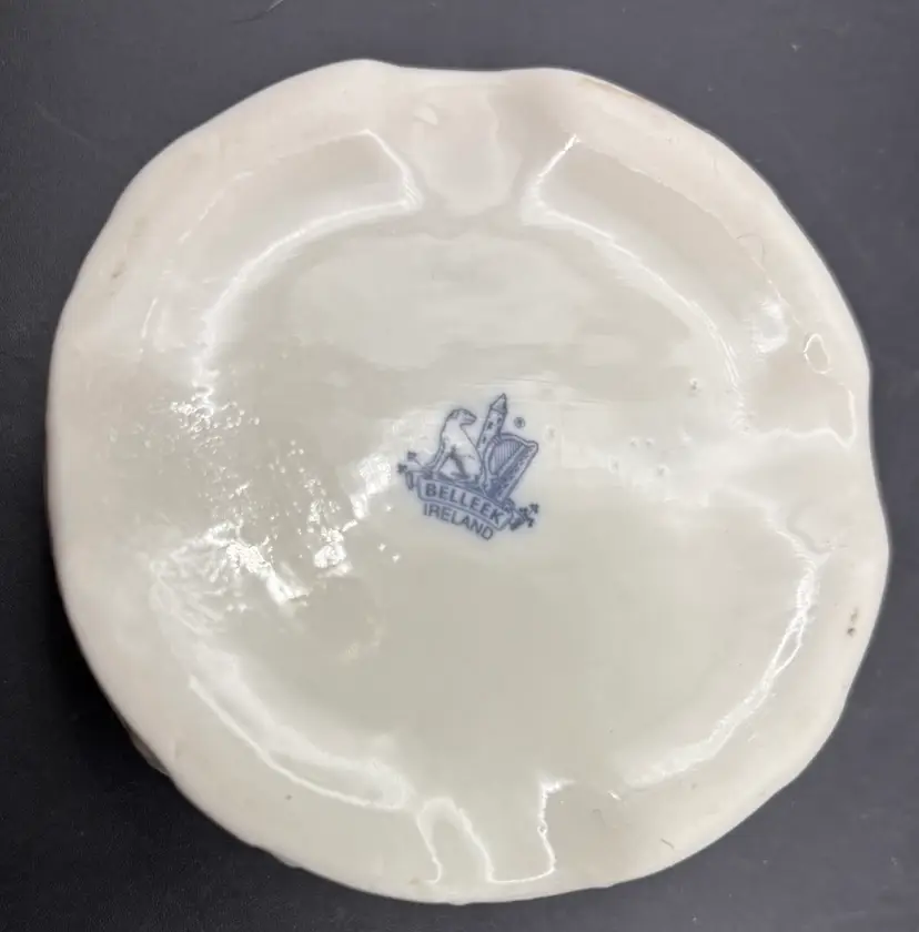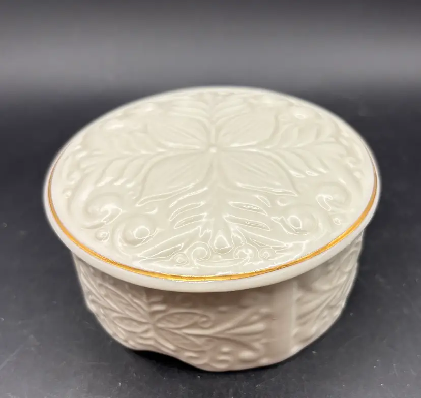 This beautiful Bellek porcelain trinket box with gold trim would be a lovely addition to your dresser top or collection. Made in Ireland. Porcelain and gold trim Perfect for storing small jewelry, trinkets, or even candy, this box is both functional and decorative.