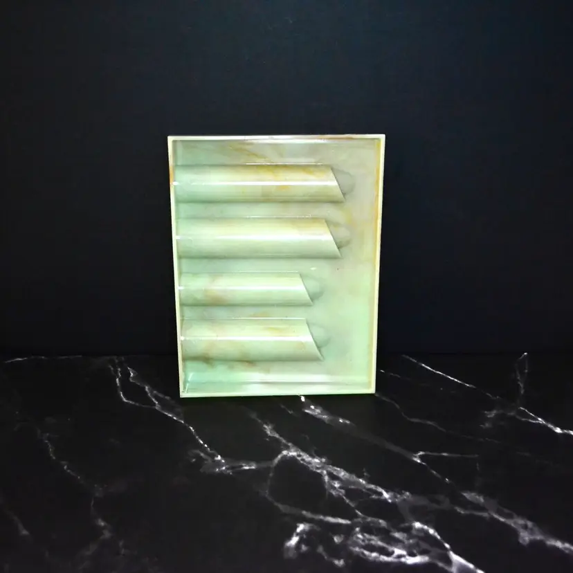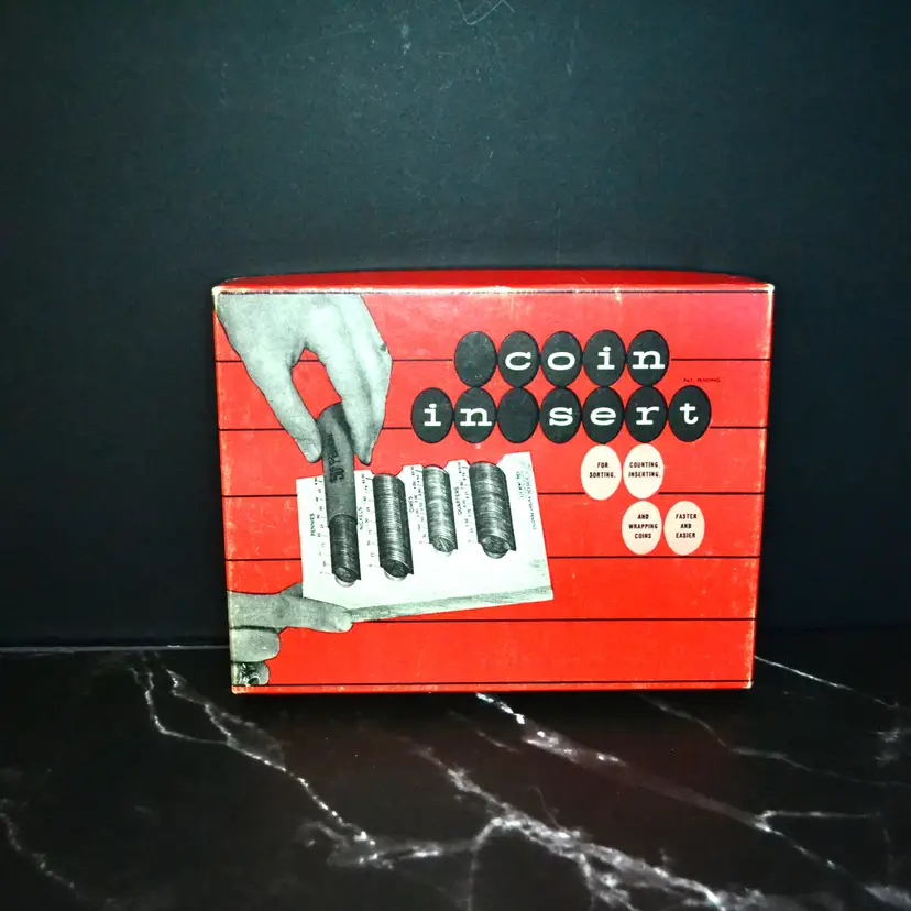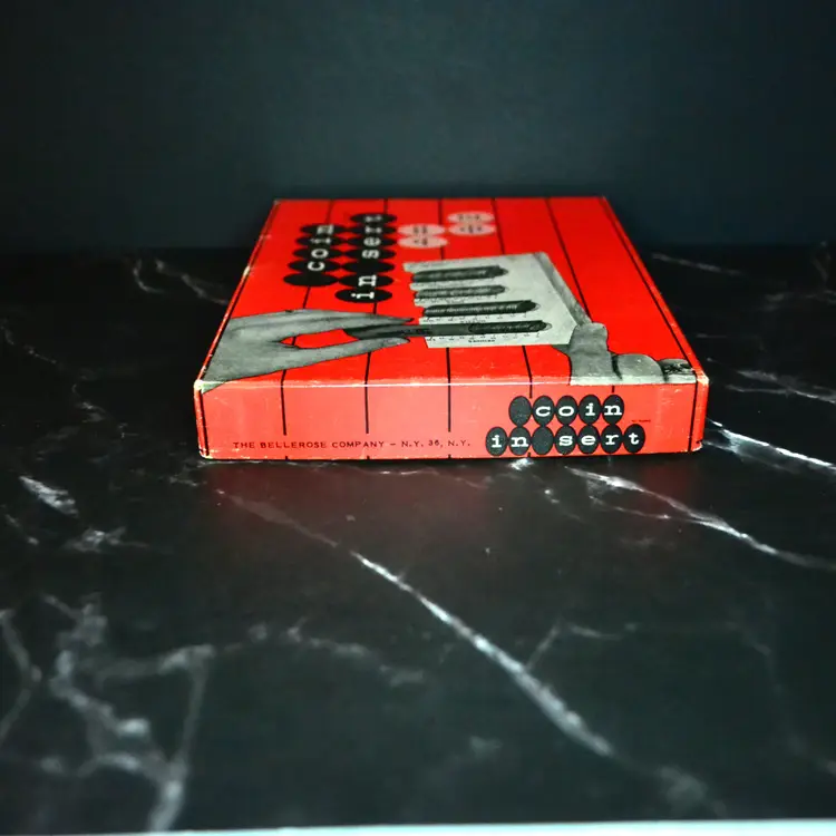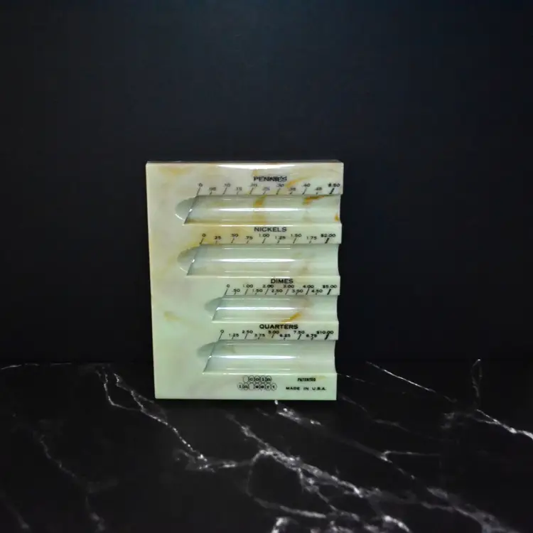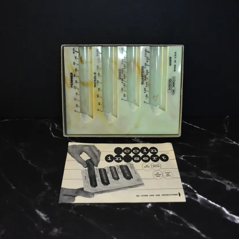 Made by Bellerose Co. in NY, NY, from about the 1950s, coin separator. Made of plastic in light green with a marble effect finish. This is new old stock, comes in original box, with instruction sheet. Box does have wear but is minimal. The sorter is in new condition.