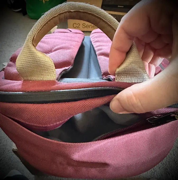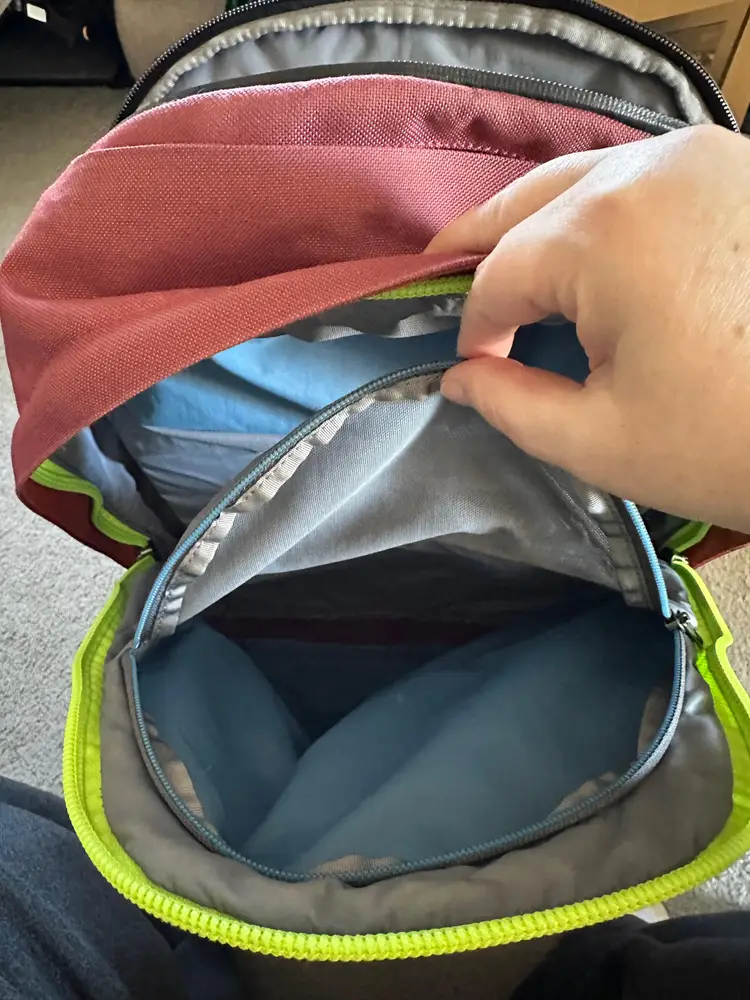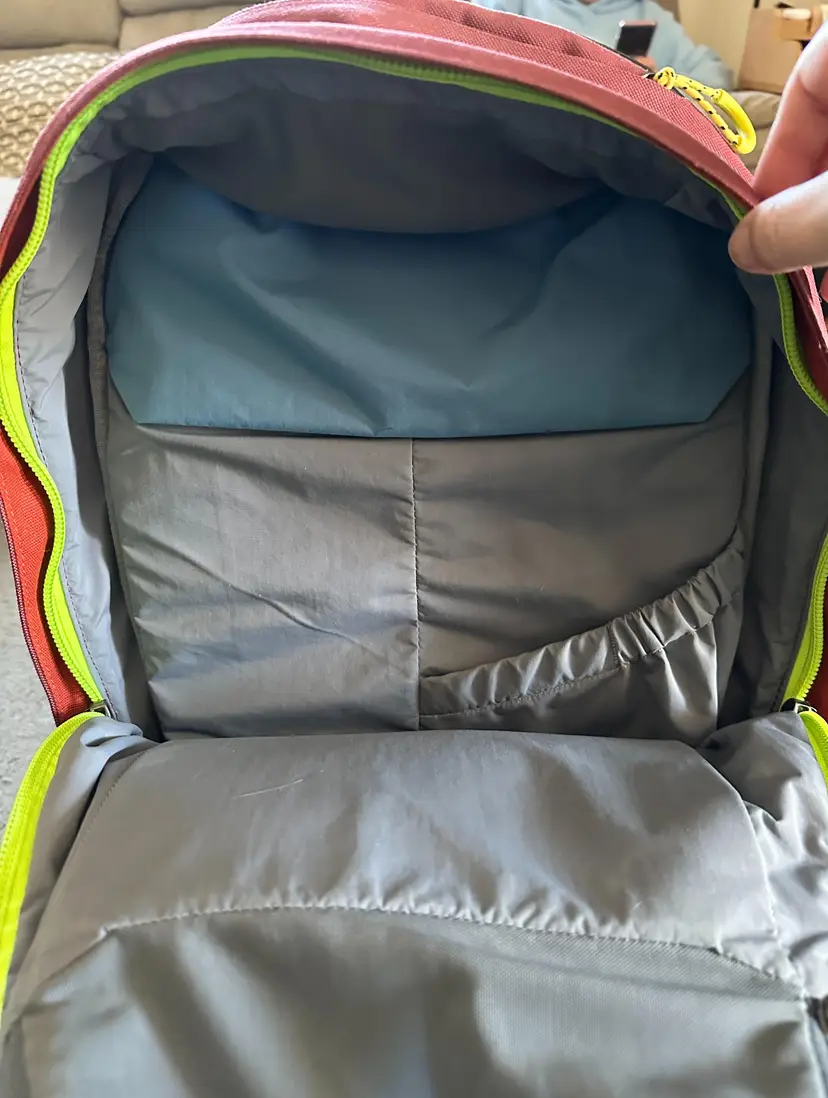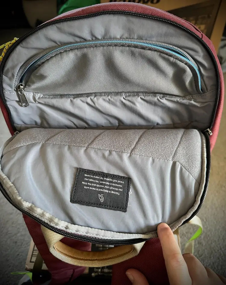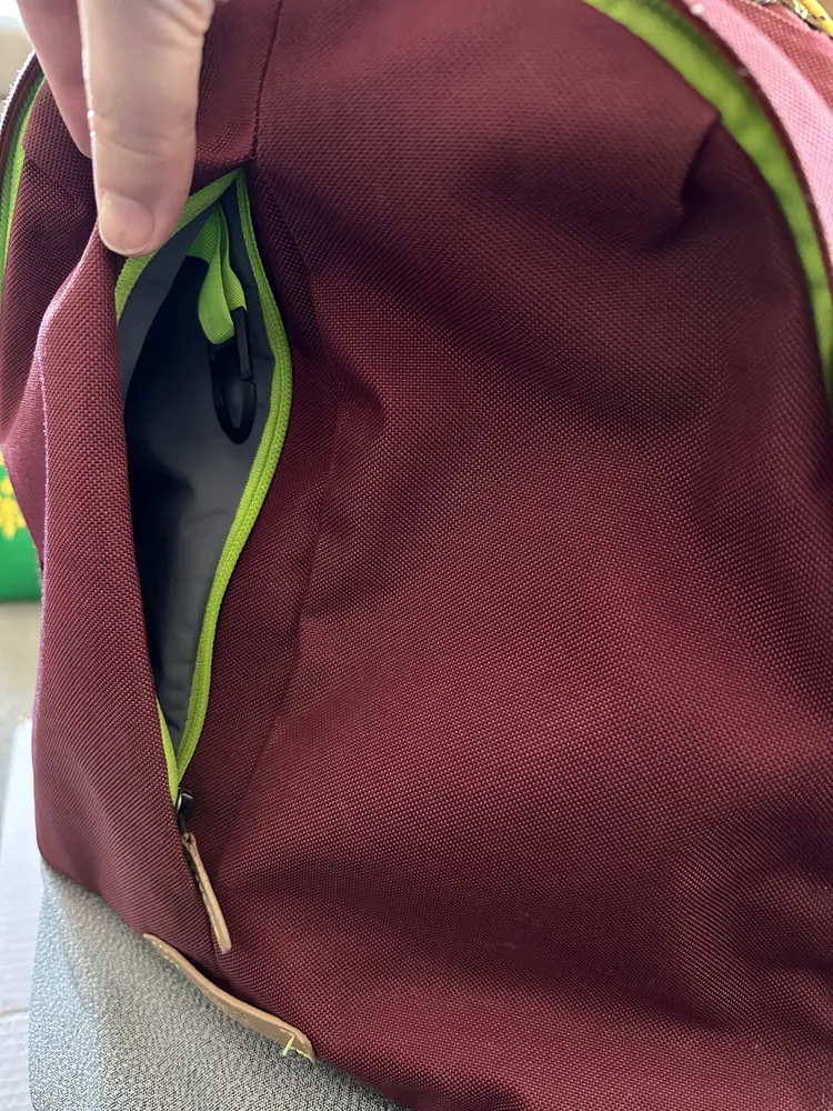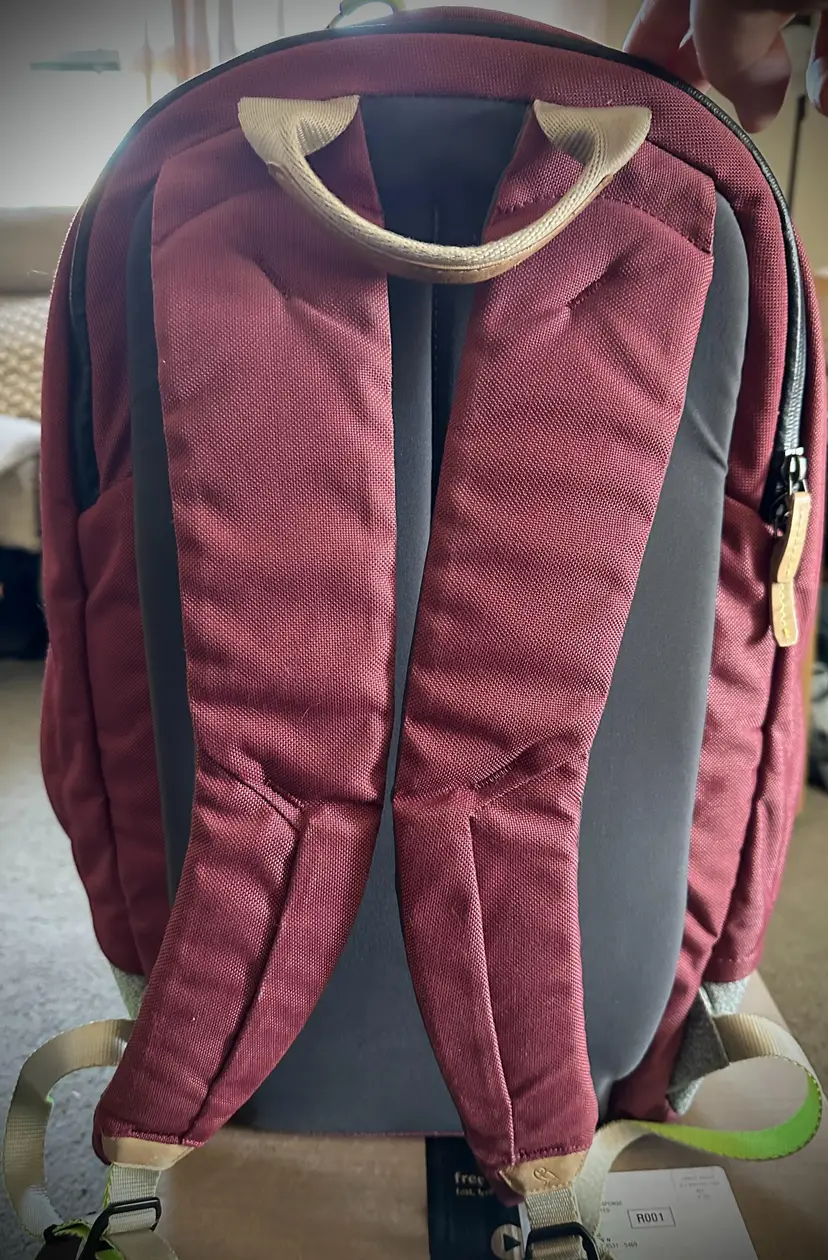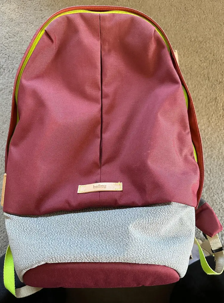 Used Neon Cabernet Backpack, 20 Liter capacity, weighs 1.6 lbs Features: hidden front quick access pocket with key leash, top quick access sunglasses pocket, interior water bottle pocket, separate laptop compartment that fits up to a 16 inch laptop with water sealed zip, couple of interior pockets (see pics) ** Please note: a spot on front above the Bellroy logo and straps are a little frayed **