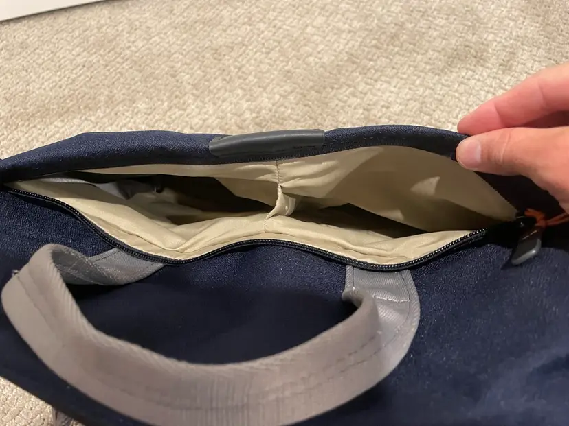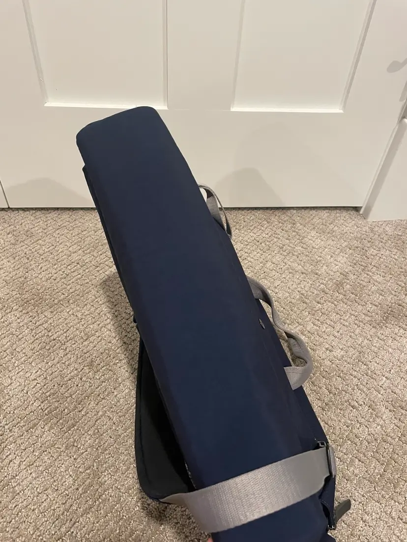 Brand new - sadly the luggage pass through strap doesn’t fit my wider than normal handle of my roller bag. Navy color. Original tags still attached and included.