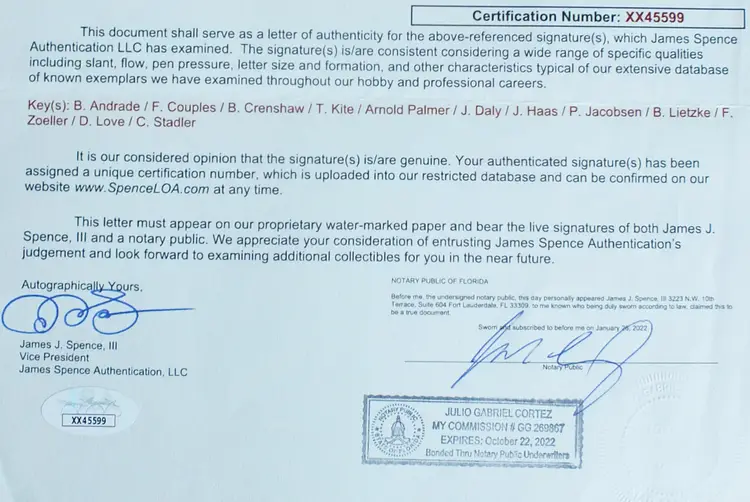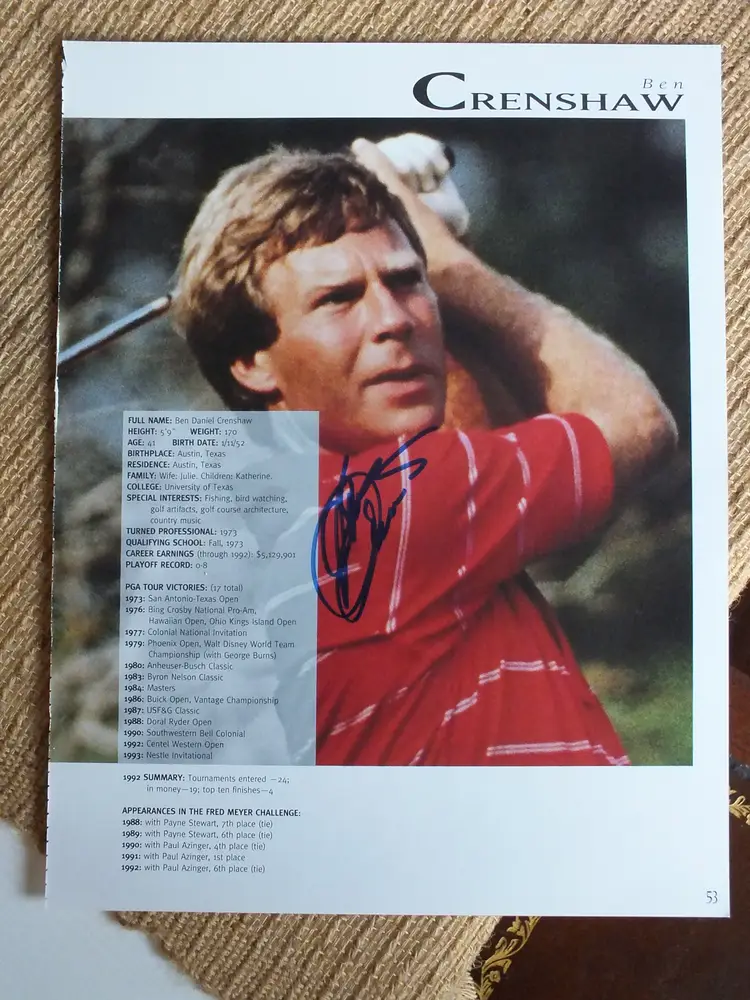 Ben Crenshaw Signed Autograph Signature 8.5x11 Golf Program Sheet with an LOA COA by JSA! .... This came out of a 1993 Fred Meyers Challenge Event Book/Program - which I purchased as it had this one and many other players autos in it. -- see my listings for other players! .... You will receive a copy of the JSA Authentication - however, the original as shown in the pictures will stay with the Arnold Palmer - which I think I am pretty much going to keep the Arnold Palmer signature (a bucket list item for me) Thanks! .... Will come shipped in an 8.5x11 top loader and packaged securely. .... Please see my listings for my other golf autographs, golf cards, and other items! ... Not an 8x10 but an 8.5x11! ..... LOCAL PICKUP OPTION! Pick Up This Item in Conway, SC & Receive Refund For Shipping! After Your Purchase, Immediately PM/DM Me To Let Me Know You Want Local Pickup. ..... Will this be your first purchase on the network? Use code GRANDSTRAND at checkout for $5 OFF! Already made a first purchase and don't like my listing price? Feel free to make an offer!