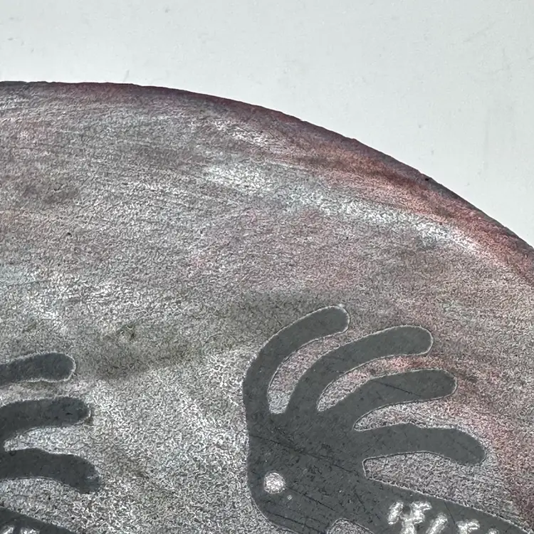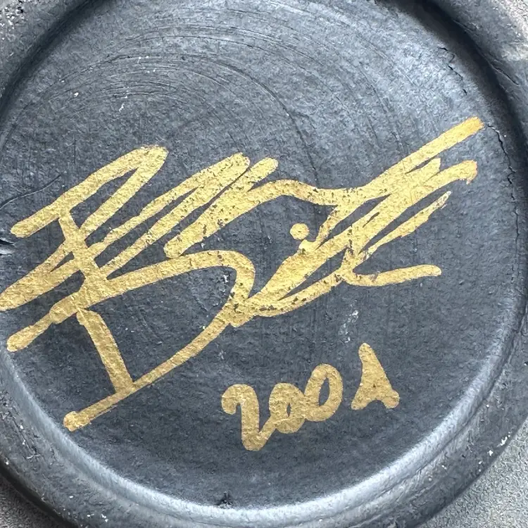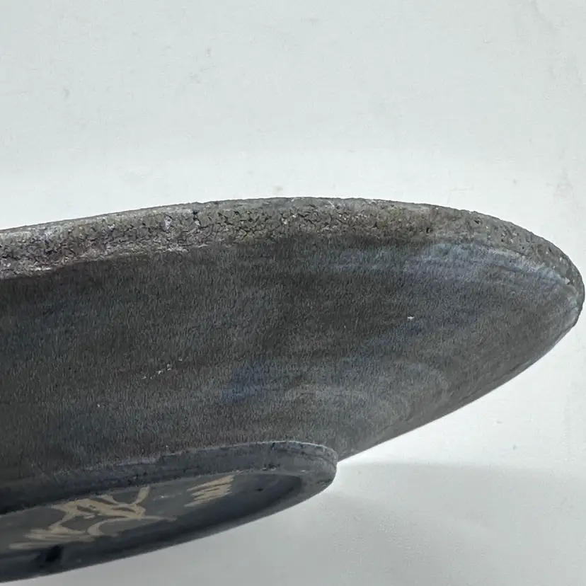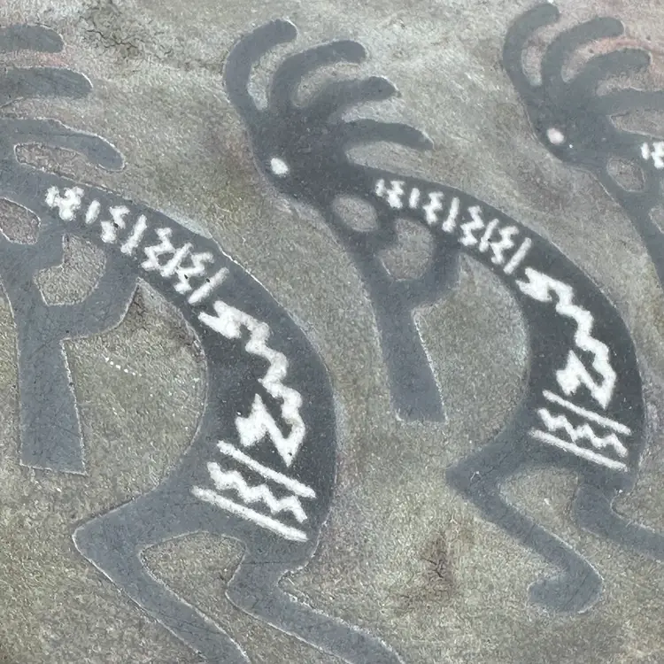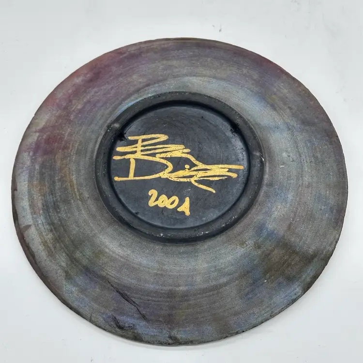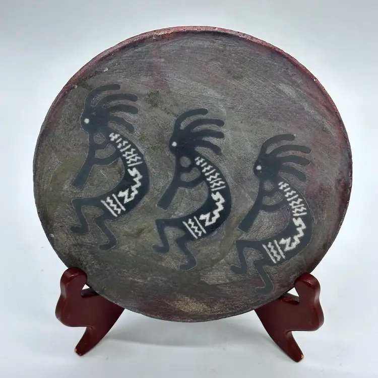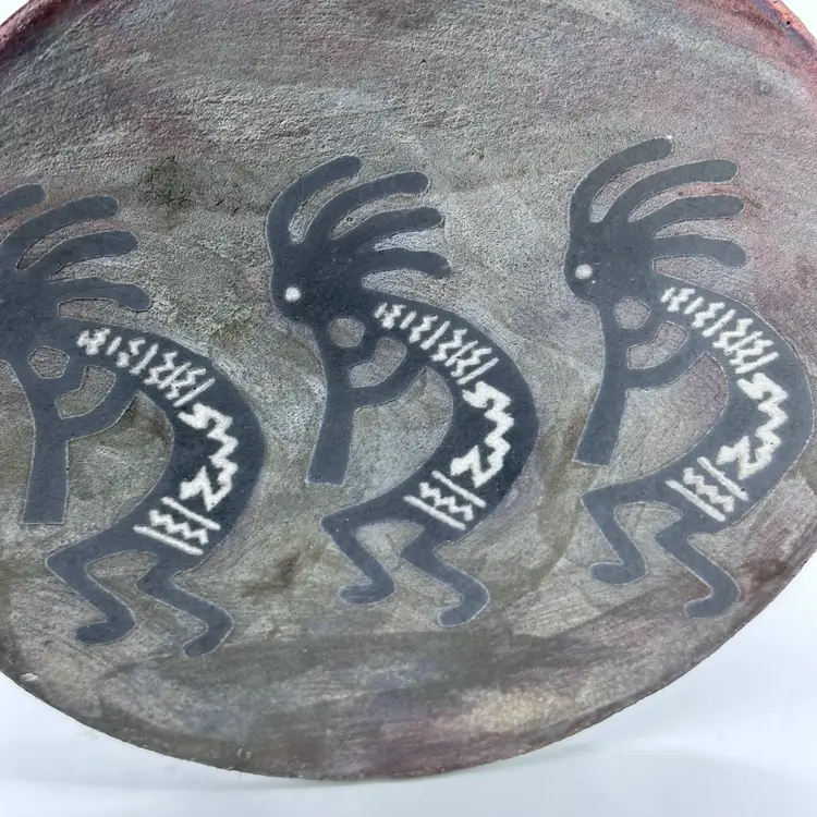 This handmade plate by Ben Diller features a beautiful Kokopelli pattern on a round 7 1/2 inch diameter surface. The plate is made of clay and was created using the Raku Pottery technique. In good condition. Does not have any chips or cracks.