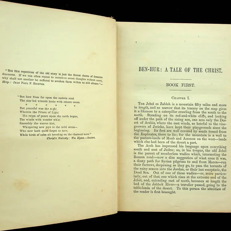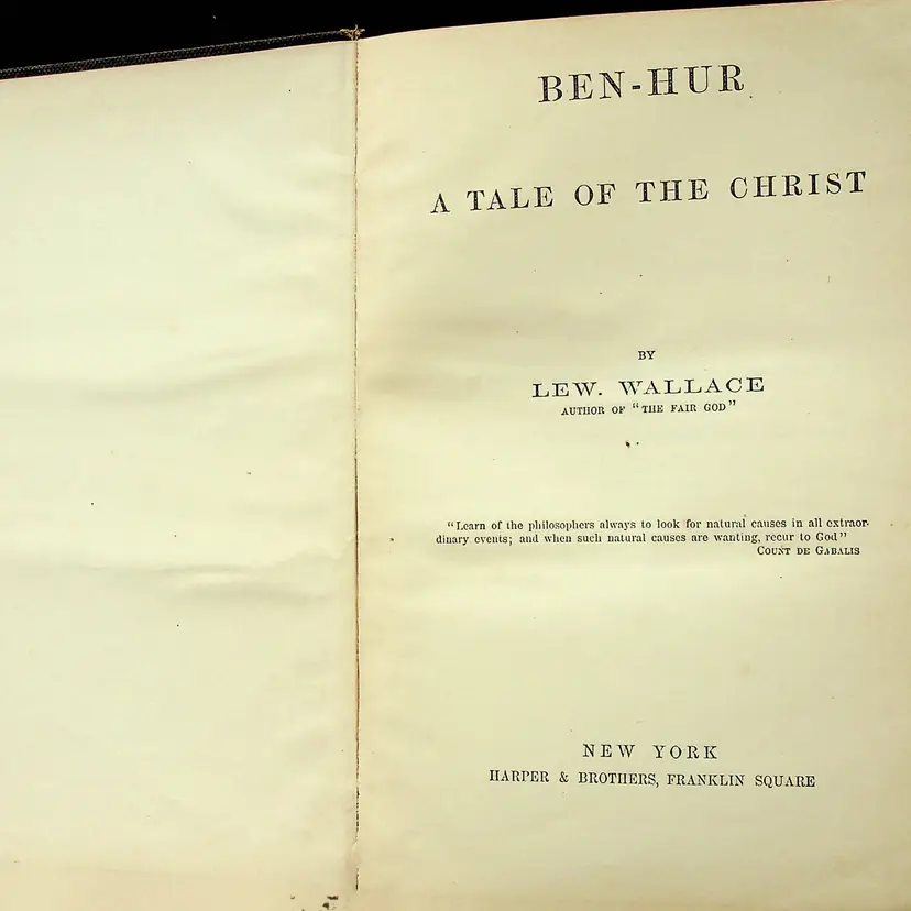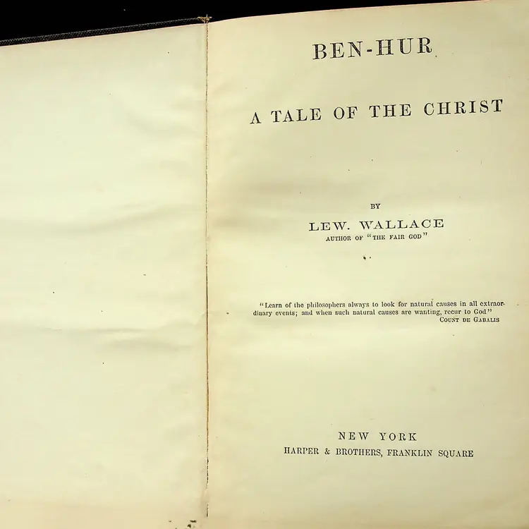 A vintage 1st Edition copy of the famous novel "Ben-Hur" written by Lew. Wallace, recounting the story of Jesus and his impact on the family of Hur and other people.