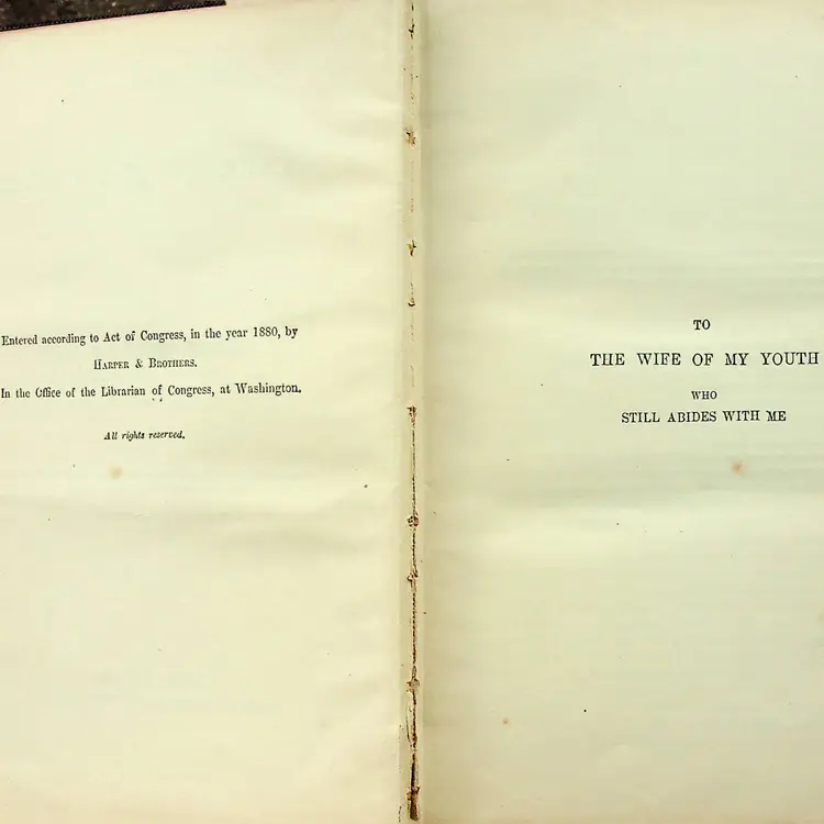 The front piece of this antique copy of the book was signed and dated in 1886 by Lizzie Dillon, who may have been its initial owner. Covered in a dark brown textured/woven fabric, the book measures 7 inches x 5.25 inches x 1.25 inches; its weight is 1 pound 3.9 ounces.