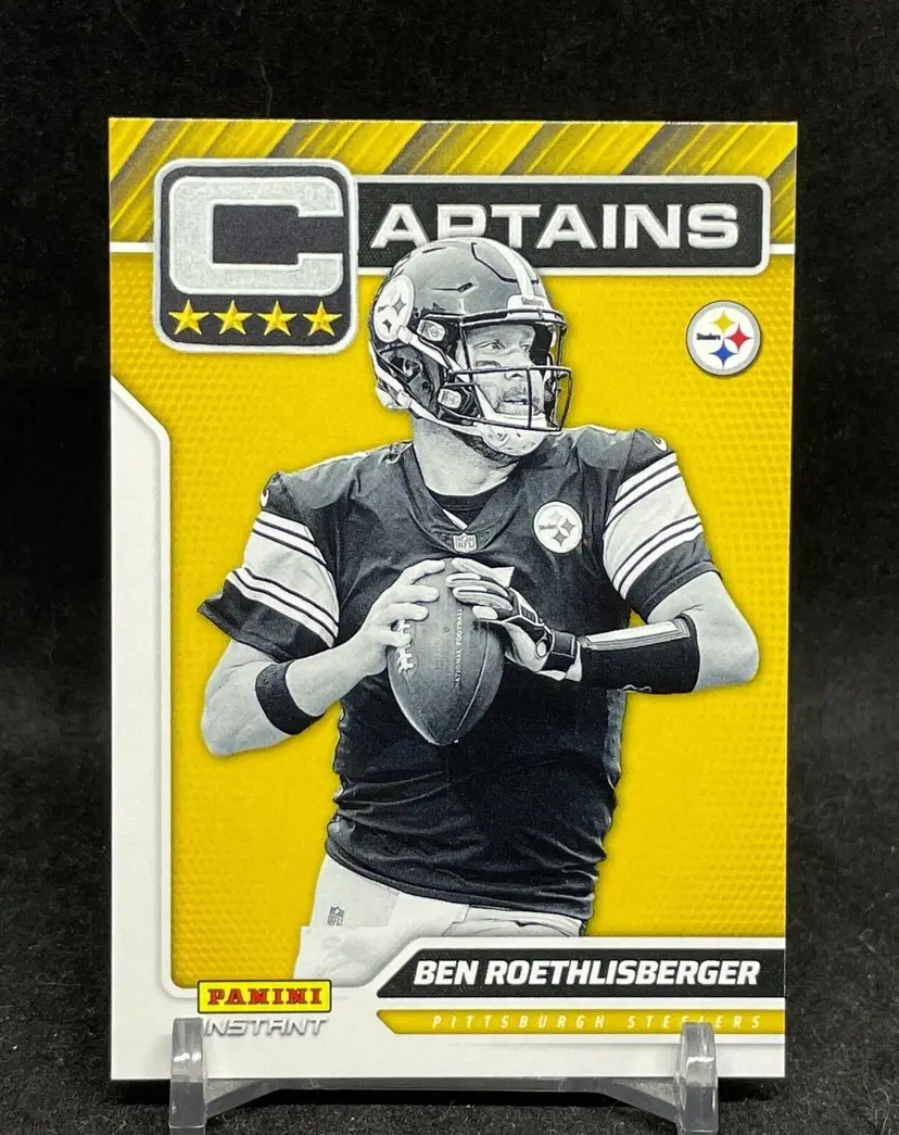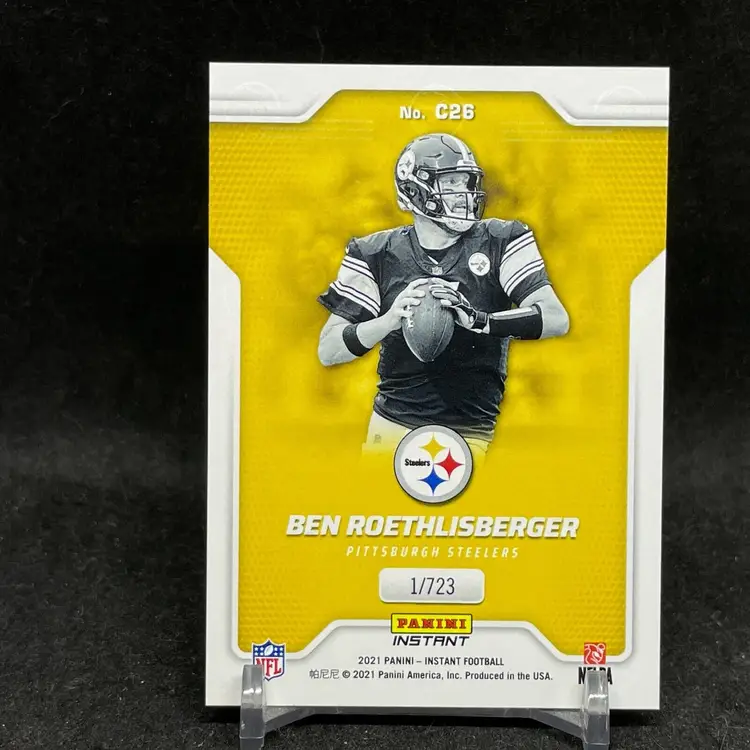 1st time buyer? Get $5 Off with code DISTRICT5 at checkout! Card as shown. All cards $20 and under ship PWE via lettertrackpro [https://www.letter-track.com/registerap.asp?AFID=8757] Set: 2021 Panini Instant NFL Card Thickness: 20 Pt. Country/Region of Manufacture: United States Card Size: Standard Custom Bundle: No Insert Set: Captains Card Number: #C26 Card Name: Panini Instant NFL Captains SP Event/Tournament: Super Bowl Parallel/Variety: Base Season: 2021 Material: Card Stock Player/Athlete: Ben Roethlisberger Autograph Authentication Number: n/a Type: Sports Trading Card Features: Base Set, Chase, Exclusive, Limited Edition, Short Print Vintage: No Year Manufactured: 2021 Manufacturer: Panini Sport: Football Language: English Autograph Format: n/a Autograph Authentication: n/a Print Run: 723 Original/Licensed Reprint: Original Signed By: n/a Team: Pittsburgh Steelers League: National Football League (NFL) Autographed: No