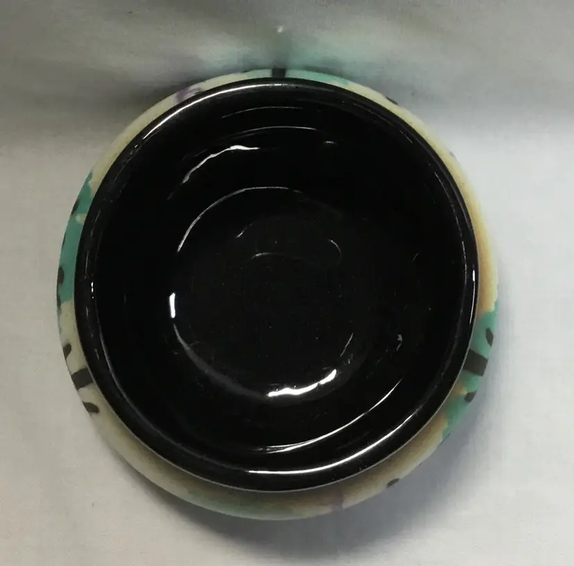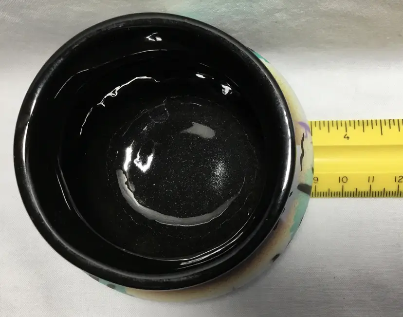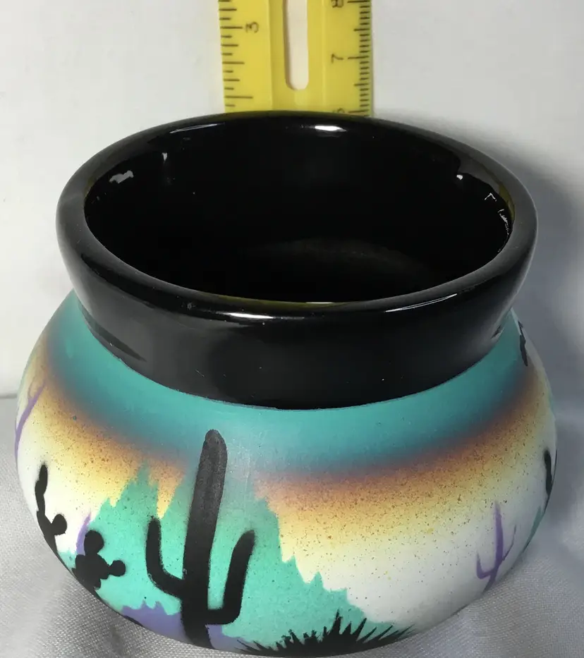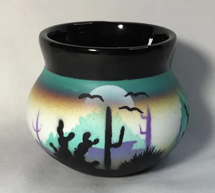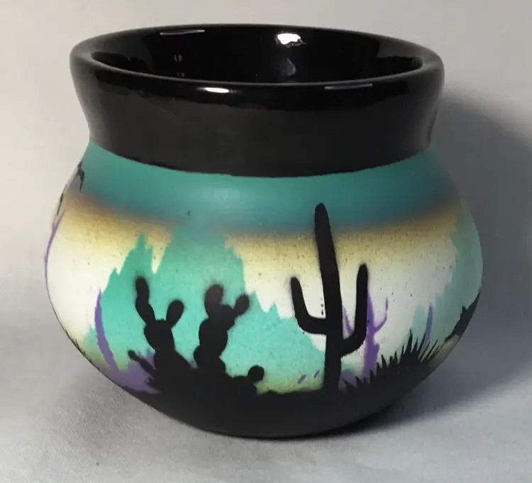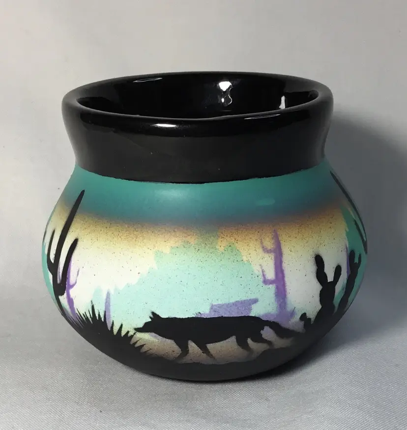 Round, ceramic pot, 2.5 inches high by 3.5 inches wide at widest part. Black, glazed interior. Exterior has desert scene with cacti and coyote. Airbrushed background in teal, white, mustard yellow, mid-ground is mountains and light purple cacti, foreground is black, handpainted (?) cacti and coyote figure.