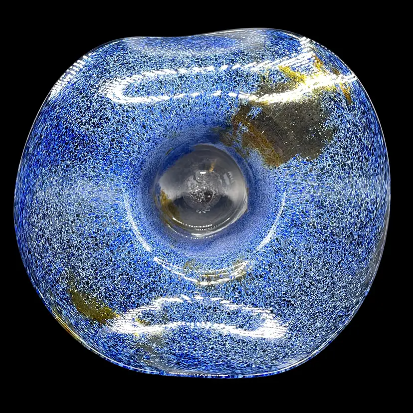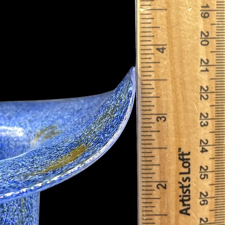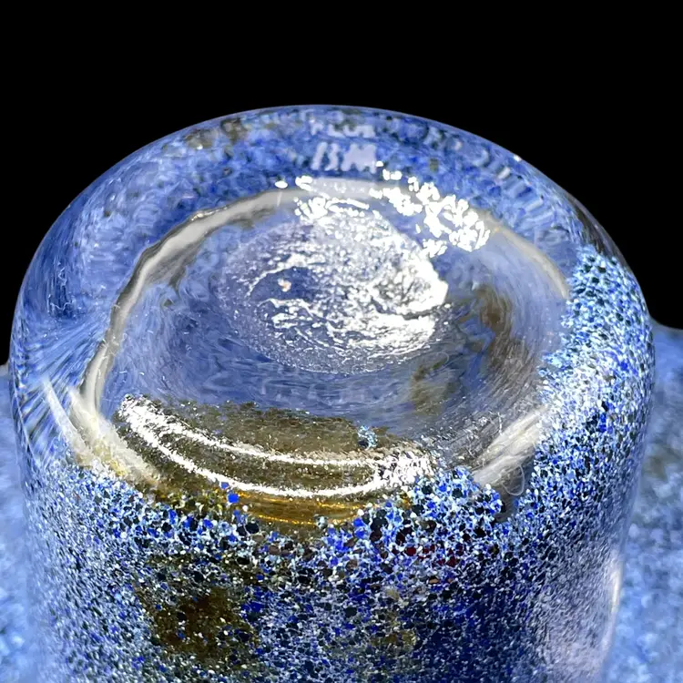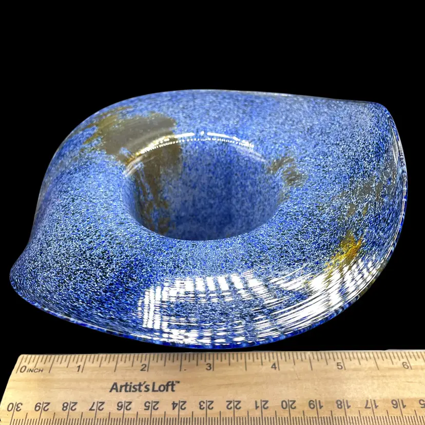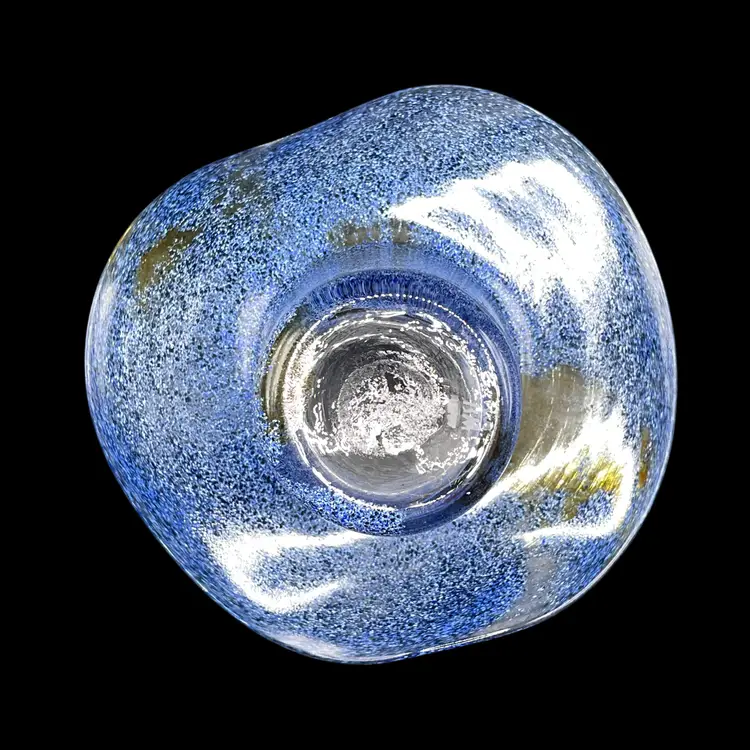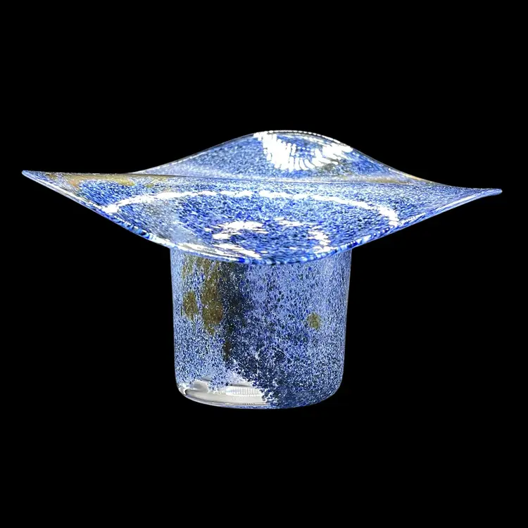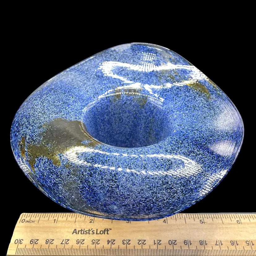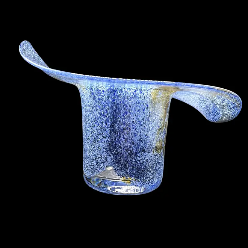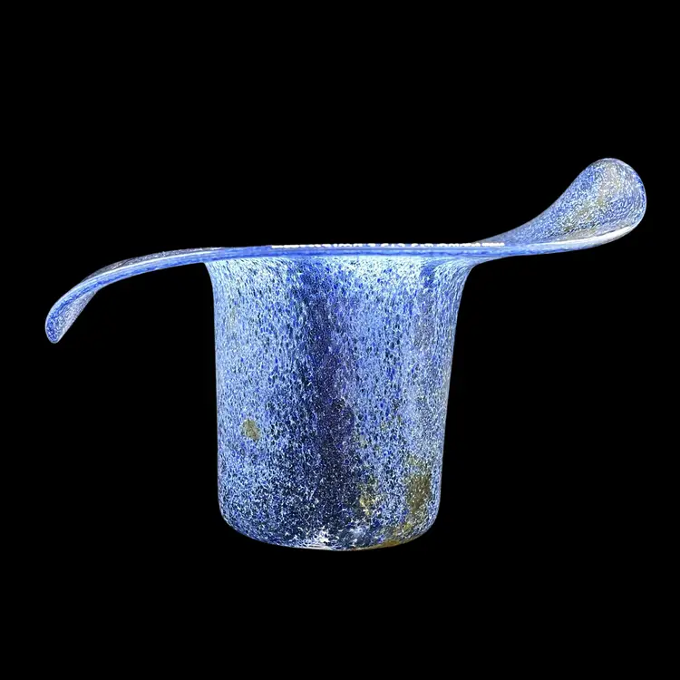 This Benny Motzfeldt hand-blown glass vase is a small, abstractly shaped piece with a textured finish. Made in Norway, the vase features a combination of blue, brown, and clear colors. Signed PLUS BM, this unique and handmade collectible is perfect for all occasions and adds a touch of elegance to any space with its artistic design and craftsmanship.