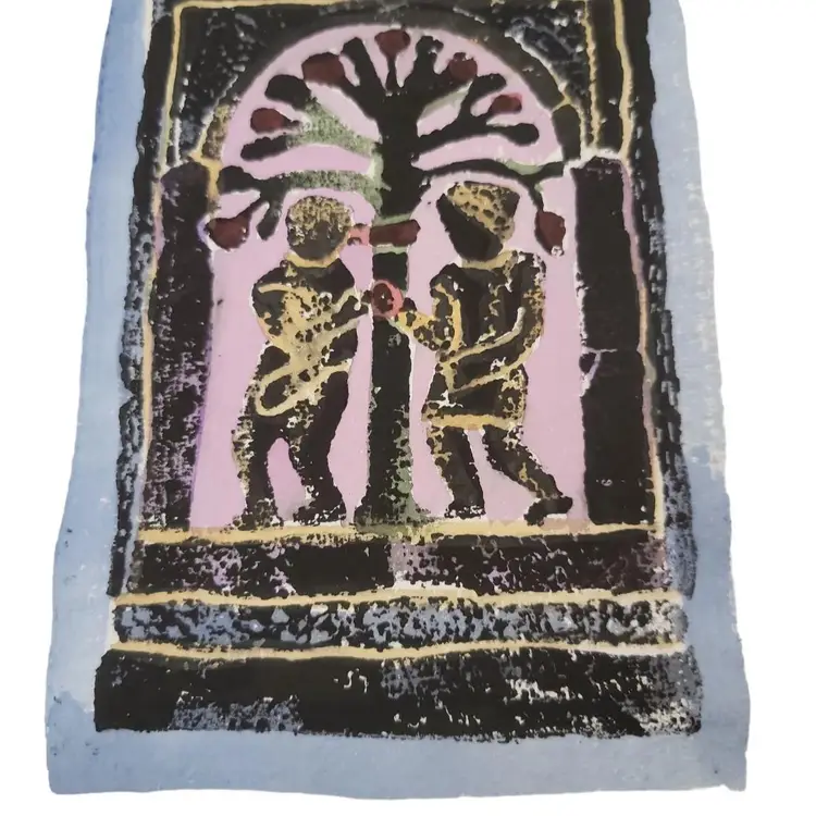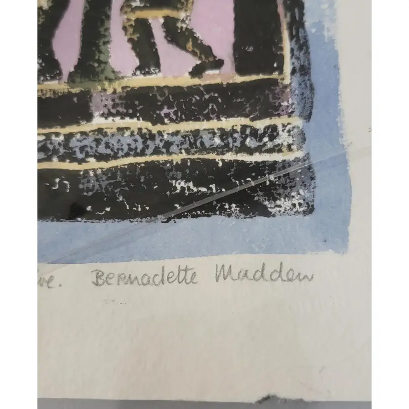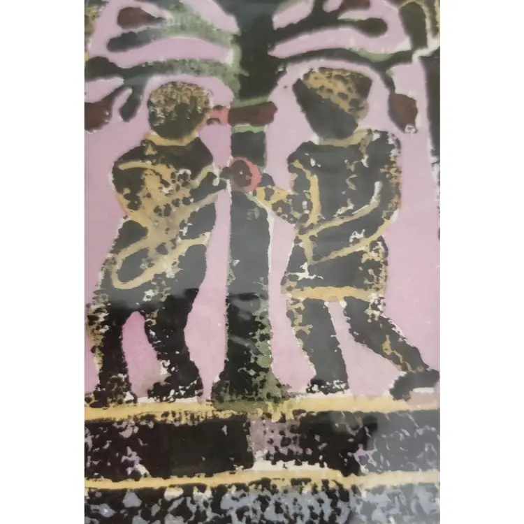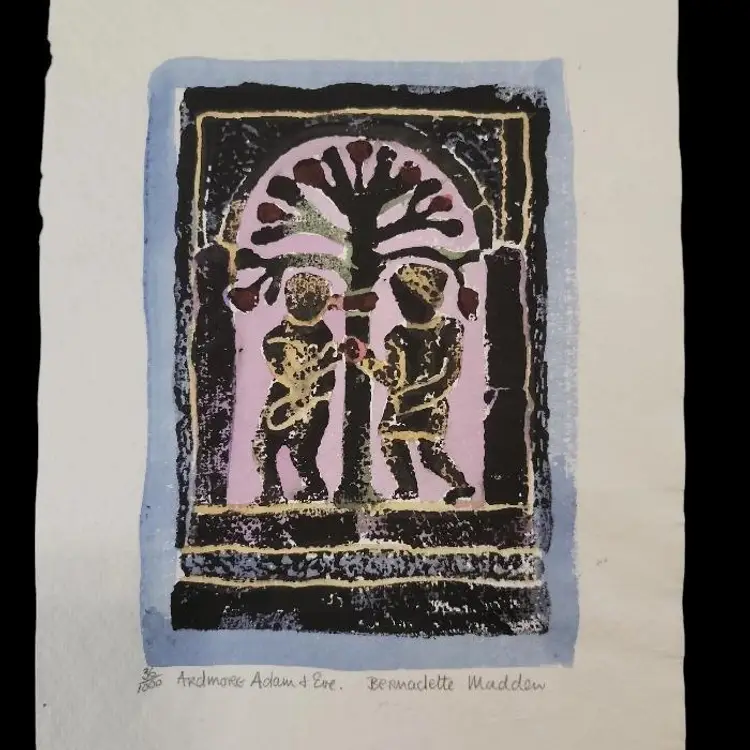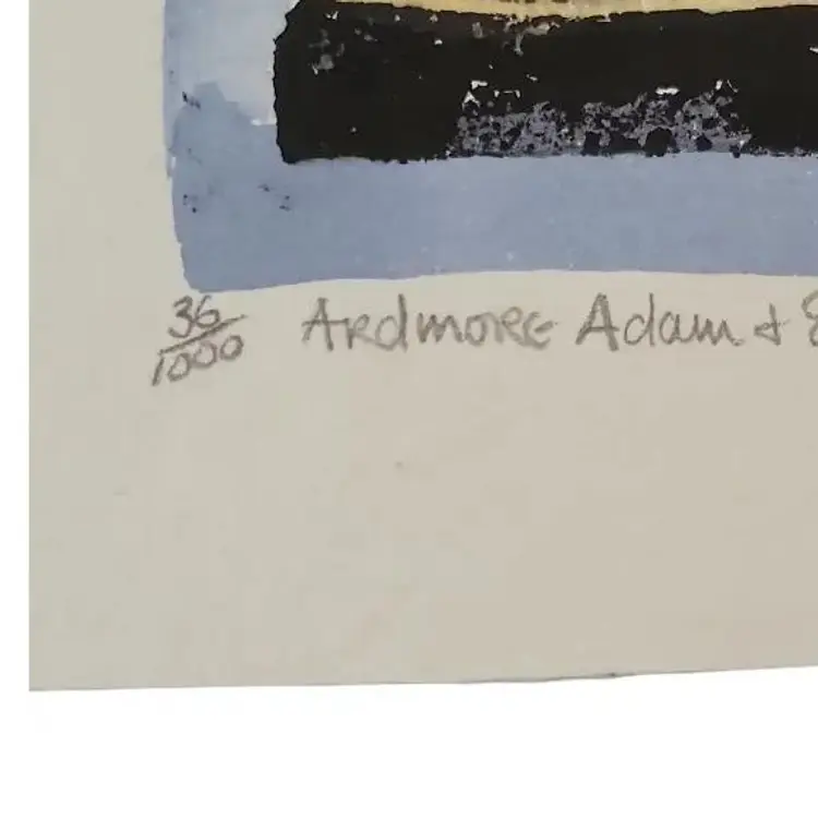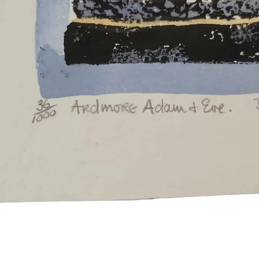 Original print pulled from black and color plates. Signed 36/1000 certified as limited edition seal on bottom right of print. It is very hard to see. Printed on what appears to be linen paper, titled "Ardmore Adam & Eve". There are three places where the paper has been damaged as shown in photos. All three could be hidden behind a slightly larger mat frame border. It appears to have some hand coloring but I can not be sure. See photos. This is an original 91/2" x 7 1/2" with a 13 x 10 1/2" mat. The print on the linen paper is approximately 7" x 5".