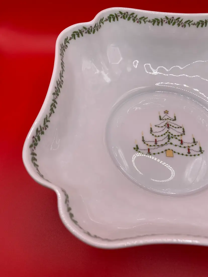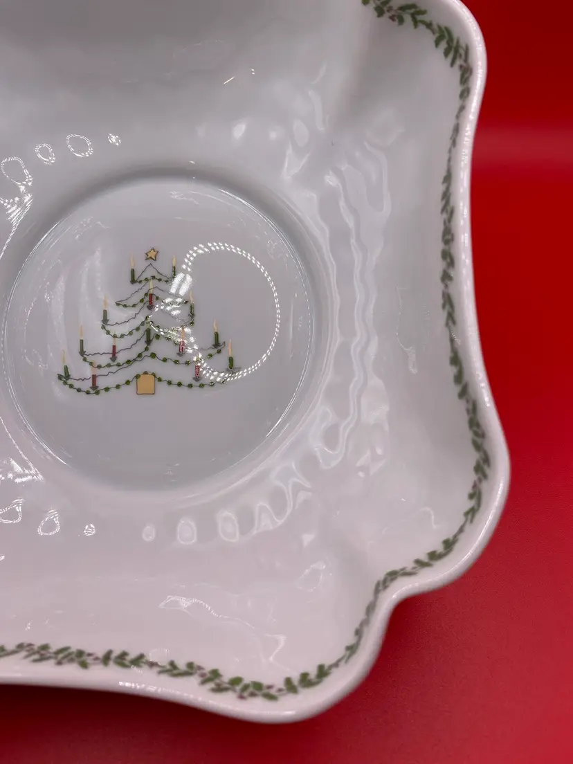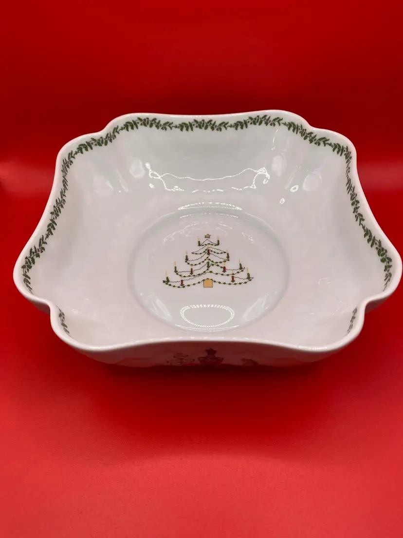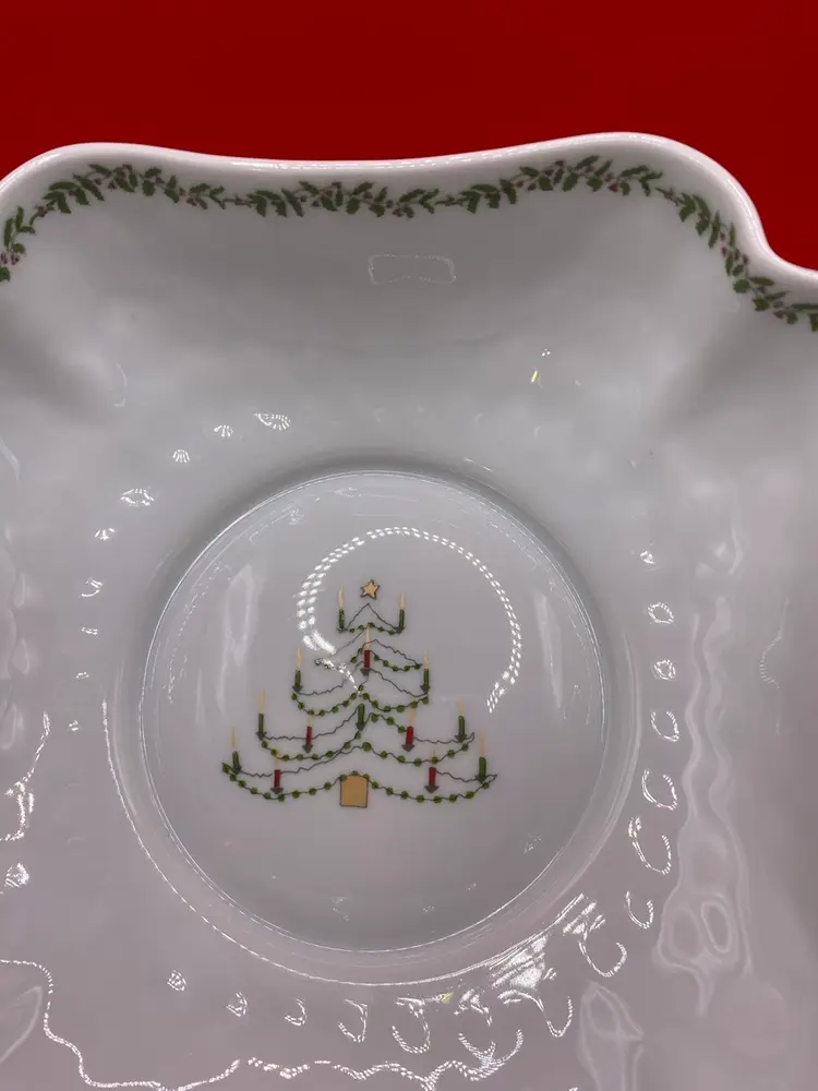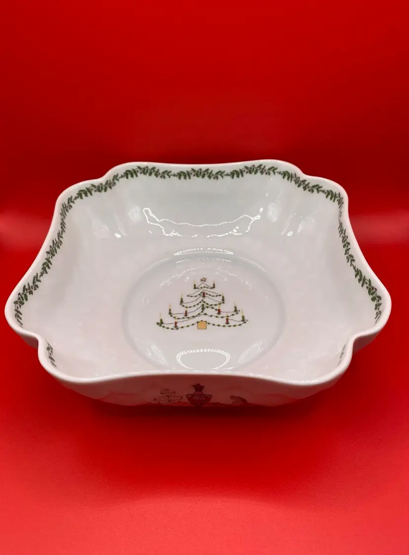 Beautiful holiday bowl in good condition. No chips or cracks. Bowl measures 6-1/2” x 6-1/2” x 2” tall.
