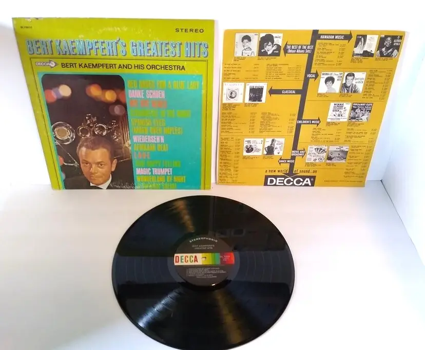 Artist: Bert Kaempfert And His Orchestra Speed: 33 RPM Record Label: Decca Release Title: Greatest Hits Case Type: Cardboard Sleeve Custom Bundle: No Color: Black Material: Vinyl Inlay Condition: Very Good (VG) Modified Item: No Edition: Live California Prop 65 Warning: No Type: LP Format: Record Record Grading: Very Good (VG) Language: English Release Year: 1966 Sleeve Grading: Very Good (VG) Record Size: 12" Style: 1960s, Ambient & Lounge, Exotica/Lounge, Jazz Features: Original Cover, Original Inner Sleeve Genre: Easy Listening, Jazz, Pop Country/Region of Manufacture: United States Number of Audio Channels: Stereo