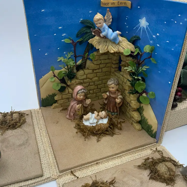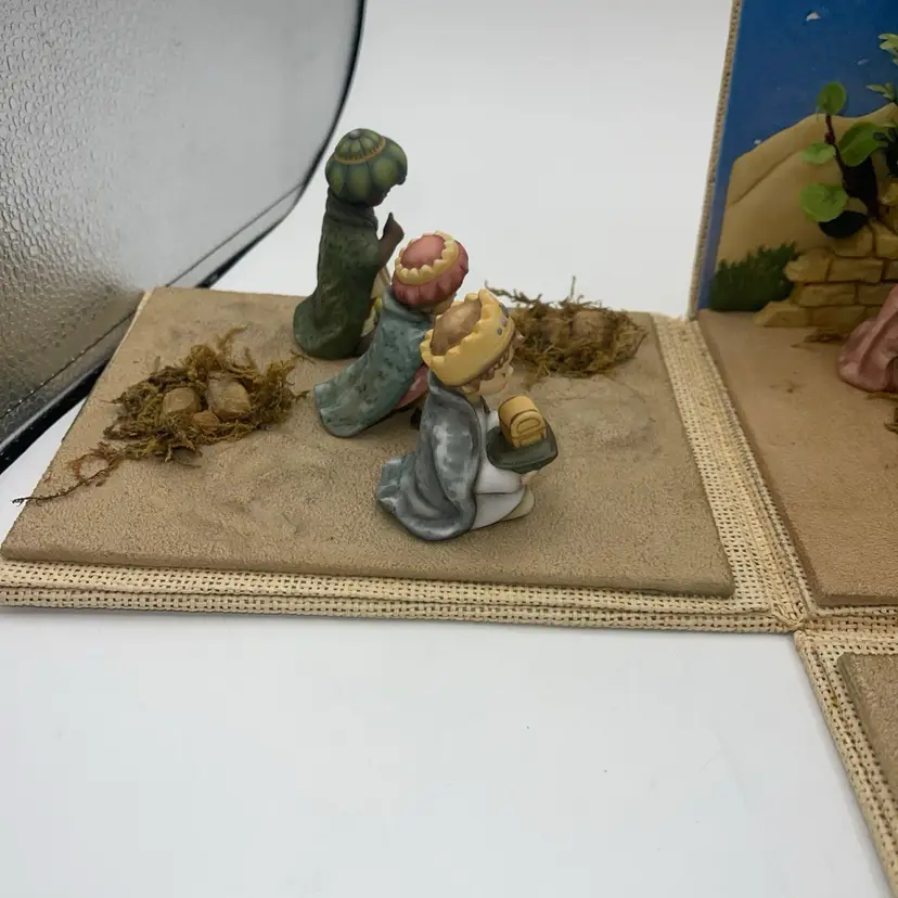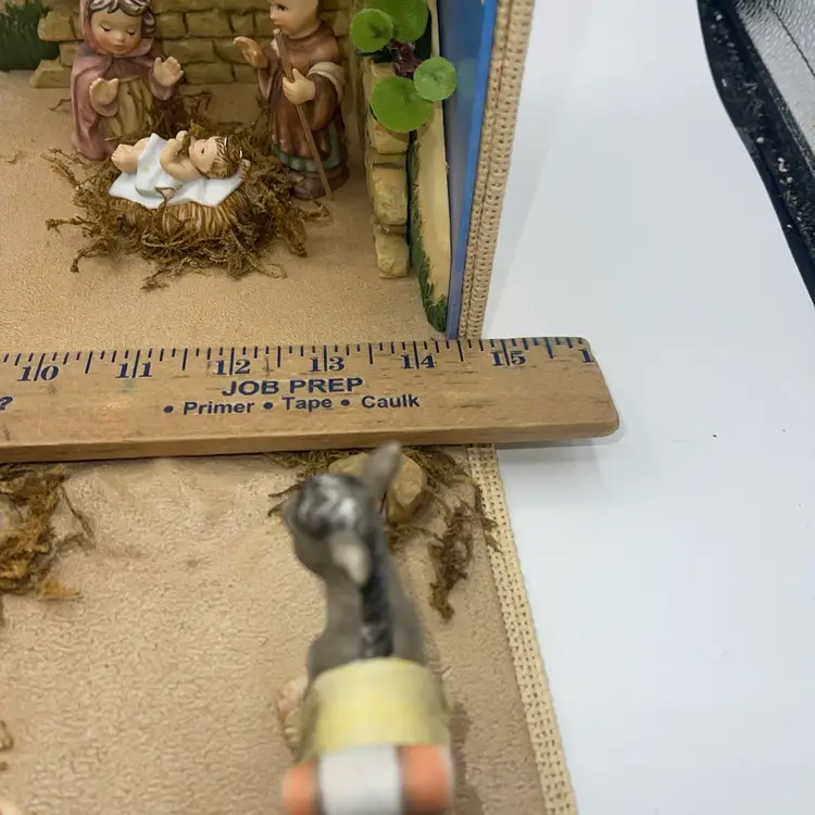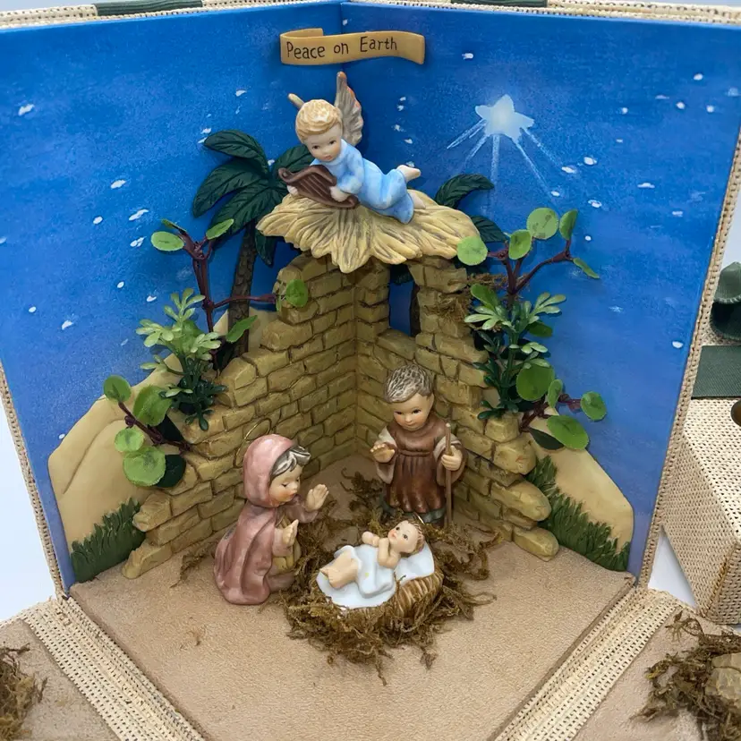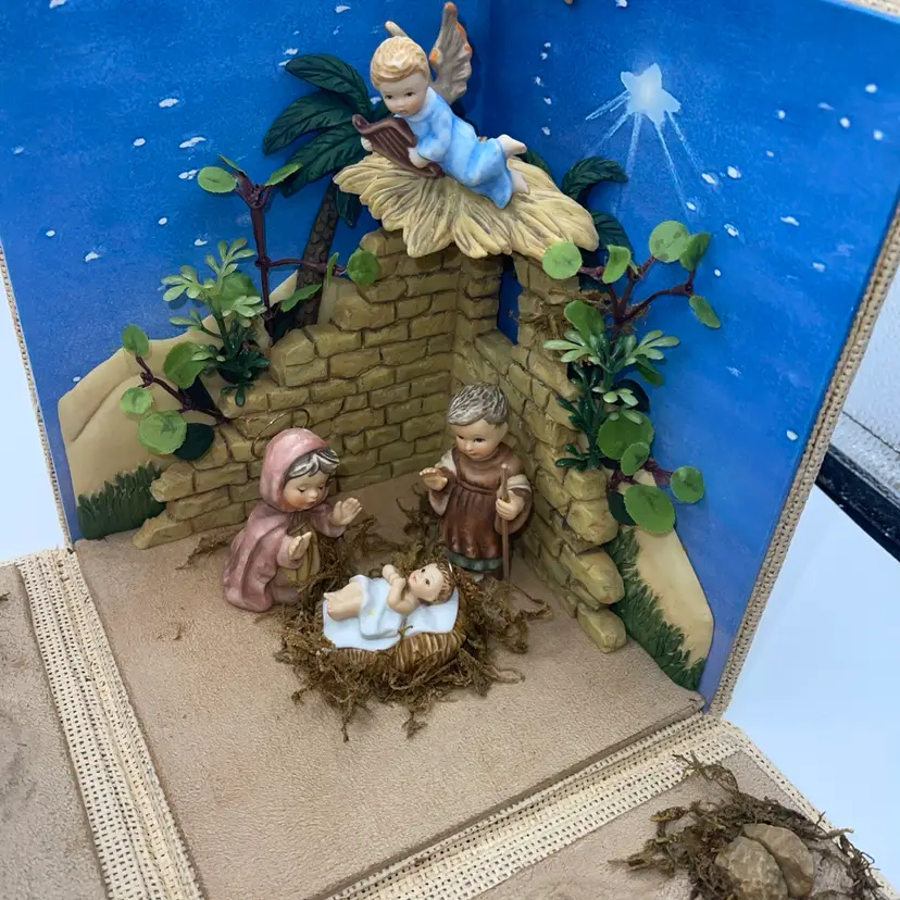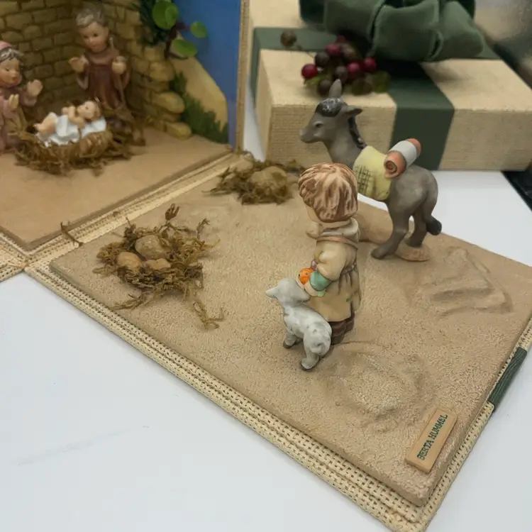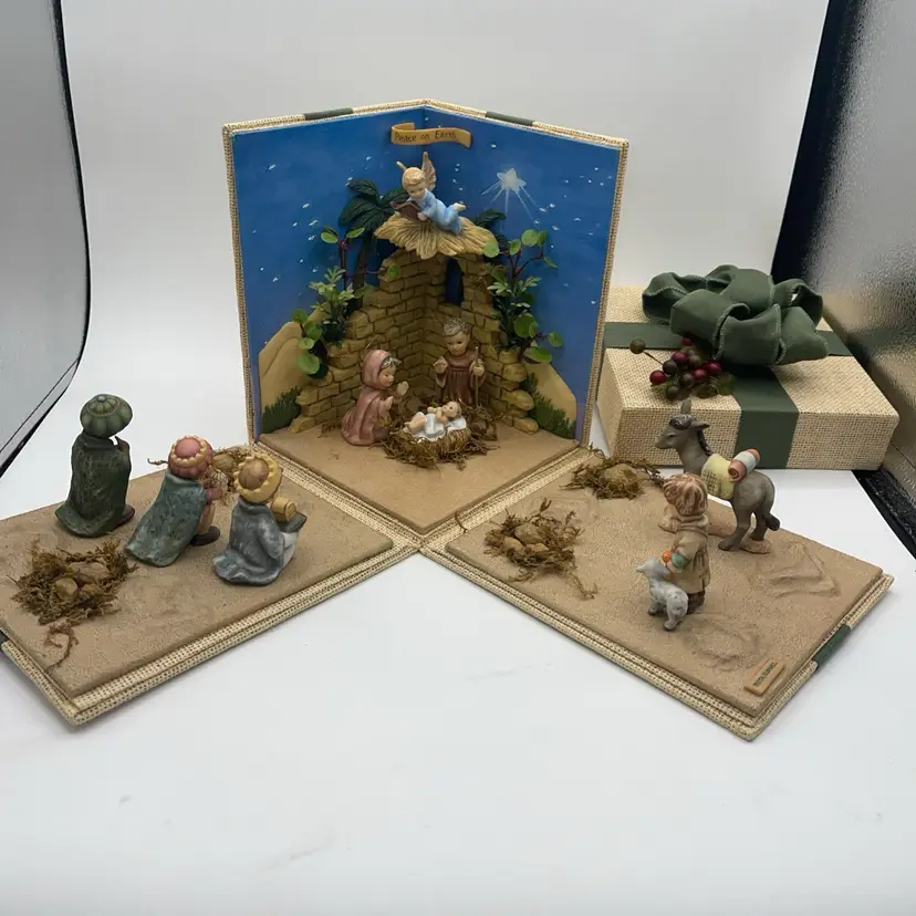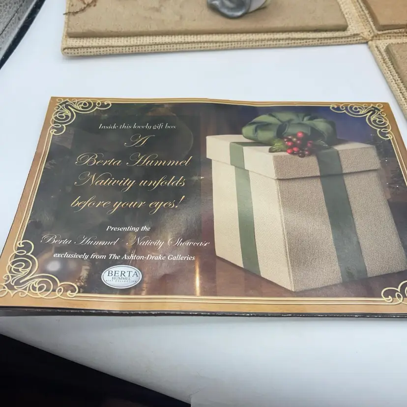 This is a gift box nativity you take off the top three sides come down in the nativity set is in place. All pieces are attached. There is no damage. It does come with the paperwork. It’s made by Berta Hummel and Ashton Drake galleries please see the photos ask any questions you may have