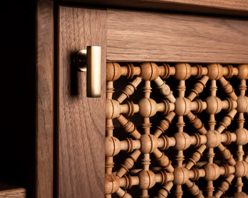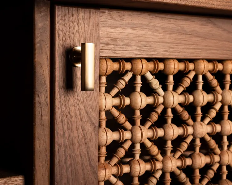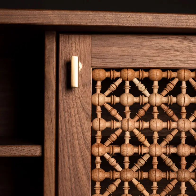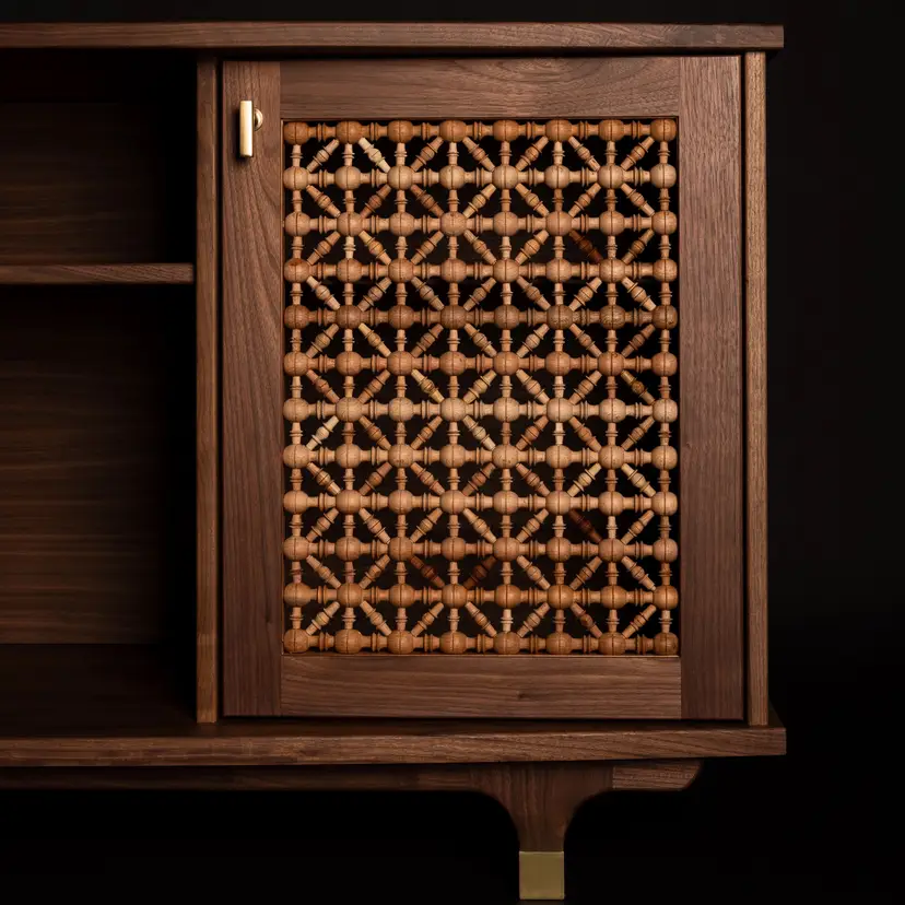 This bespoke record cabinet is handcrafted from solid walnut and features two doors with a center panel custom made from Egypt to reflect the client's personal connection to the region.