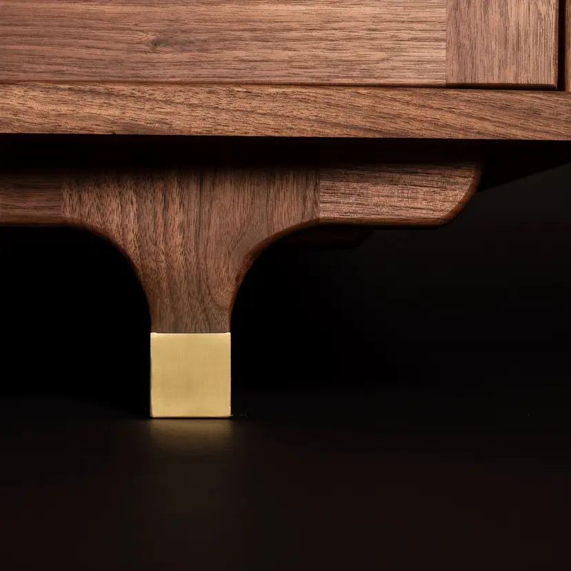 Brass hardware and feet provide a warm contrast to the walnut's rich tone, while the curved radius along the top and bottom softens the silhouette and adds dimensionality. Designed to complement the aged character of the client's home, this piece captures the charm of heritage furniture with a refined, contemporary build.