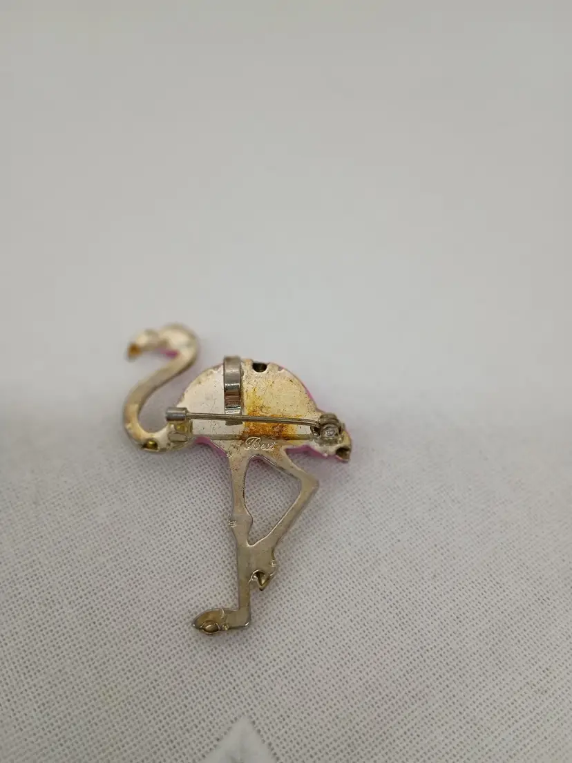 BEST Silver Tone Metal Pink Enamel Flamingo PIN Brooch Pendant. This is 2 inches tall and about 1.5 inches side to side. This is preowned, Unknown metal . Enamel is intact. pin back intact and works smoothly. This also has a hanger loop and can go on a chain. Excellent condition. Ships USPS
