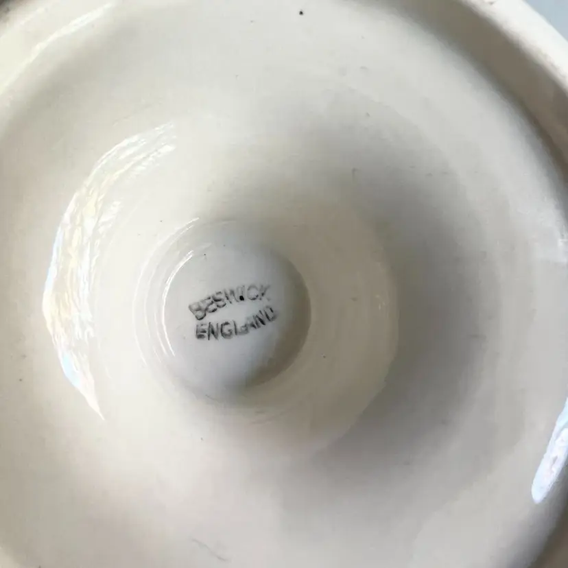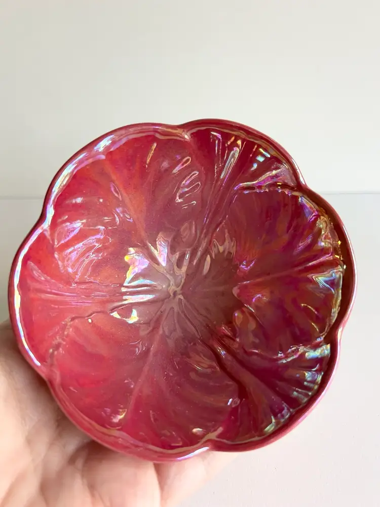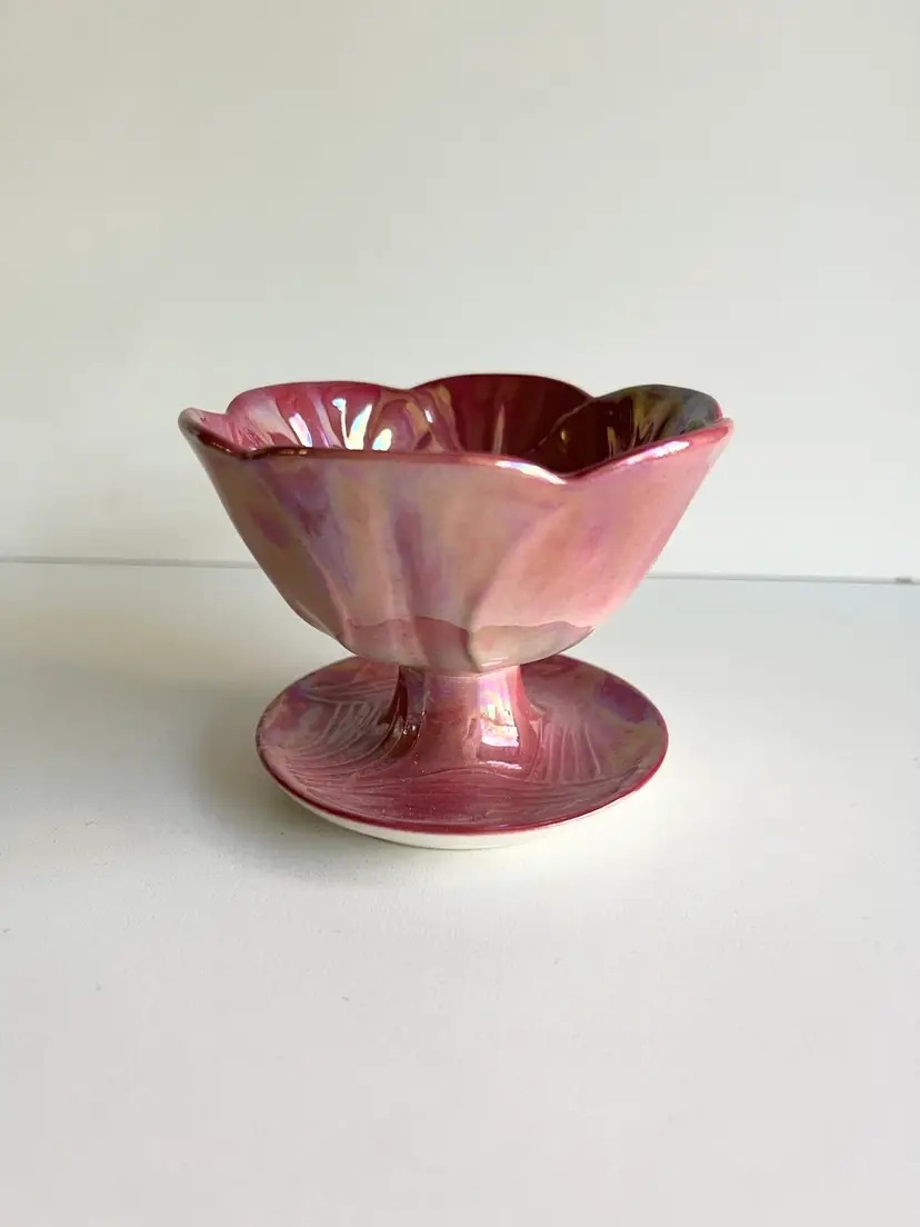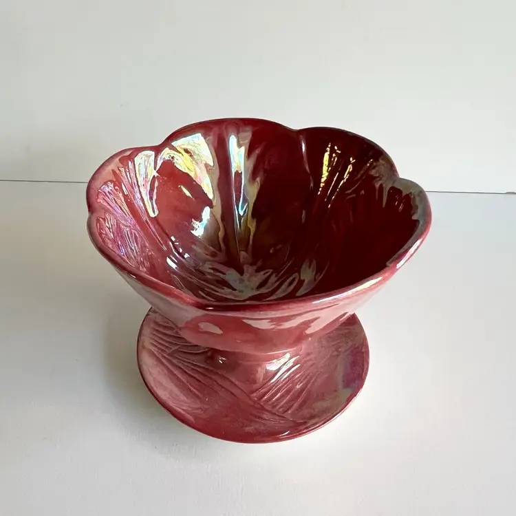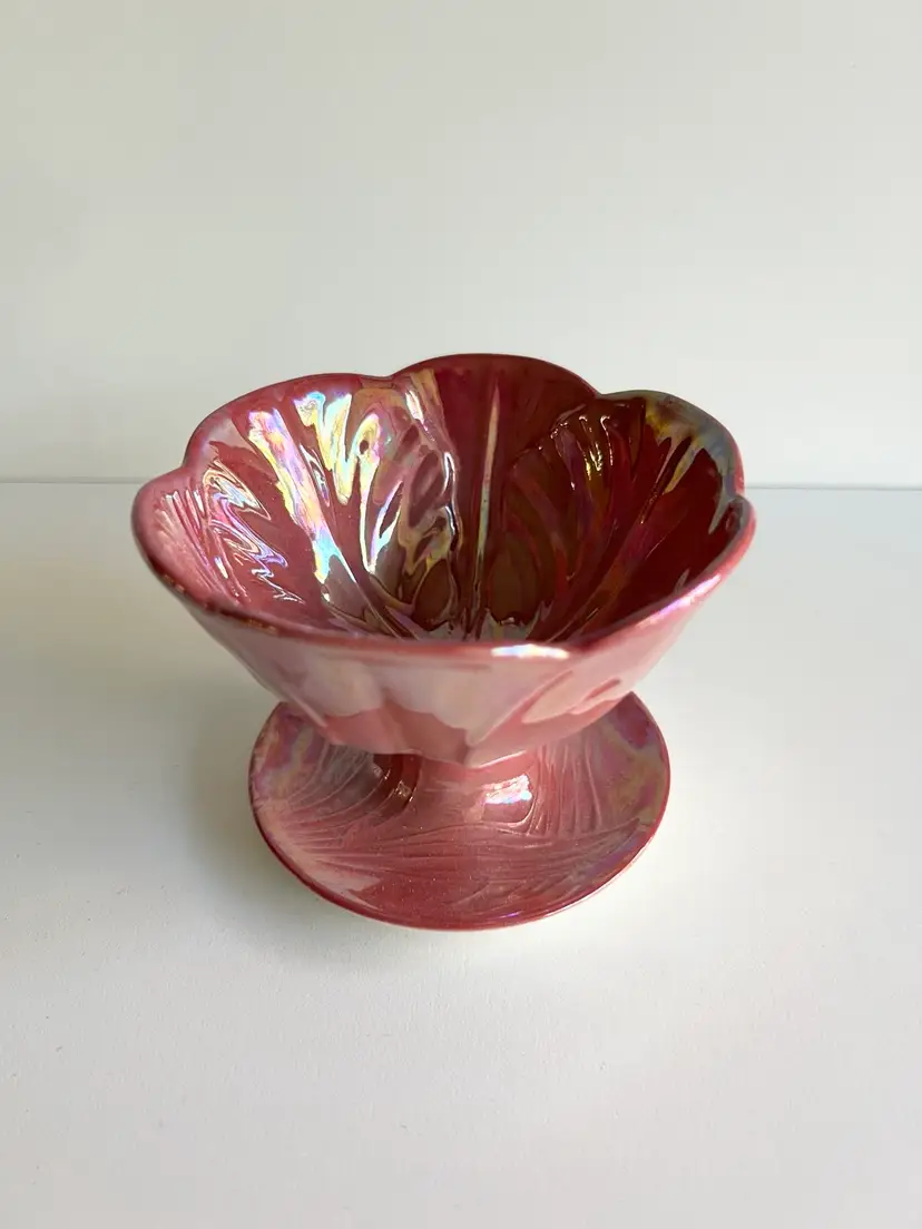 This is one special little compote! The design is textured with a cabbage leaf pattern and the iridescent glaze in a deep pink is really pretty. You could serve your ice cream in this dish or use it as a soap dish or to store your rings or other small objects. 4 1/4“ wide x 3 1/4“ tall. Great condition. Ships from Canada.