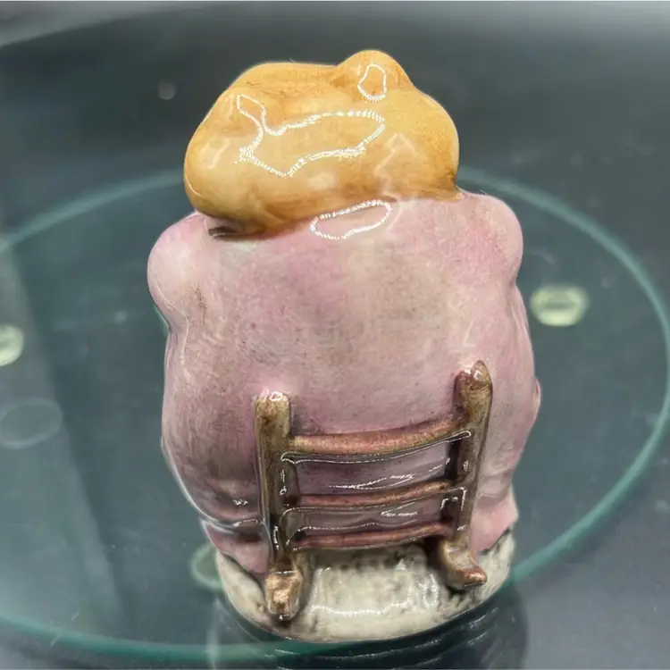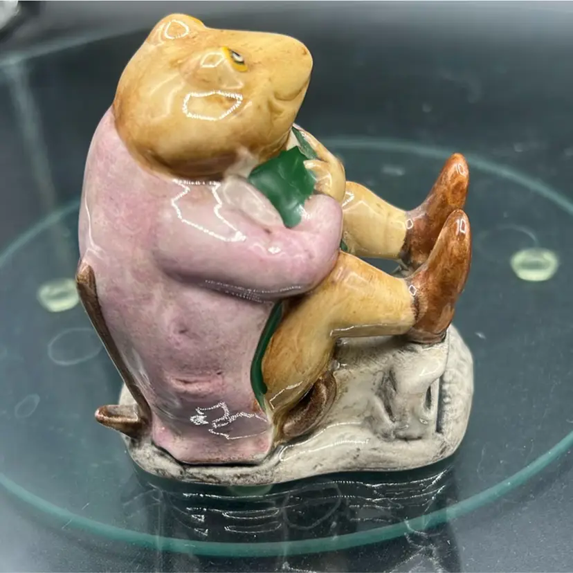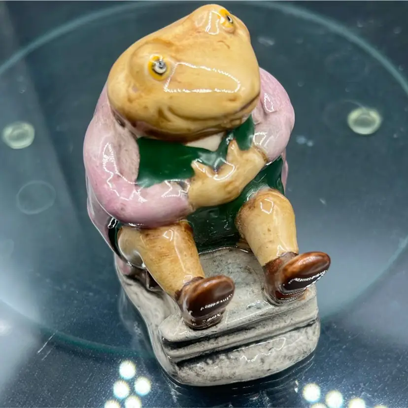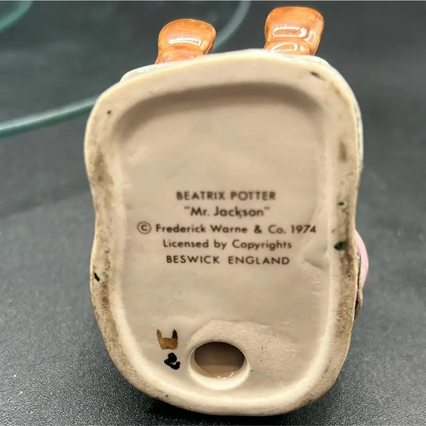 This is a Beswick or Royal Albert Mr. Jacksonfigurine, based on the artwork of Beatrix Potter. • The figurine depicts a brown toad wearing a mauve (pink) jacket and green vest. • It was modeled by Albert Hallam. • The second version, which this appears to be, was issued between 1975 and 1997. • It typically stands around 2.75 to 3 inches tall. • The specific backstamp (e.g., Beswick or Royal Albert, and the copyright year) can be found on the underside. IN EXCELLENT CONDITION Please feel free to ask any questions Thank you for your time and interest Blessings, Bonnie & Darren :-)