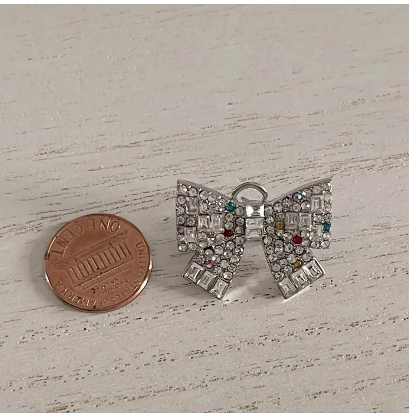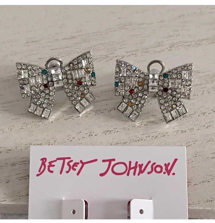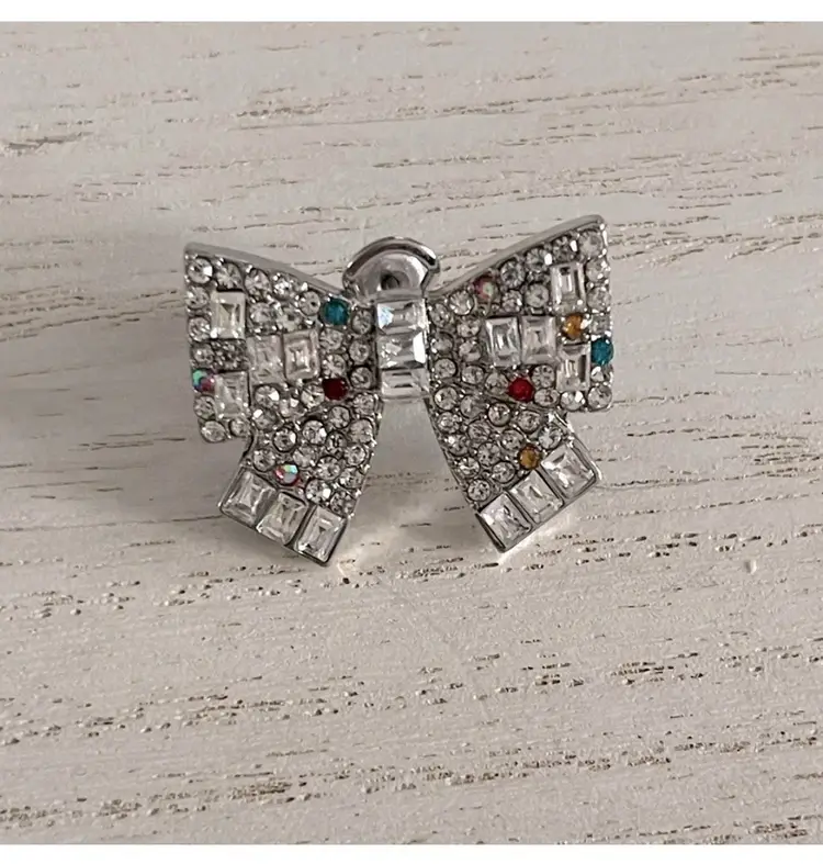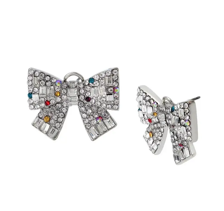 Glistening button earrings featuring crystal stone bow adorned with pops of scattered colored stone accents. These charming earrings are set in silver-tone metal and have an omega post closure.