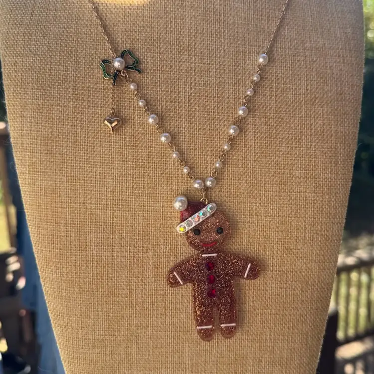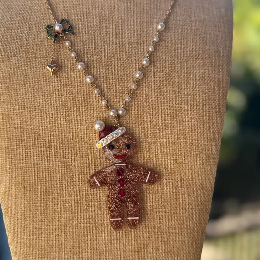 Perfect condition gingerbread man holiday necklace. Measures 32 inches with the 2 inch extender. Great for Christmas!