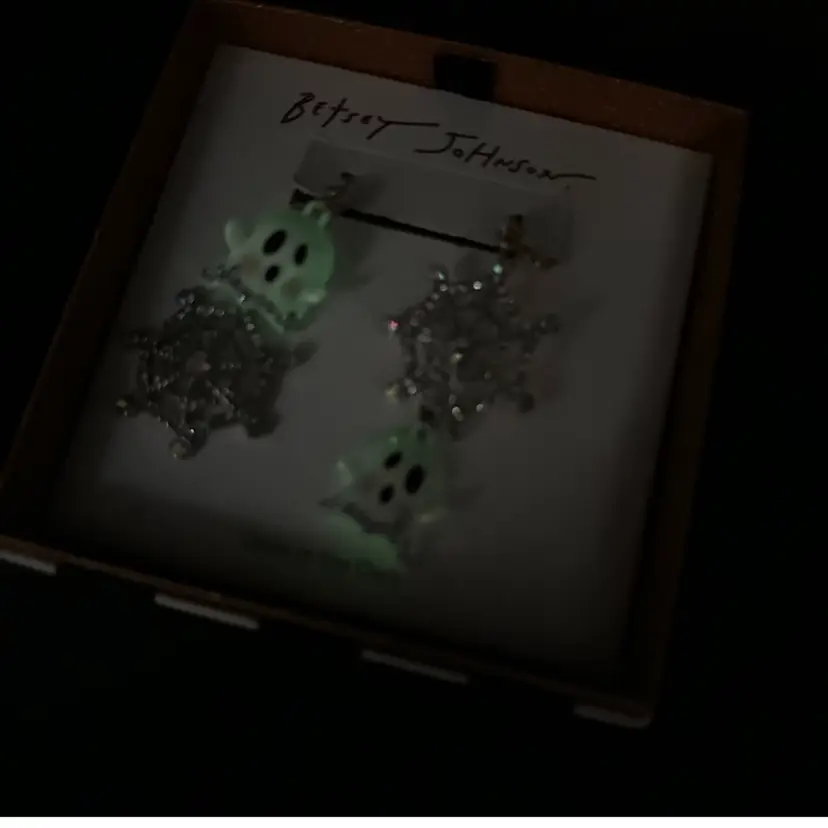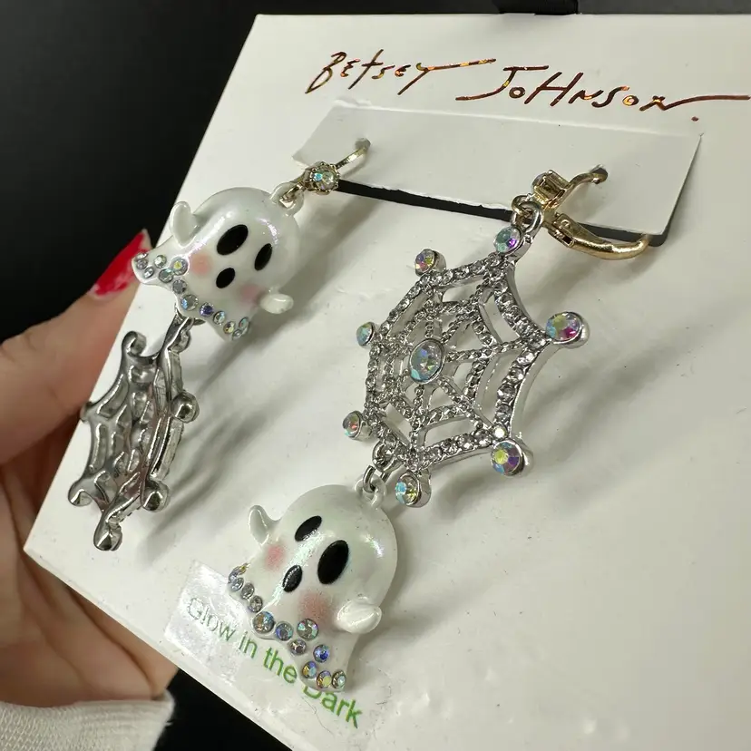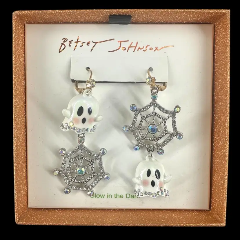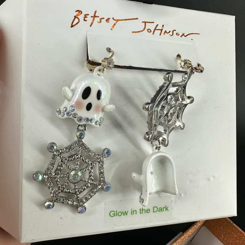 Pair Betsey Johnson dangle earrings featuring glow in the dark ghost pendants and spider web pendants with fake gemstone decoration. Dangle pendants measure approximately 2” long. No missing gemstones, some wear on ghosts. Not sterling silver. In original box.