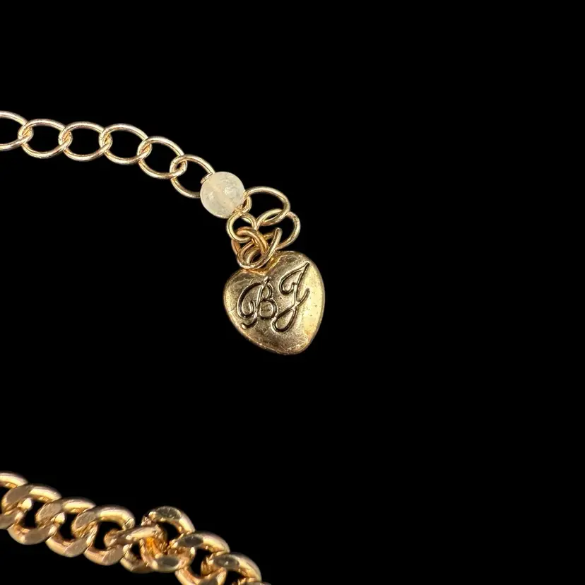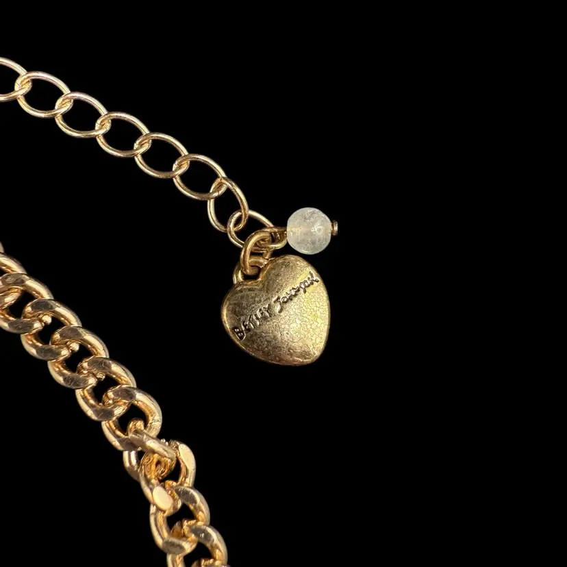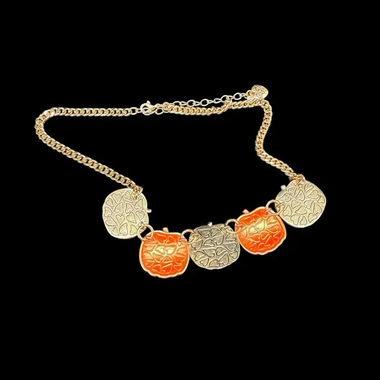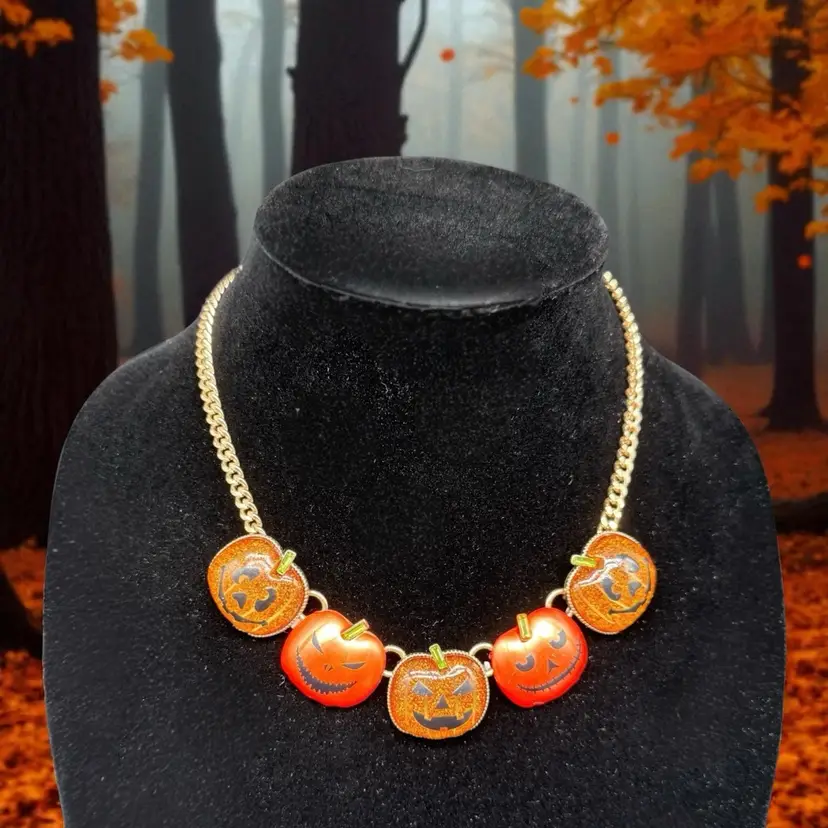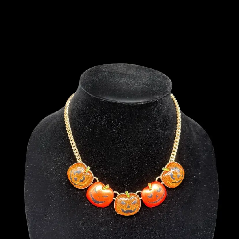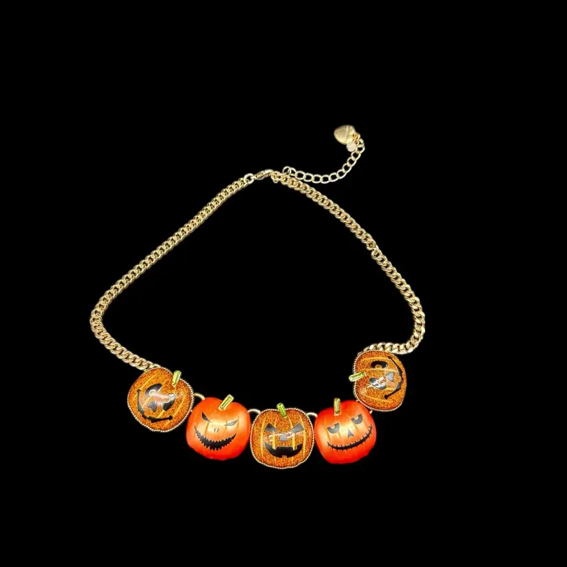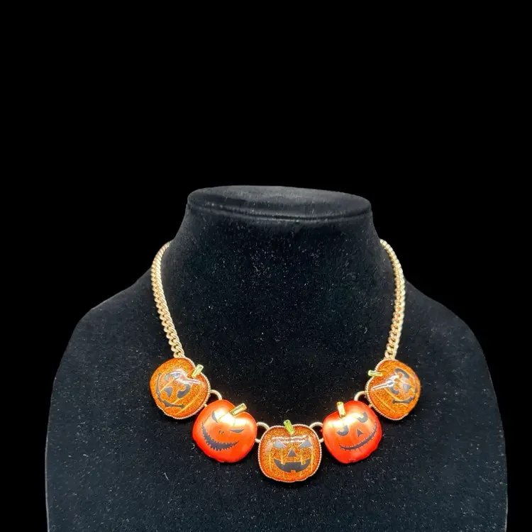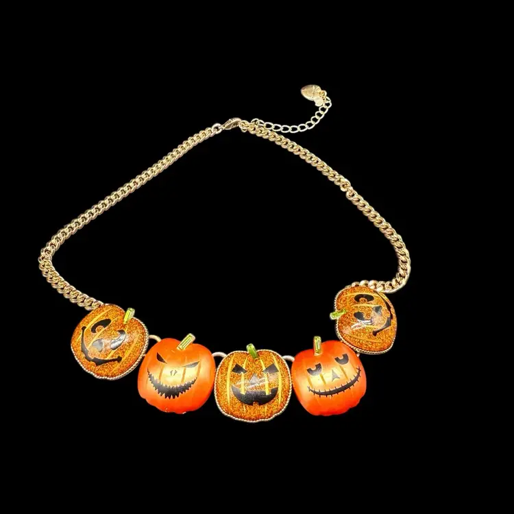 The Betsey Johnson Gold Tone Enamel Pumpkin Jack O Lantern 5 Pendant Necklace is a rare and whimsical piece of jewelry perfect for everyday wear, Halloween, or any occasion. The statement necklace features 5 charming pendants in the shape of a pumpkins, made of orange enamel on a gold tone metal base. It is signed either a lobster clasp and comes on a 32-inch curb link chain, making it a unique and hard-to-find accessory that will add a playful touch to any outfit.
