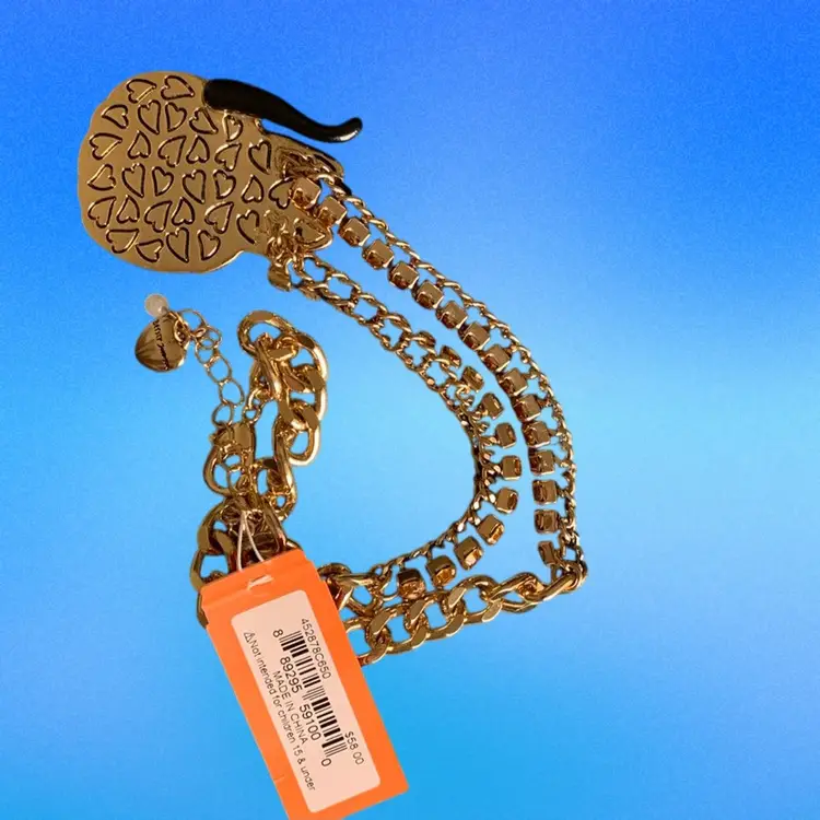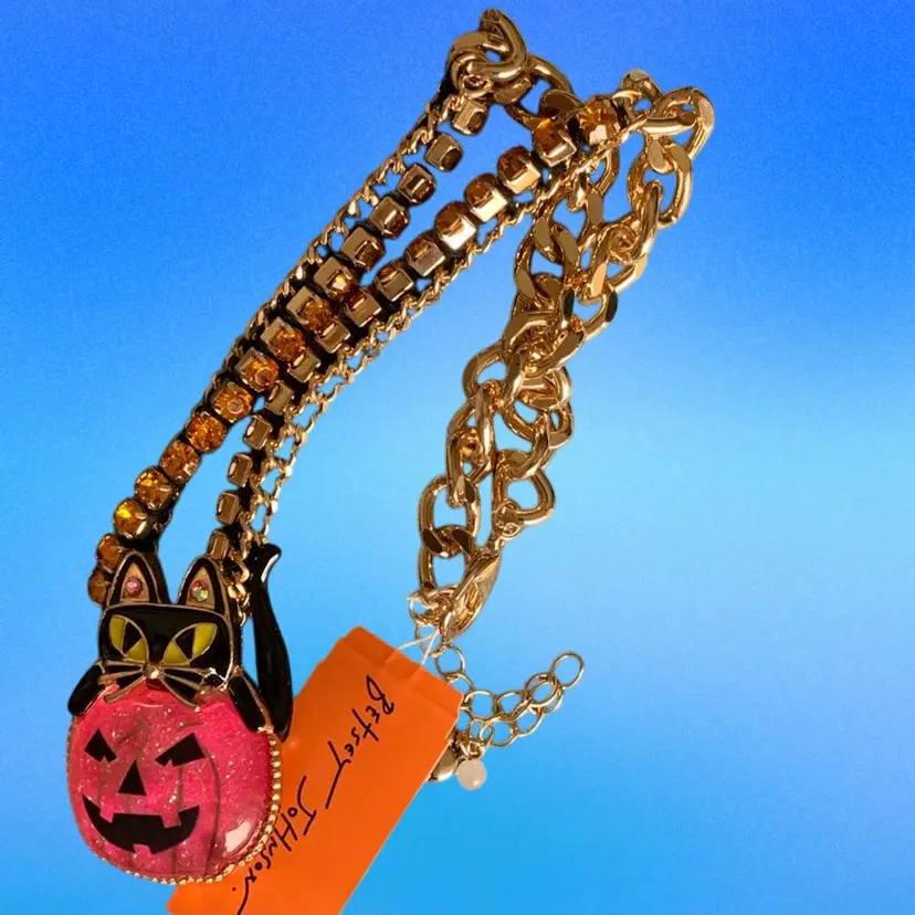 Betsey Johnson Gold Tone Jack-o’-lantern And Black Cat Necklace With Orange Crystals On 1/2 Of Chain 18” L 3” Extension