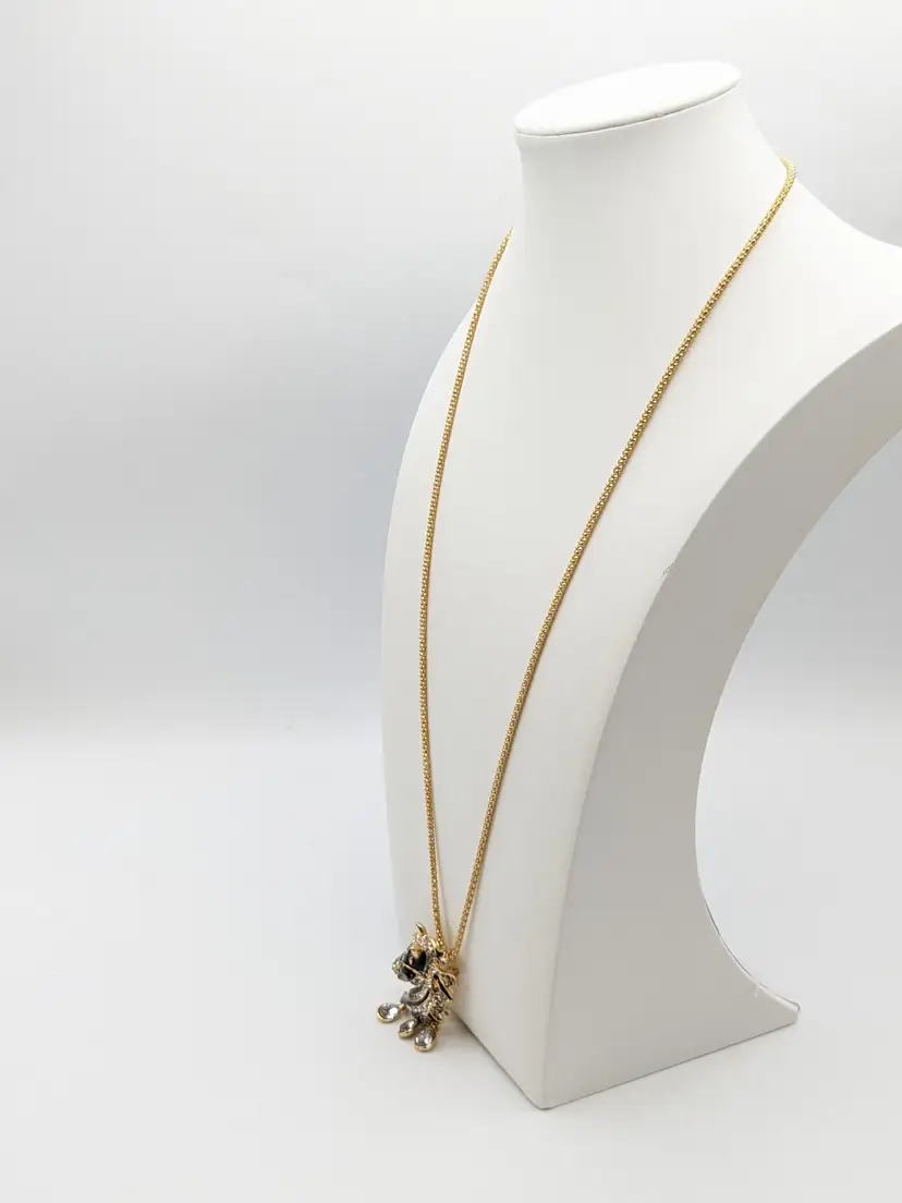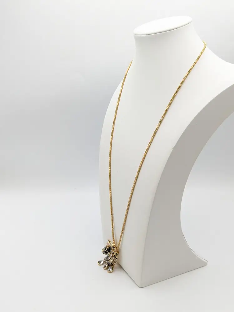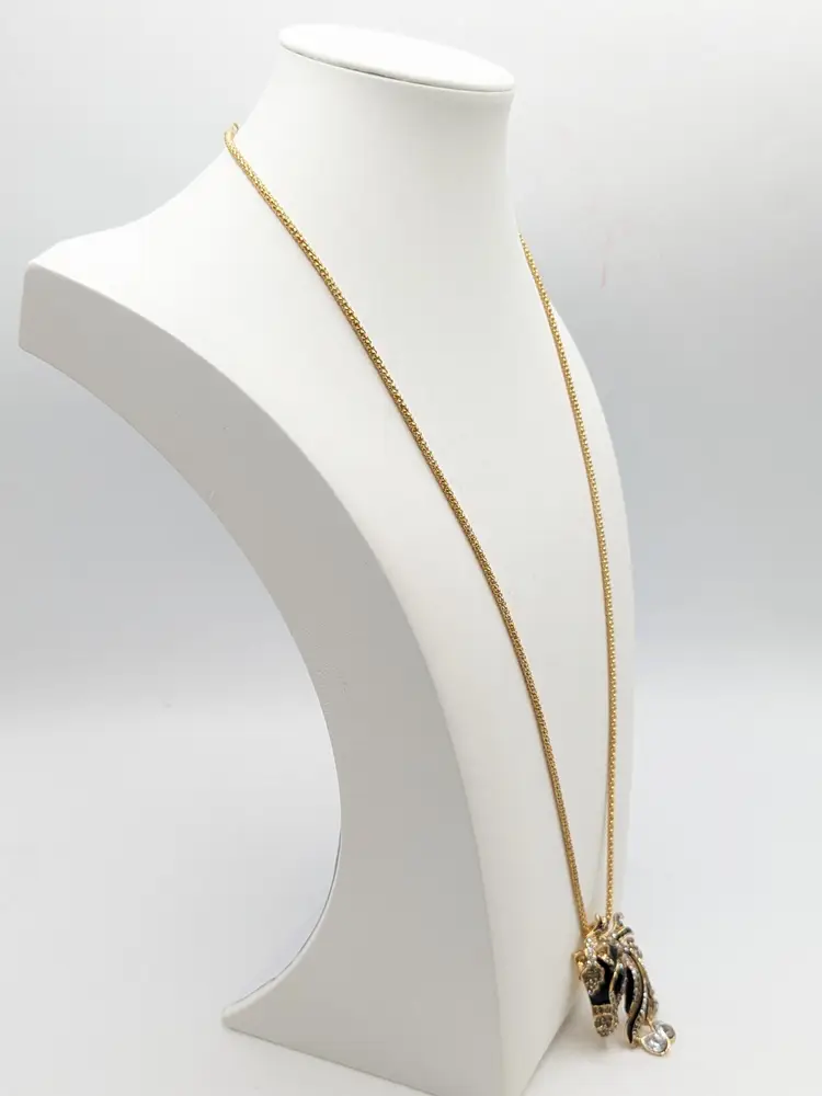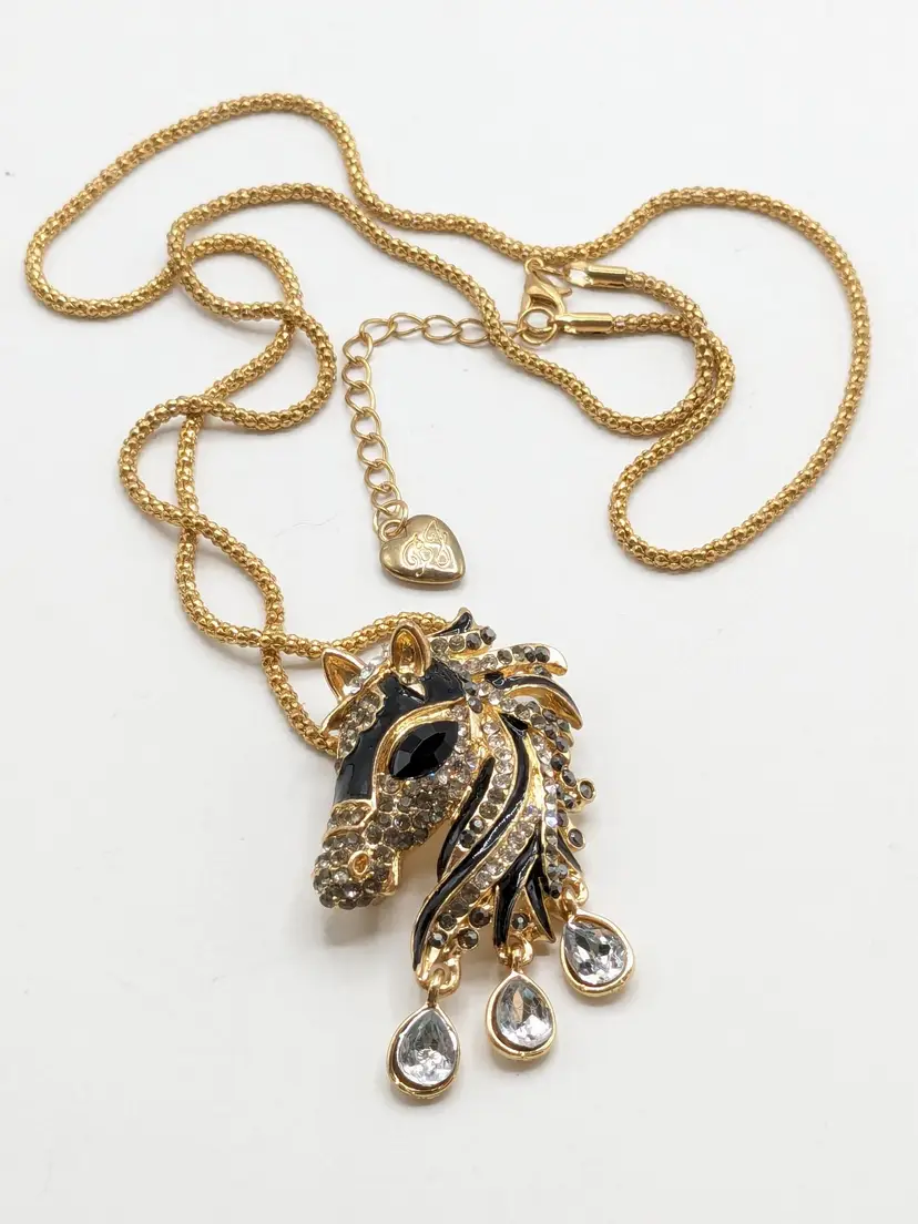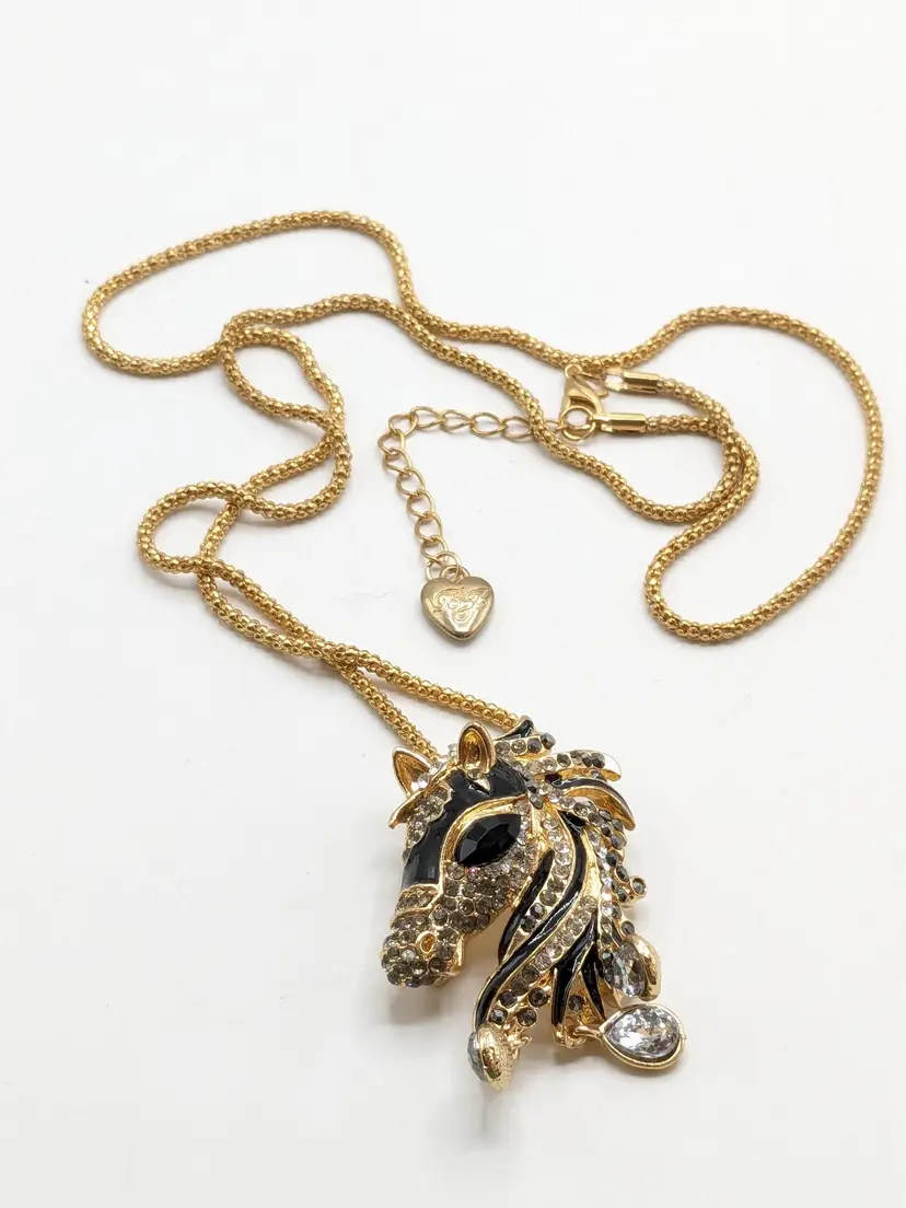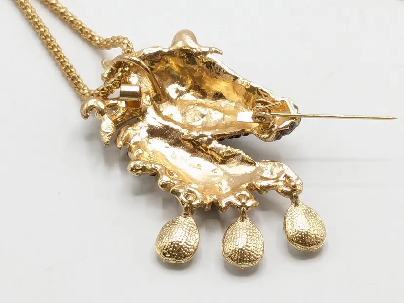 Good condition. Signed Betsey Johnson. Combination necklace or brooch. Gold tone. Chain measures 28" + 2 1/2" extension. Pendant/brooch measures 2 1/4" length and 1 1/4" wide.