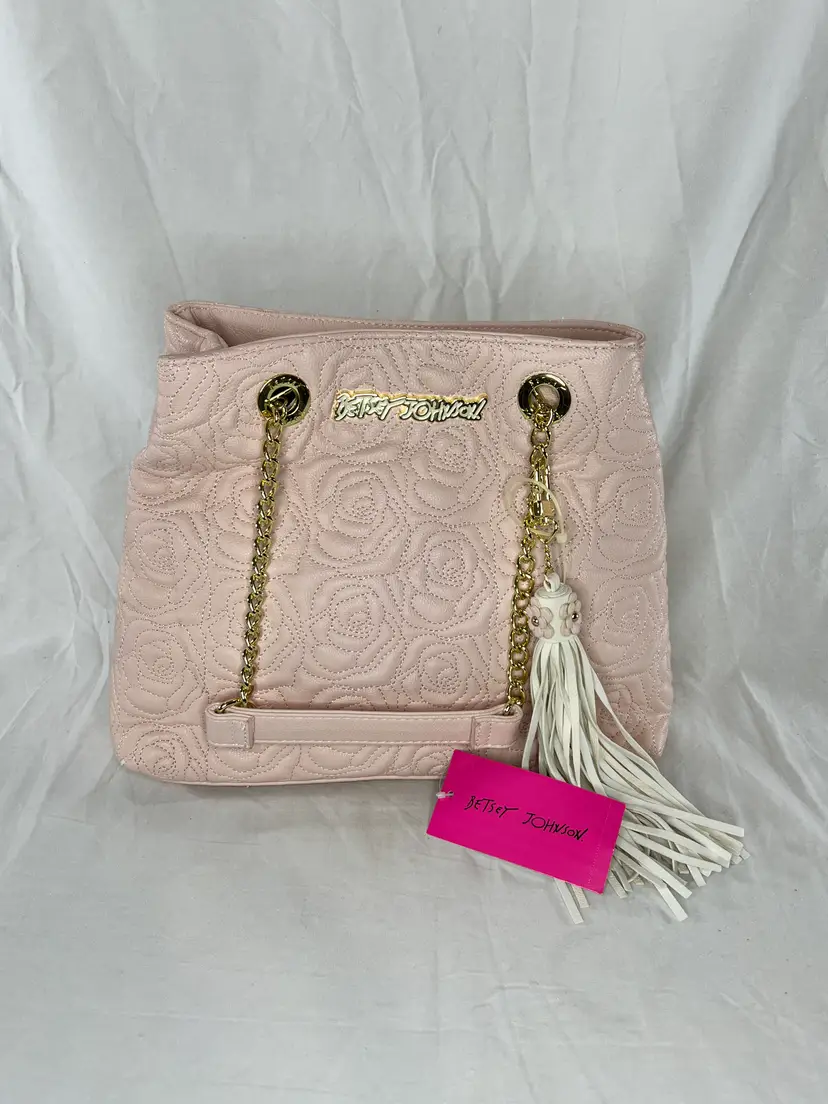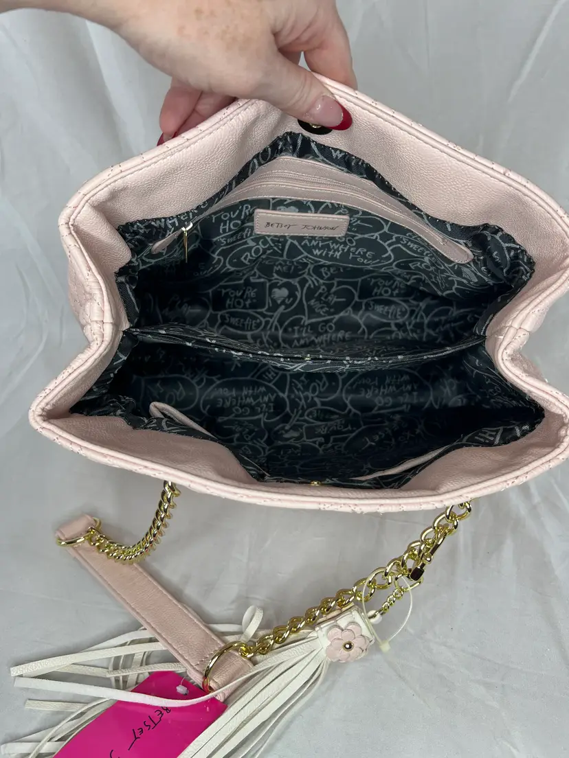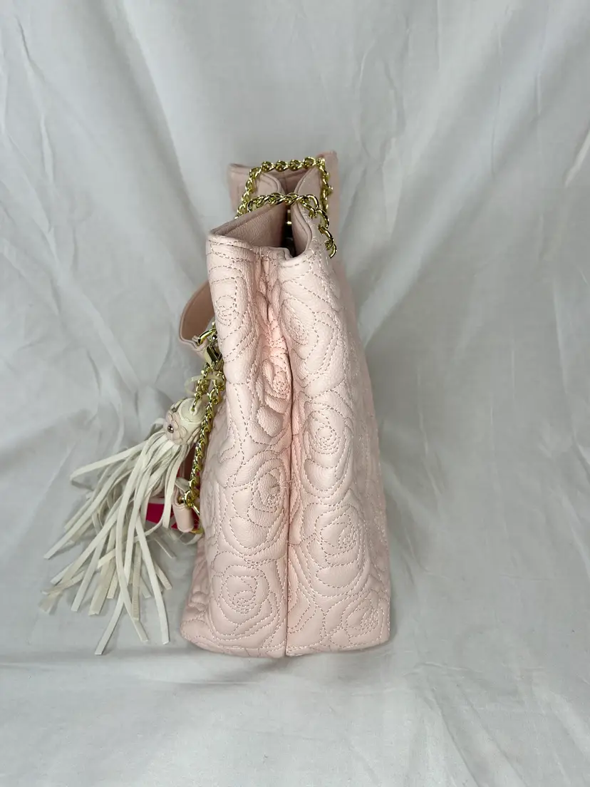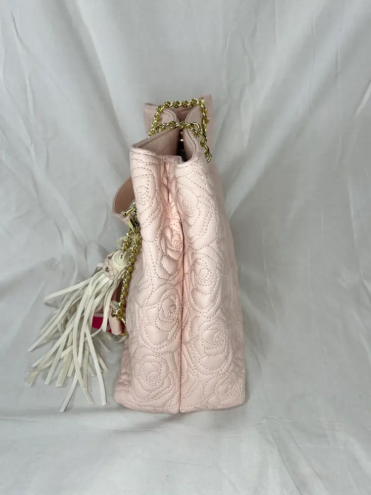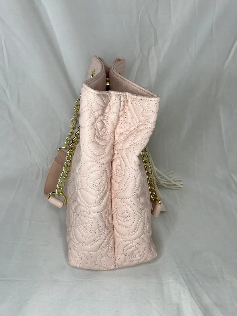 New with tags Betsey Johnson shopper tote featuring a blush pink quilted rose pattern, gold chain straps, and tassel charm. Stylish, lightweight, and easy to carry.