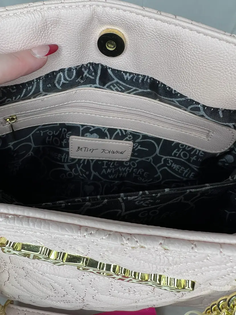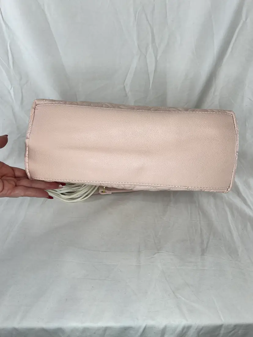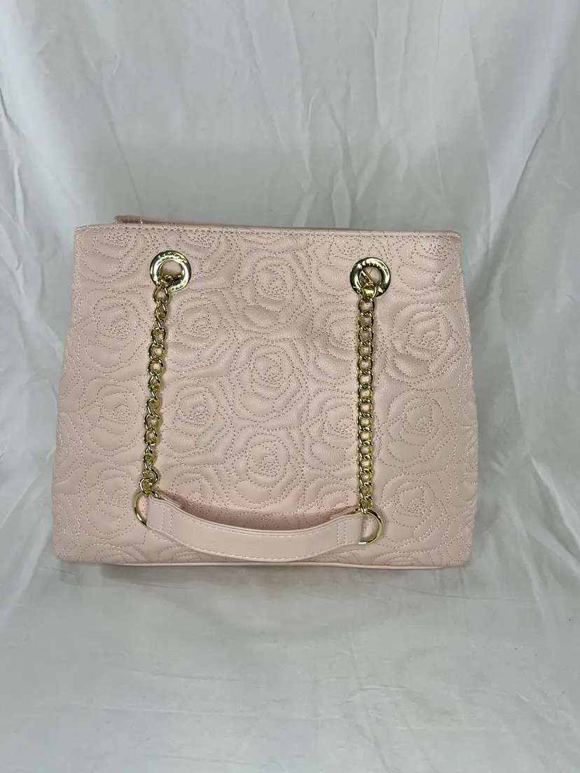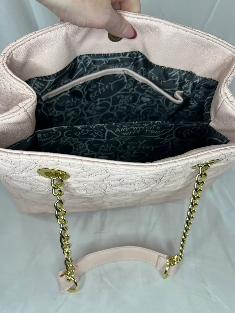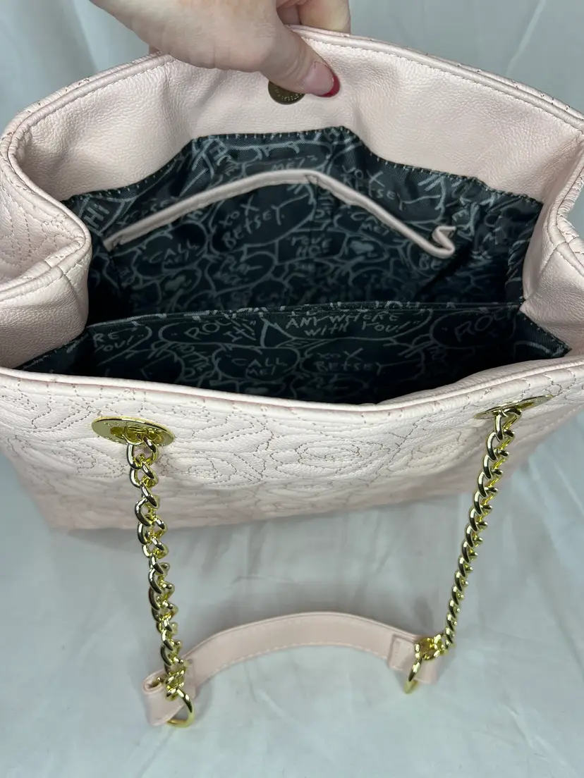 New with tags Betsey Johnson shopper tote featuring a blush pink quilted rose pattern, gold chain straps, and tassel charm. Stylish, lightweight, and easy to carry.