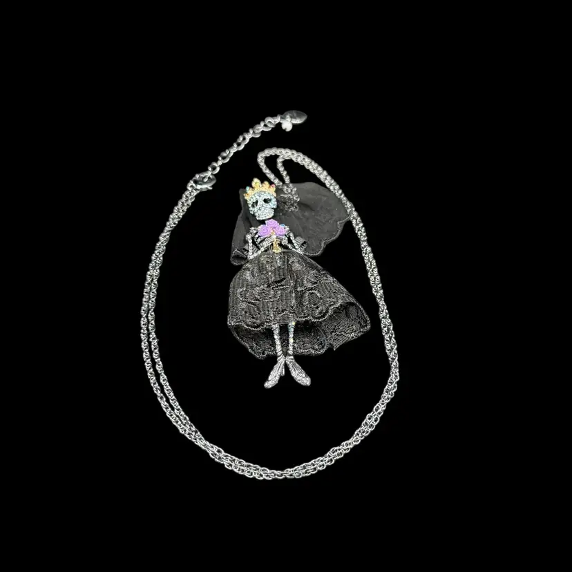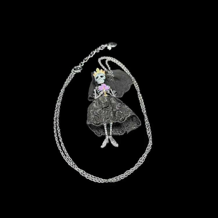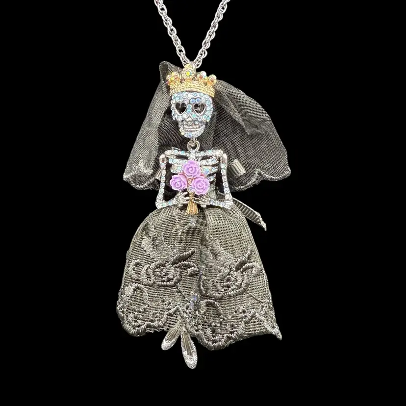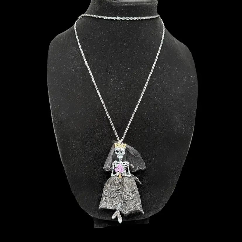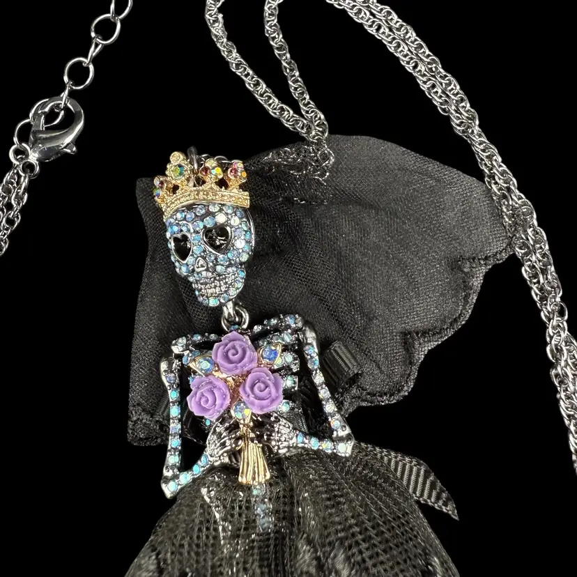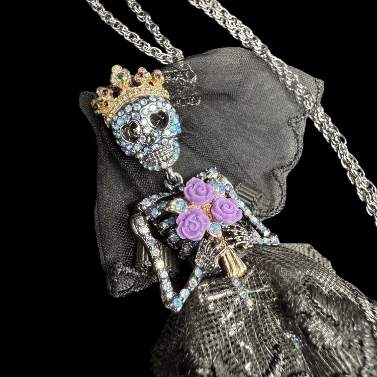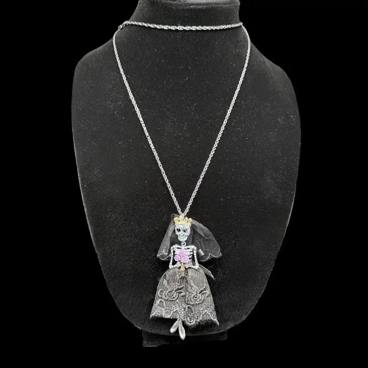 The Betsey Johnson Skeleton Bride Goth Crystal Day of the Dead Halloween Necklace is a captivating and whimsical piece of jewelry. Made with enamel, and crystal rhinestones, the pendant features a skeleton shape with multicolor crystals, dressed in a black skirt & veil. The necklace is signed and has a lobster closure. With a length of 38 inches and a hematite tone rope chain, this pendant exudes a gothic and magical theme that is perfect for Halloween or Day of the Dead celebrations.